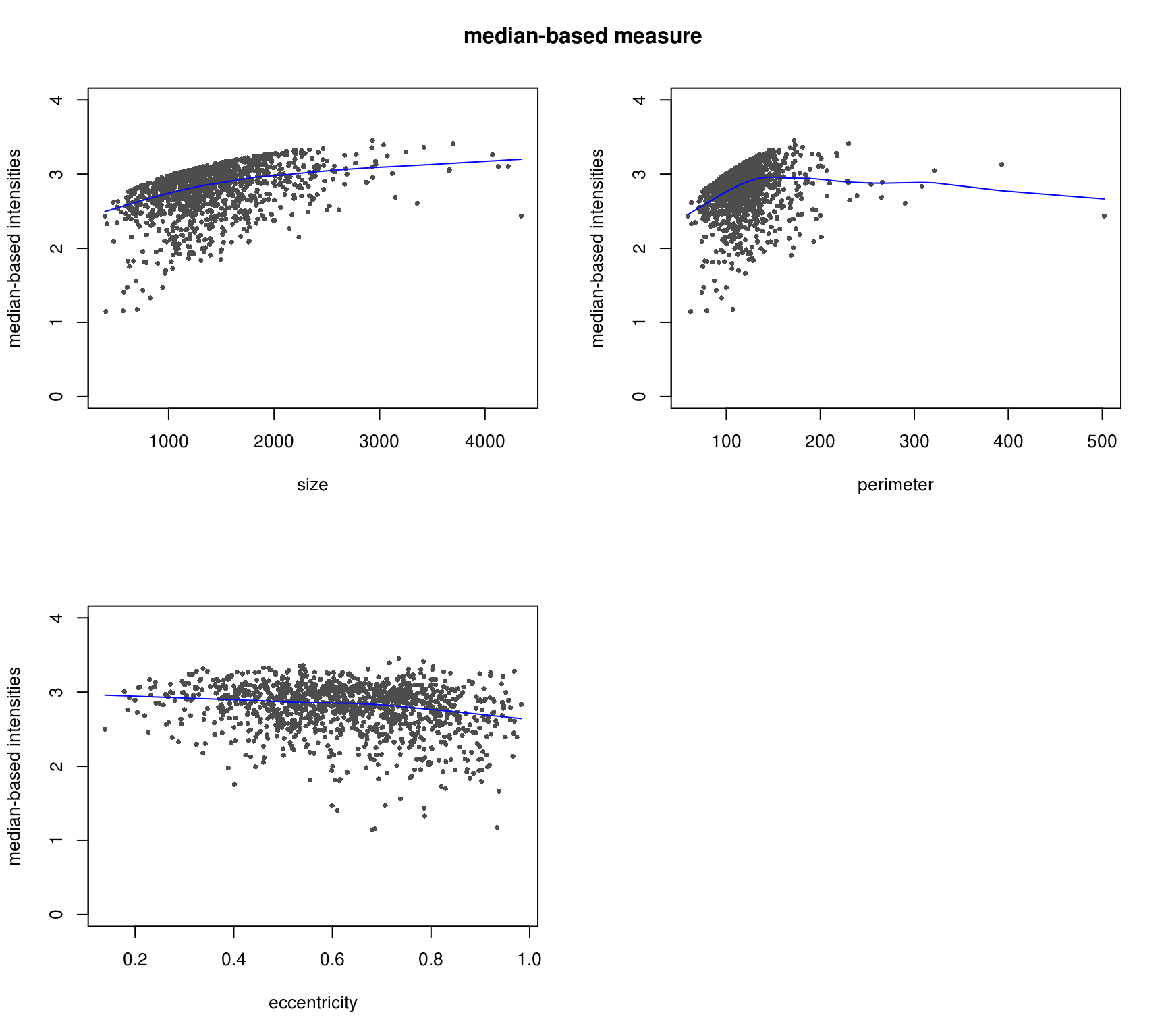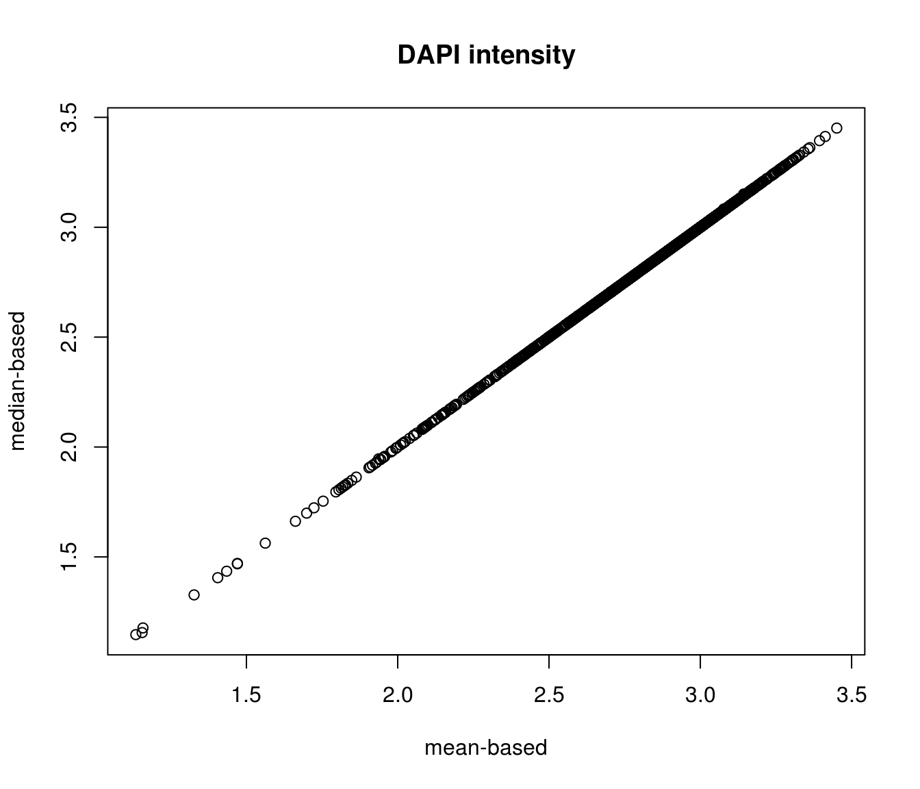 DAPI median-based measures (background median corrected) correlate better with cell shape measures - the patterns make more sense. Notatbly higher correlation between median-based measures and cell shape measures compared to mean-based measures.