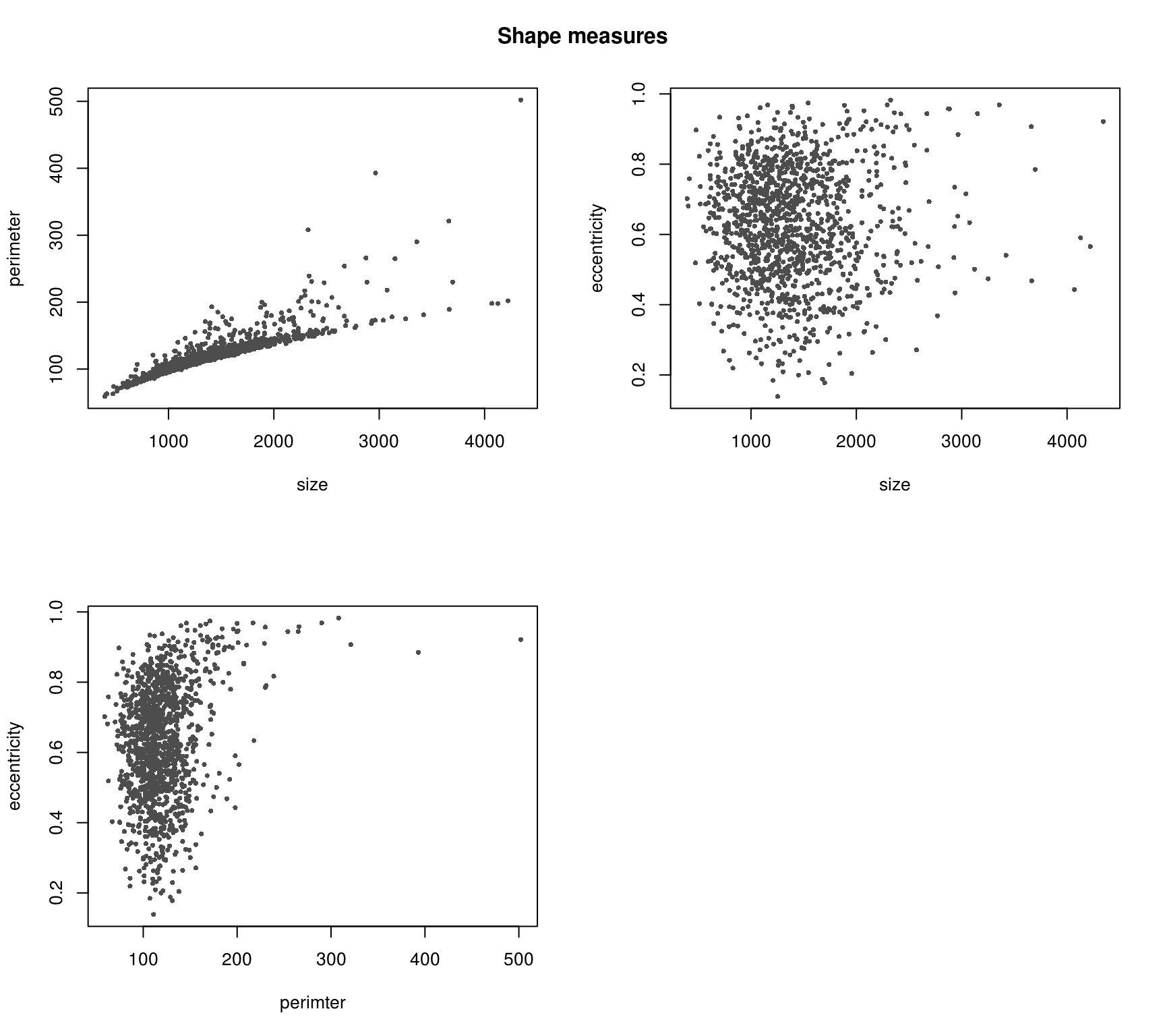 Nucleus size is not correlated with eccentricty and neither is perimeter as expected.