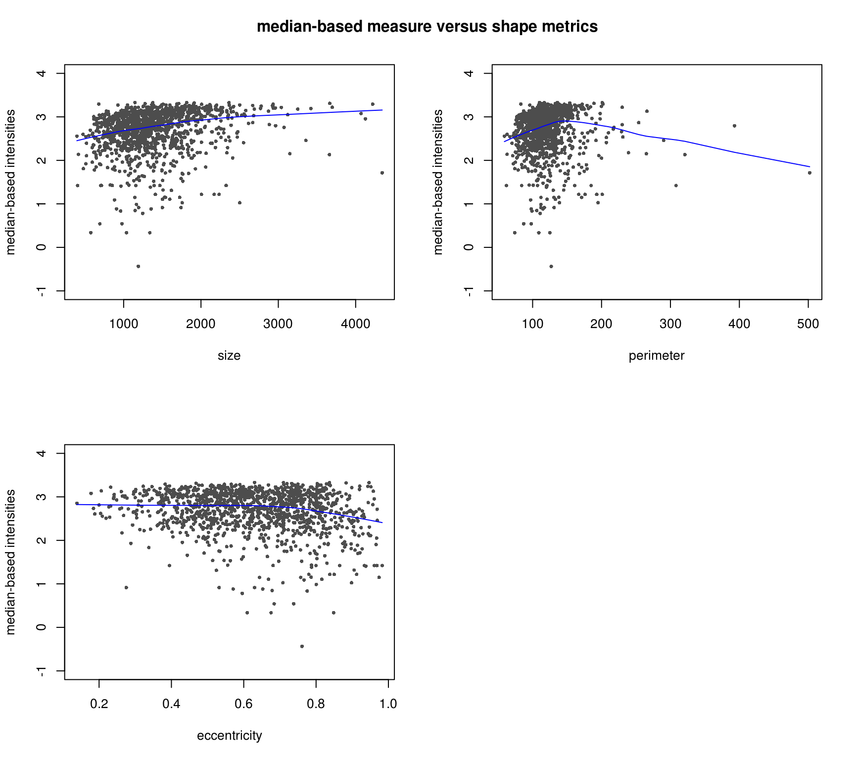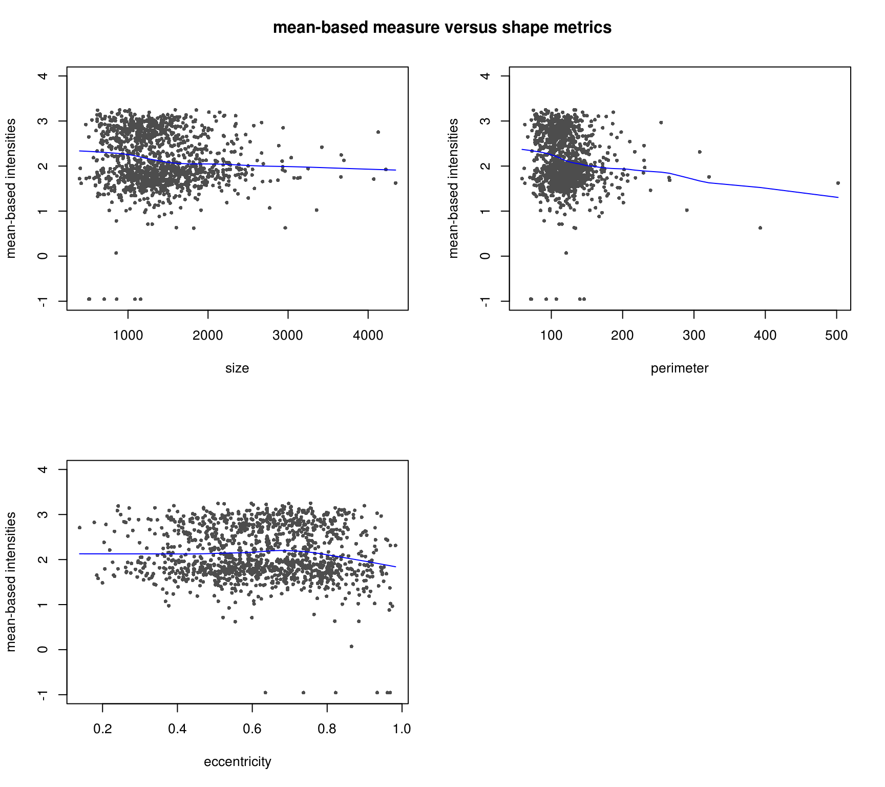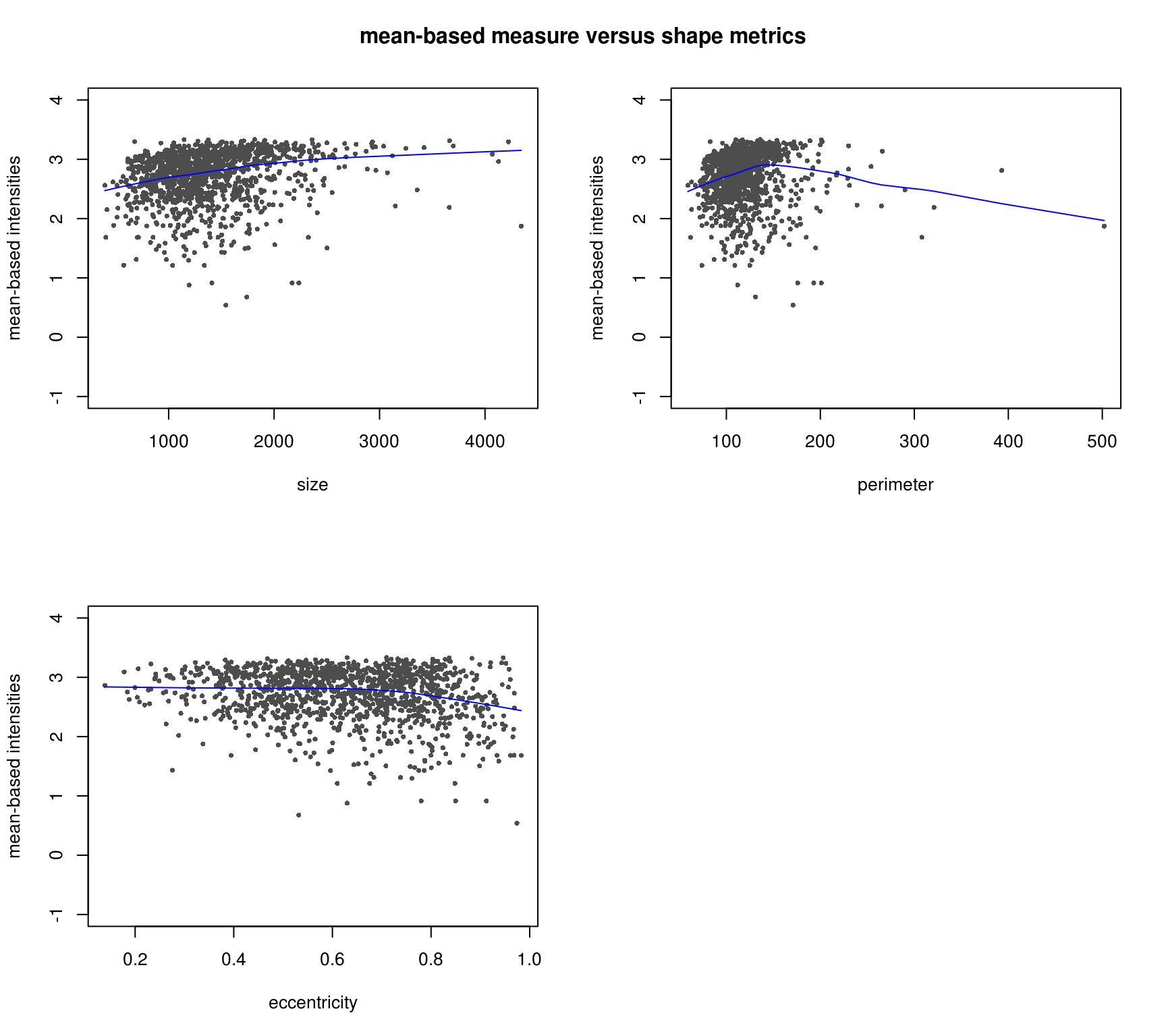 Consider the two intensity channels RFP and GFP. It seems that the GFP intensities are somehow correlated with the nucleus size, but the RFP does not correlate with these cell shape measures at all.