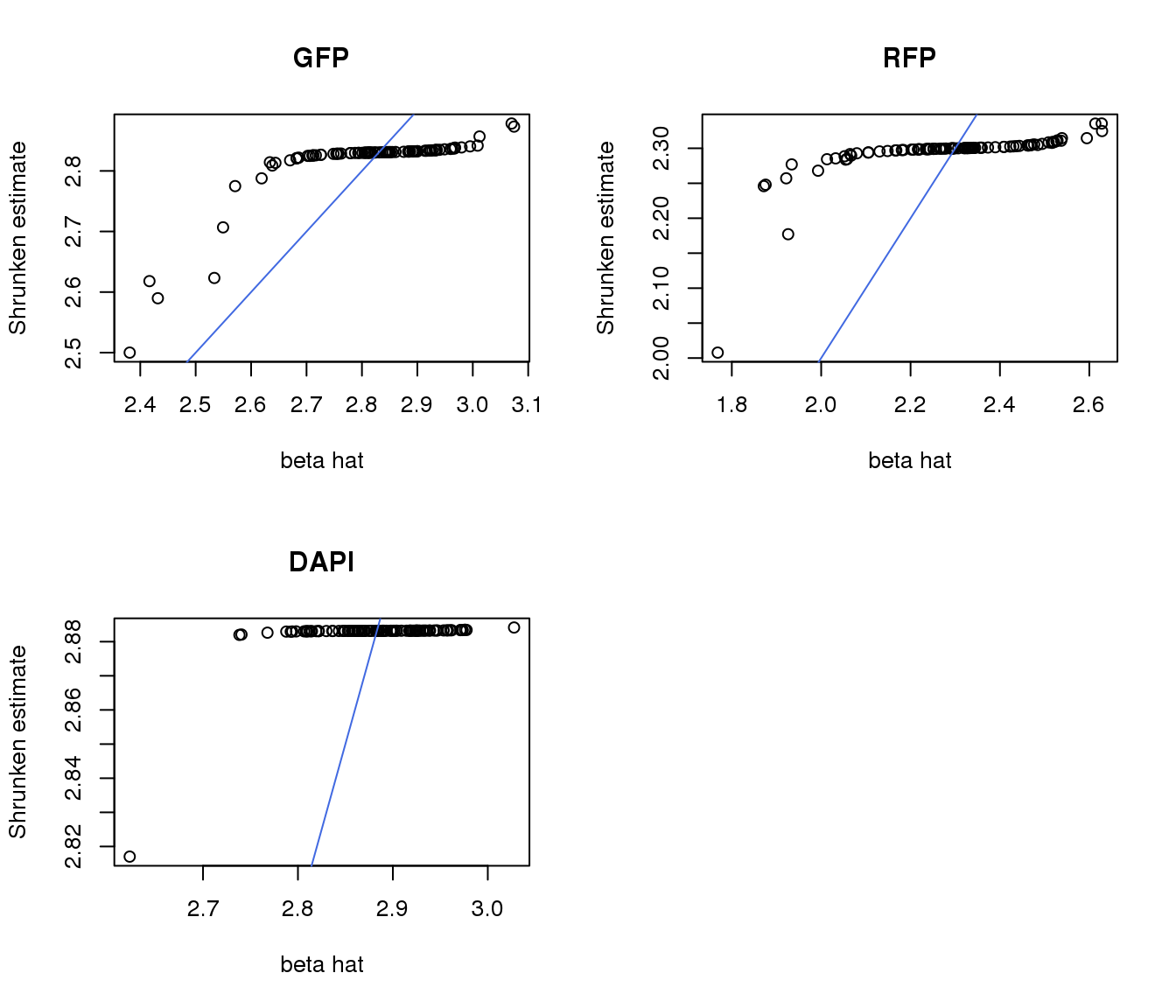 xlab = "beta hat", ylab = "Shrunken estimate", main = "DAPI")