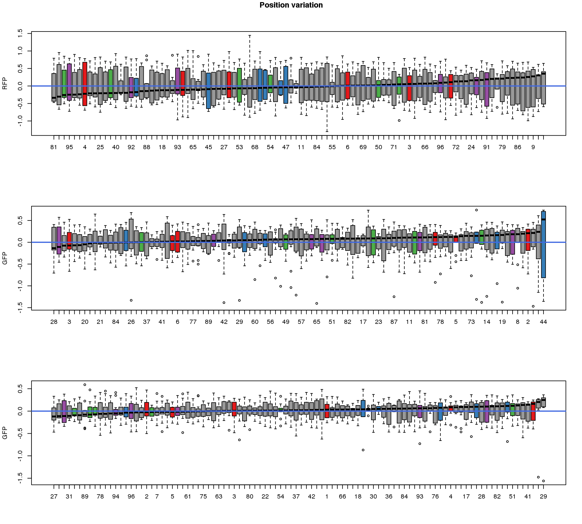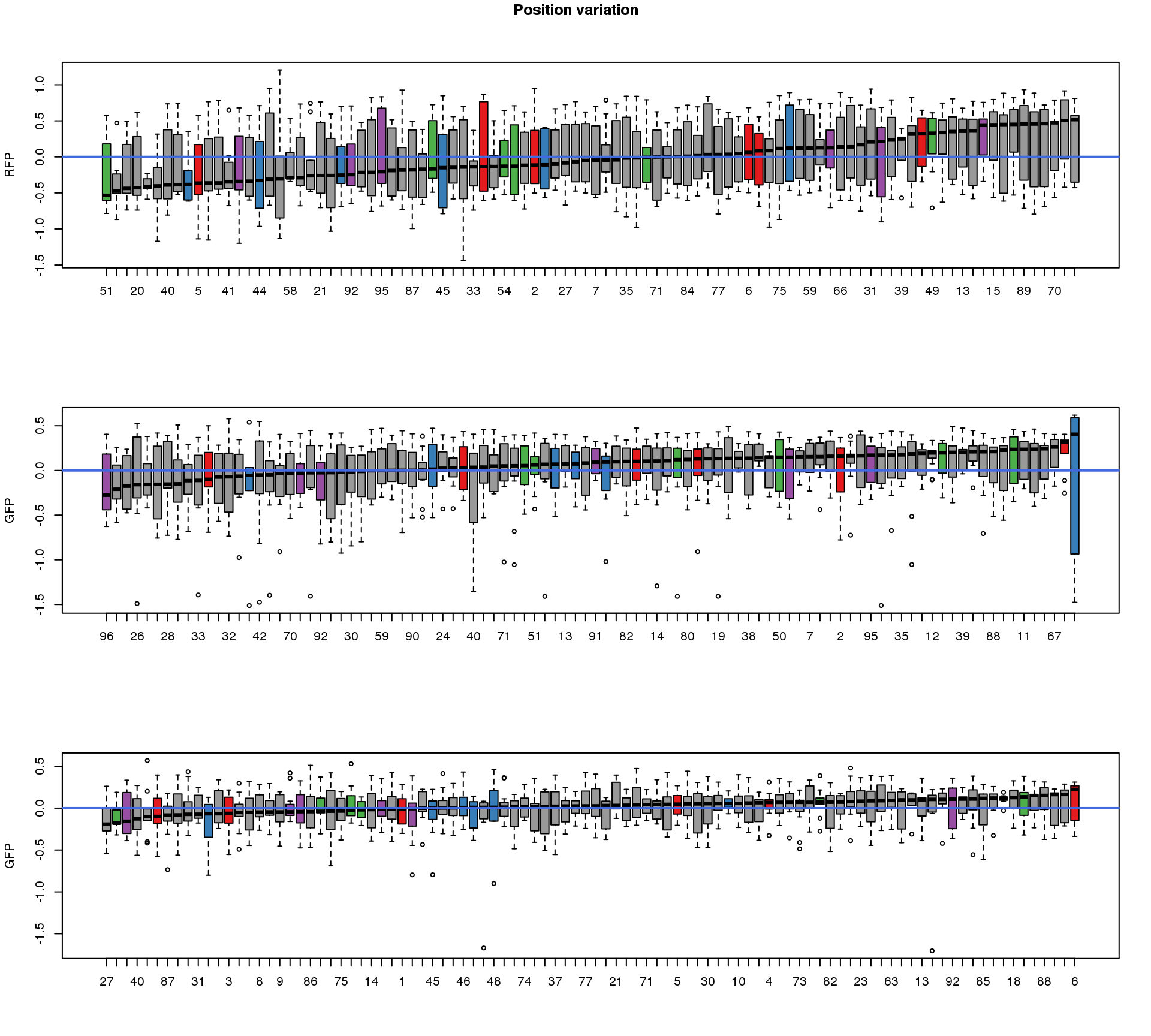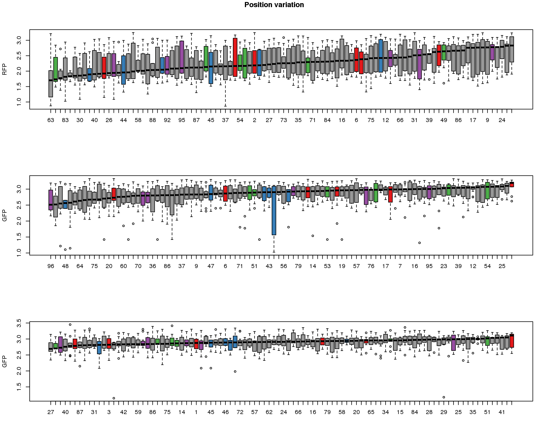 Statistical tests show that for GFP, there’s significant individual effect, plate effect and position effect, and that for RFP and DAPI, there’s no signficant individual effect or position effect but there’s significant plate effect (all at P<.01).
