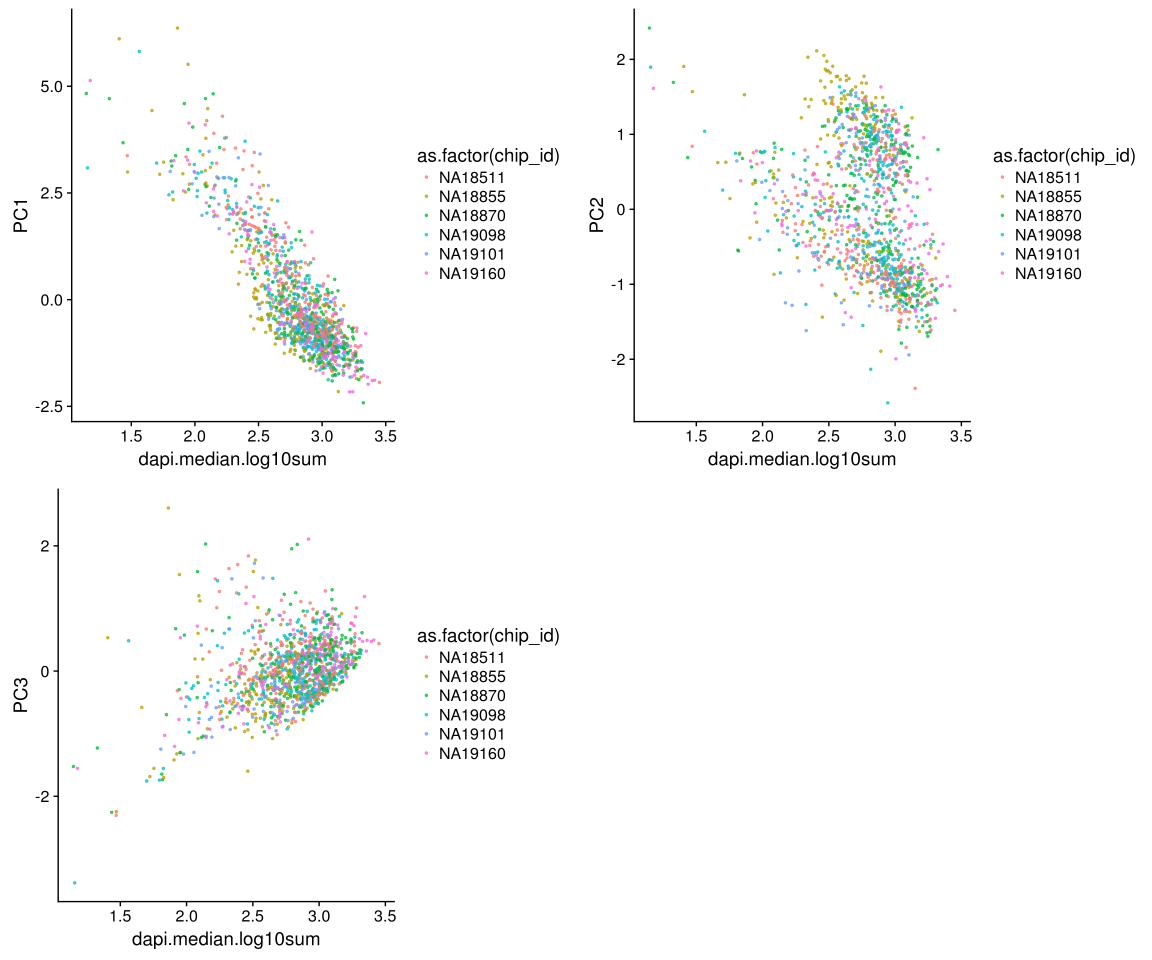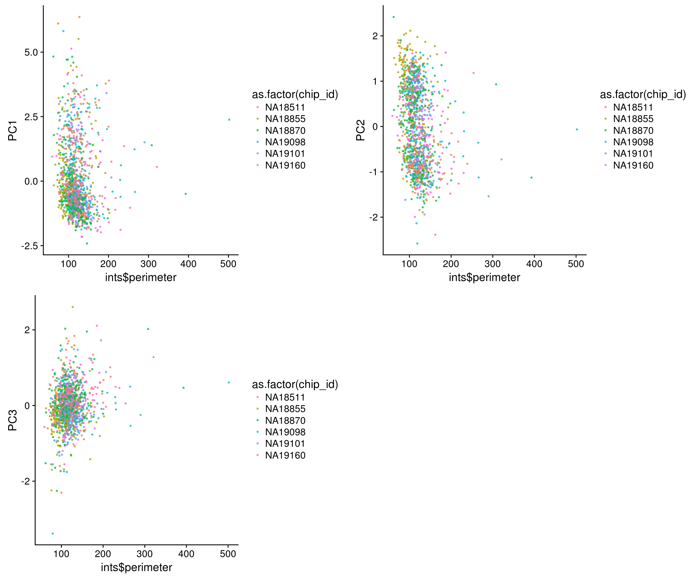 Trying out PCA: The first PC explains 63% of variation in the data, and the second PC explains 27% of variation in the data. First PC correlated with RFP, GFP and DAPI and also correlated with nucleus size. The direction of correlation is the same for size and intensity metrics. Also, first PC is not correlated with batch, individual labels, perimeter or eccentricity.