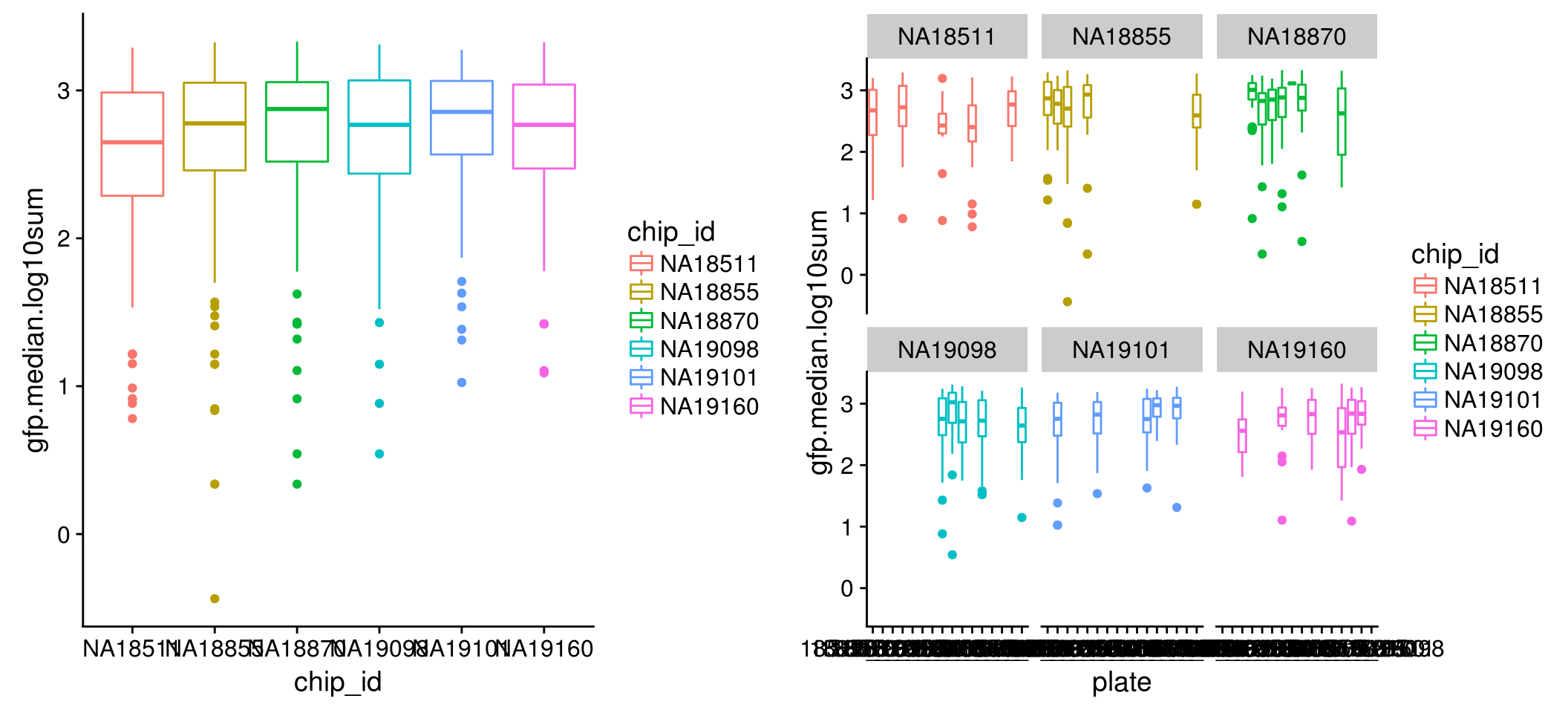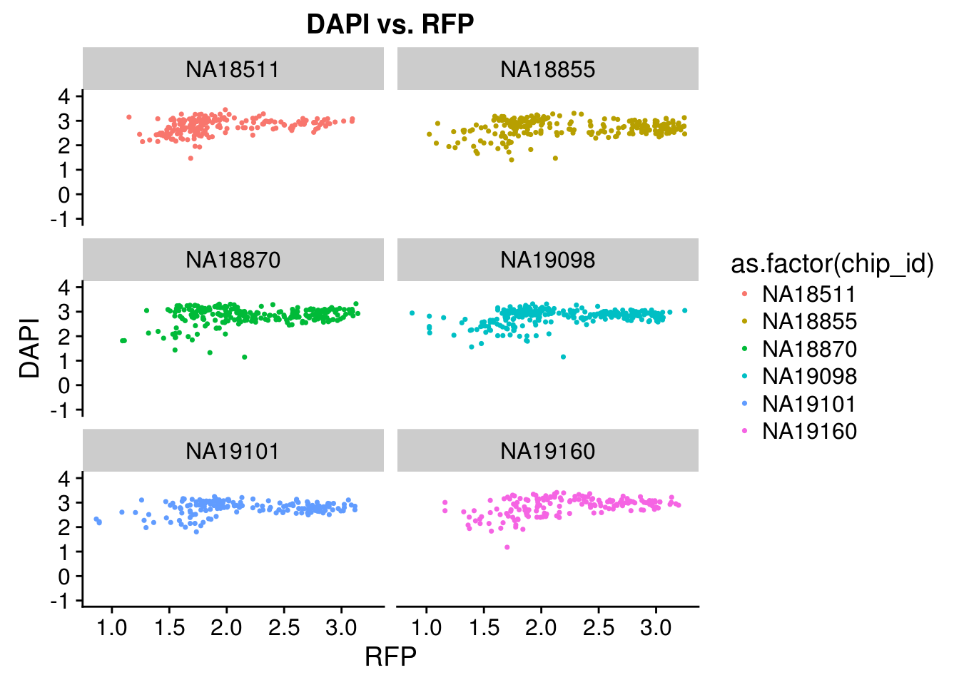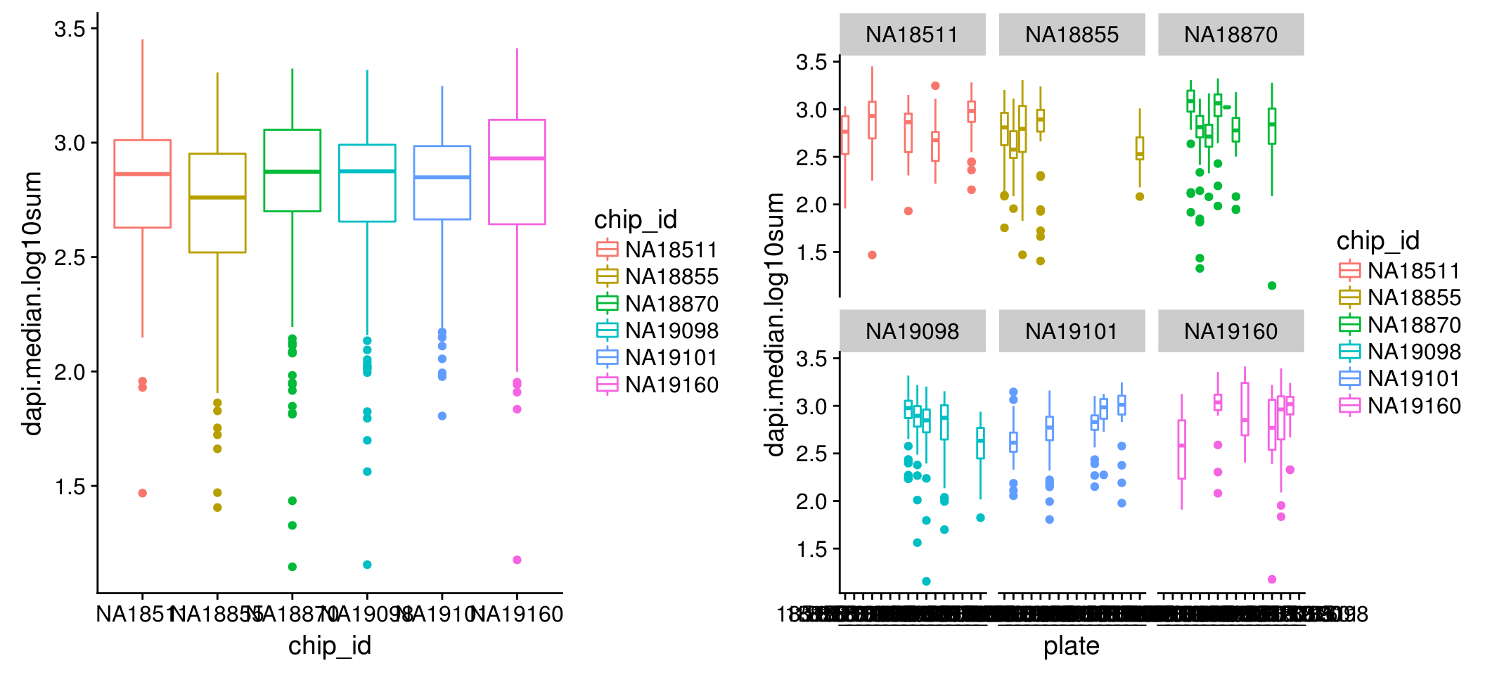 Intensity distribution within each individual: for all three channels, we observe variation between single cell samples from the six individuals in both mean and variance; further, within each individual, the differences between single cell samples from different plates are dramatic, in both mean and variance.