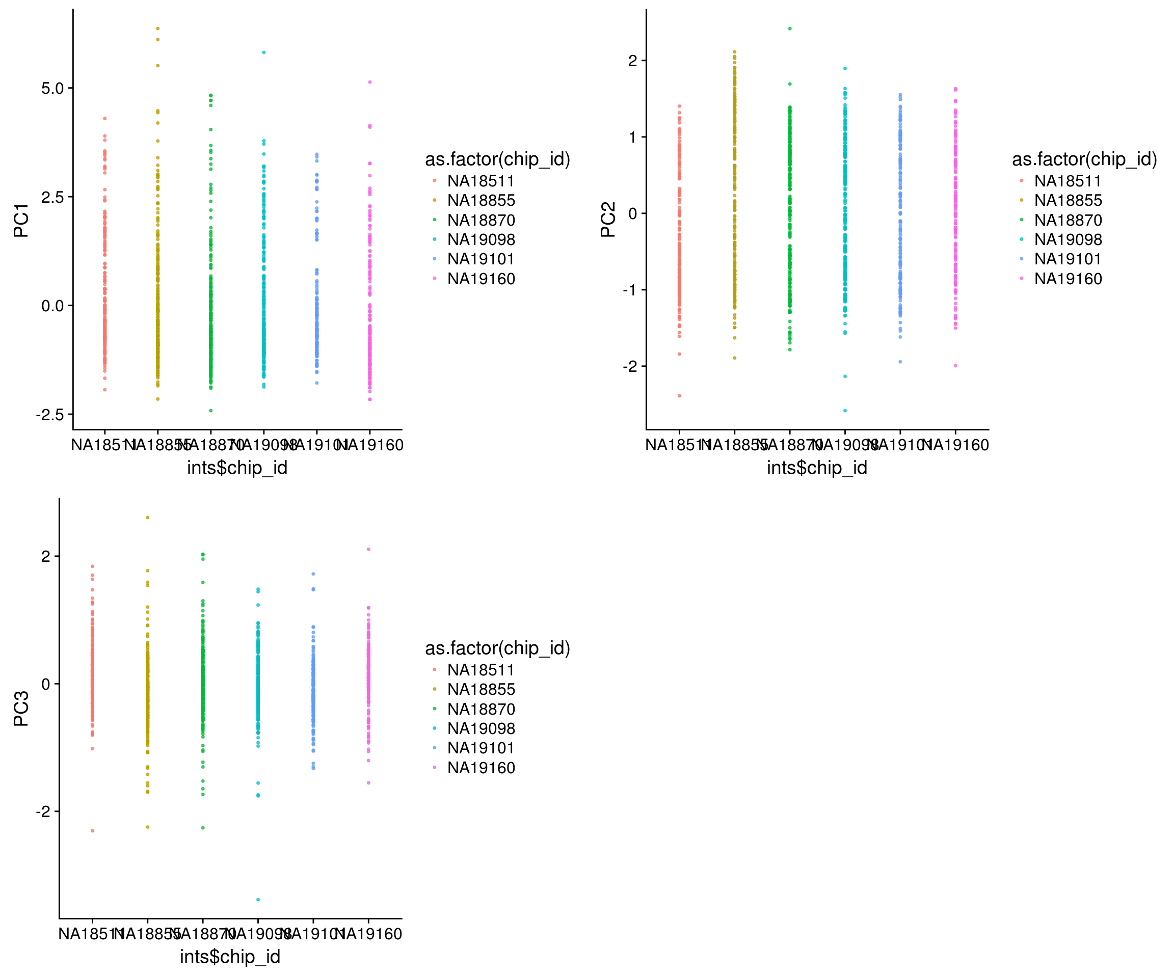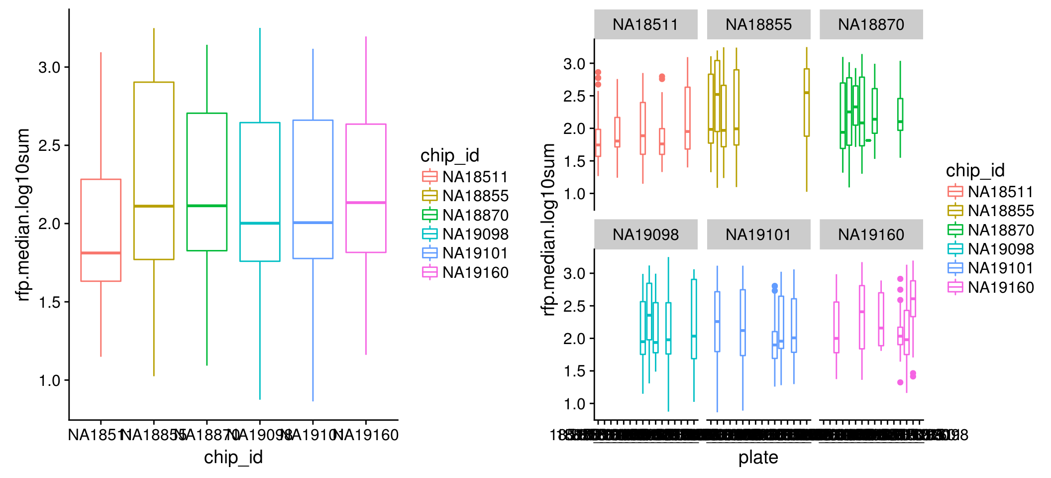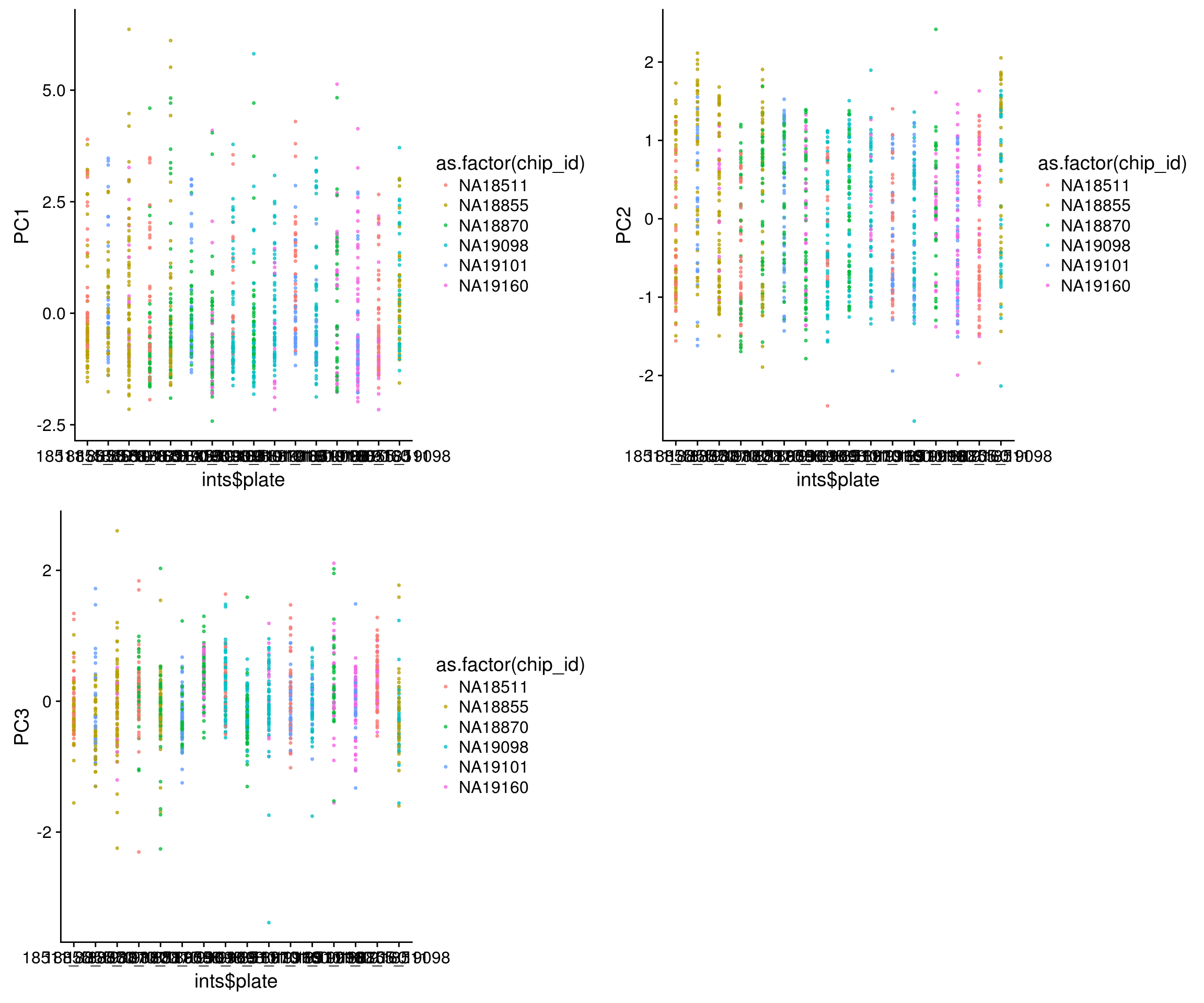 Intensity distribution within each individual: for all three channels, we observe variation between single cell samples from the six individuals in both mean and variance; further, within each individual, the differences between single cell samples from different plates are dramatic, in both mean and variance.