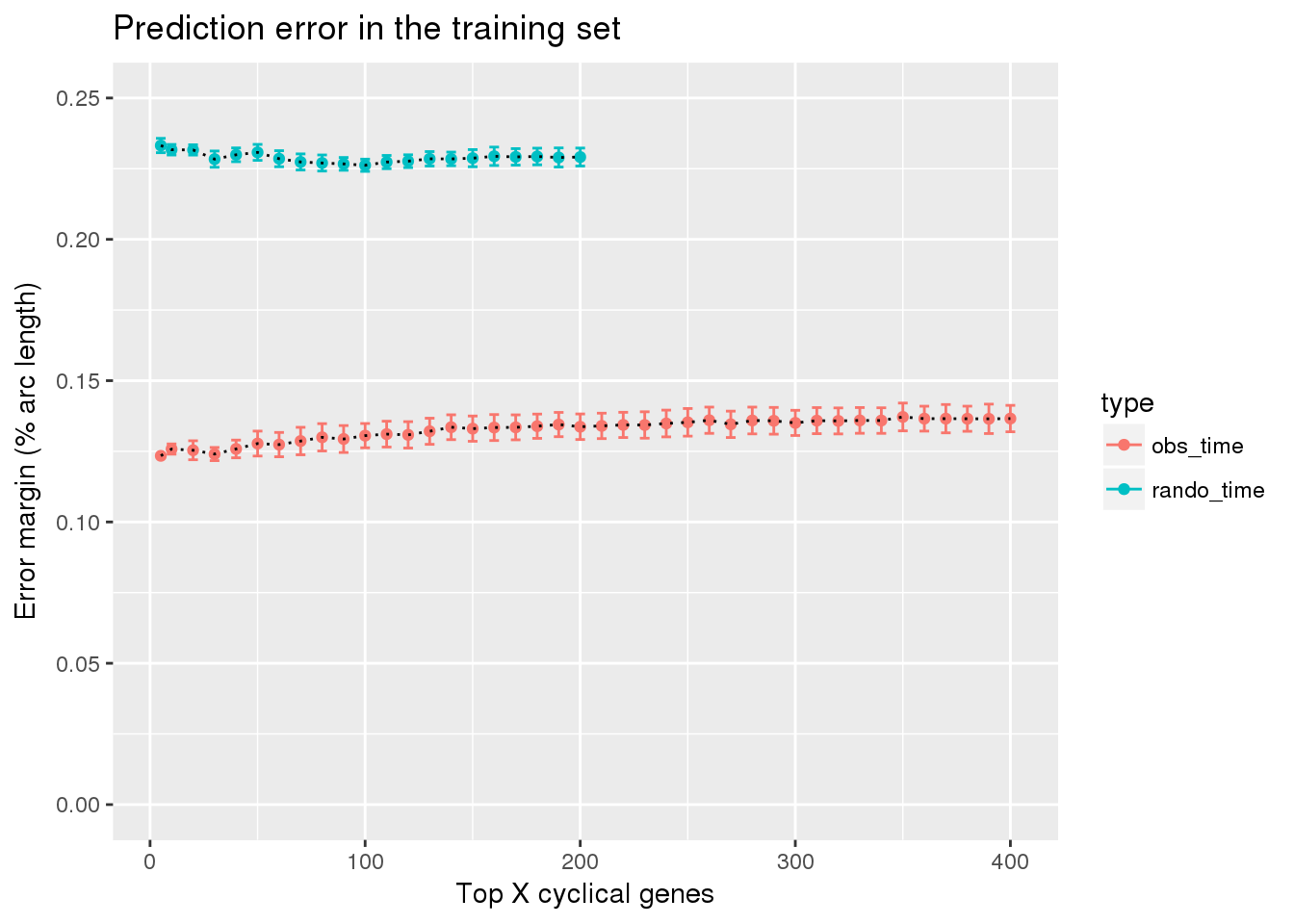 About the prediction error margin under the null or when predicting random cells, I permuted the cell labels in the training samples. Then, in each training set, I use cyclical gene expression patterns learned from the fucci time to predict the random cell time labels. The margin of error at randomis about 25%, that is, 50% of the half arc length. In our analysis, I found it to be slower lower than 25%; an possible explanation is that before computing the prediction margin, we shift and flip the estimated cell time so that the prediction margin is minimized.