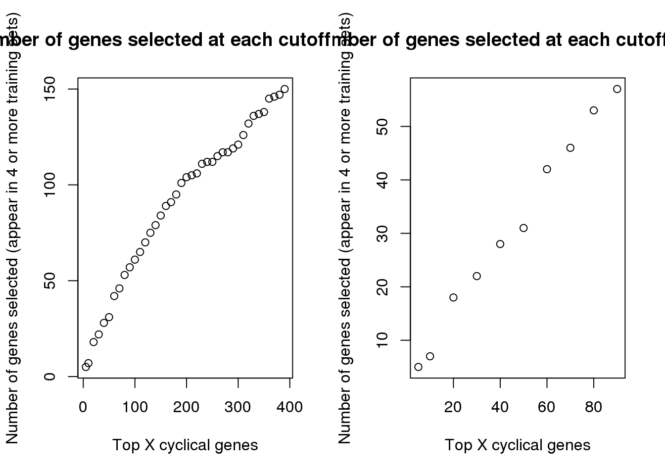 Choose across the 5 folds (training sets), the genes that appear among the top X cyclical genes in at least 4 training sets.