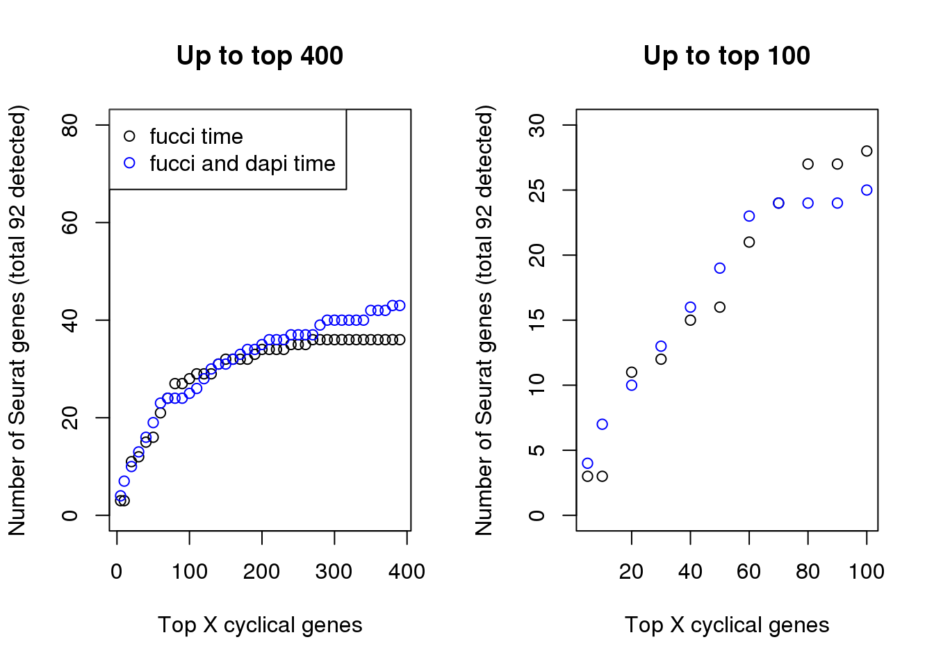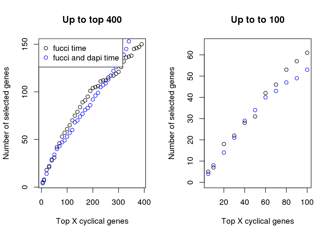 Examine number of genes selected at top X cut-offs: Across cut-offs, more selected when cyclical trend is based on fucci time instead of fucci + dapi time.