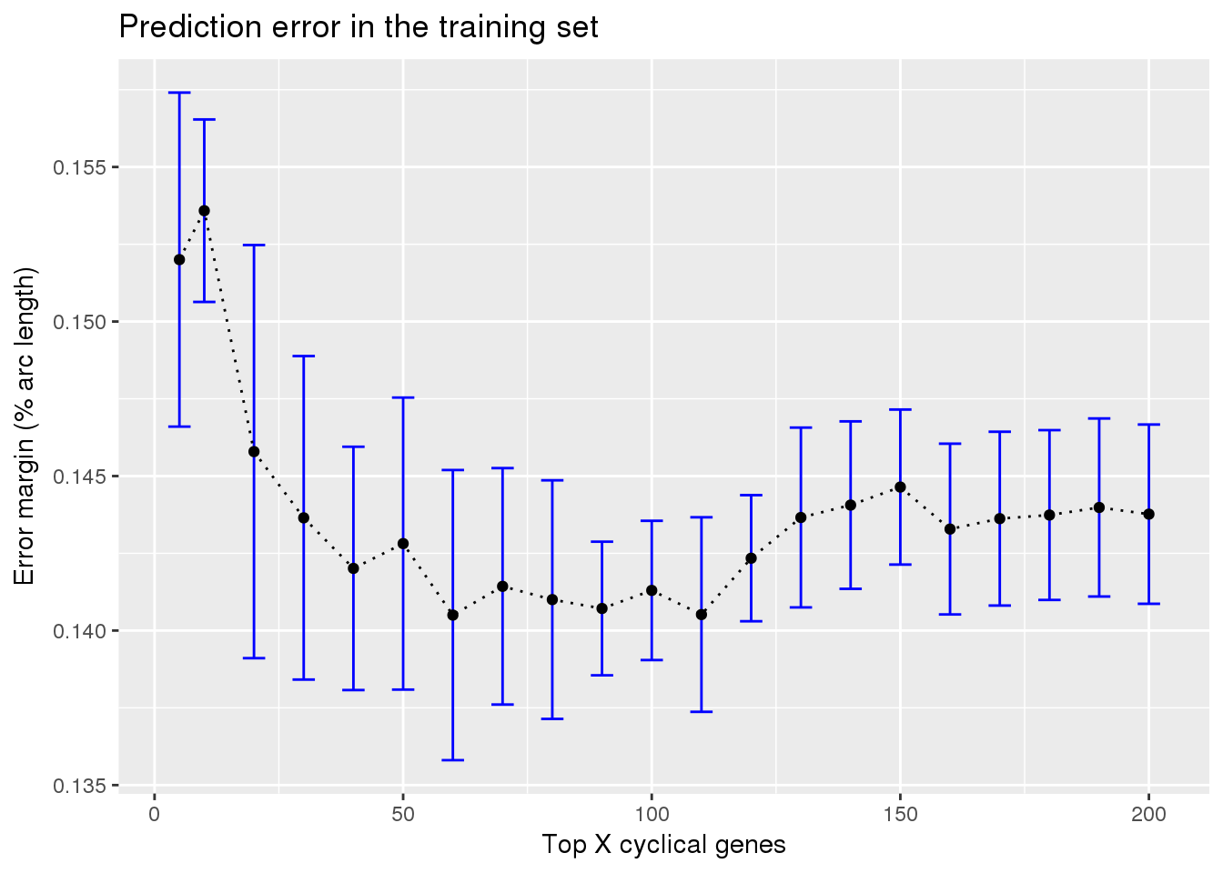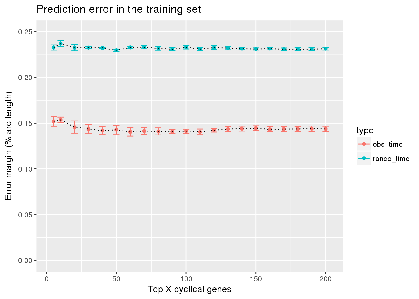 ylab("Error margin (% arc length)") + xlab("Top X cyclical genes") +