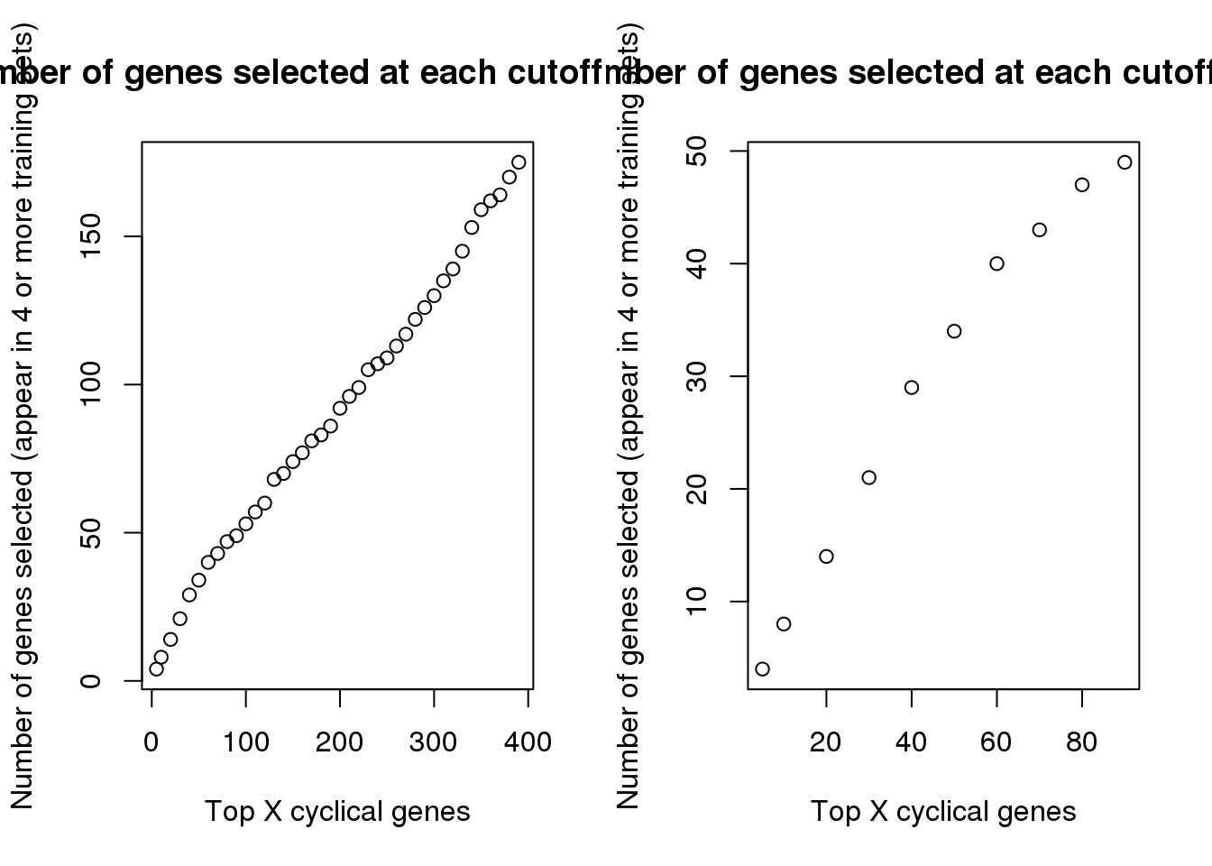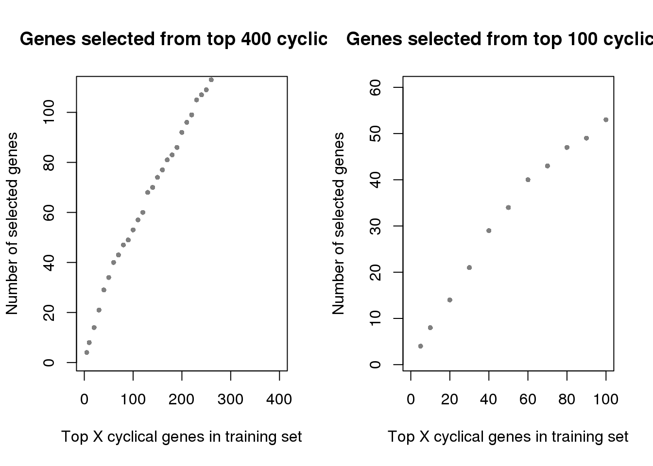 xlab="Top X cyclical genes in training set",
