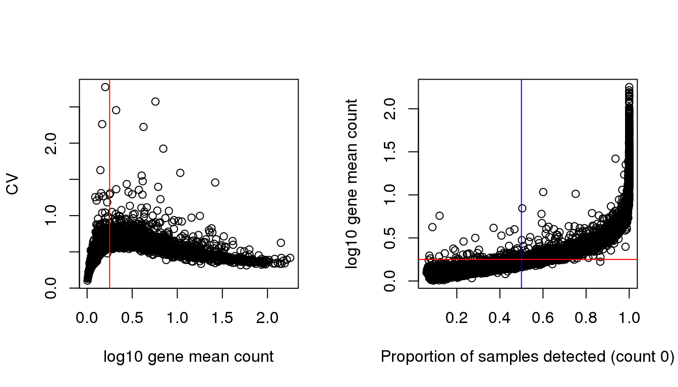 I arbitrary decided on a cutoff for gene mean based on the relationship between CV and log10 gene count. The idea was to filter the genes among which dispersion increases with gene mean (approximately when detection rate 50% or lower).