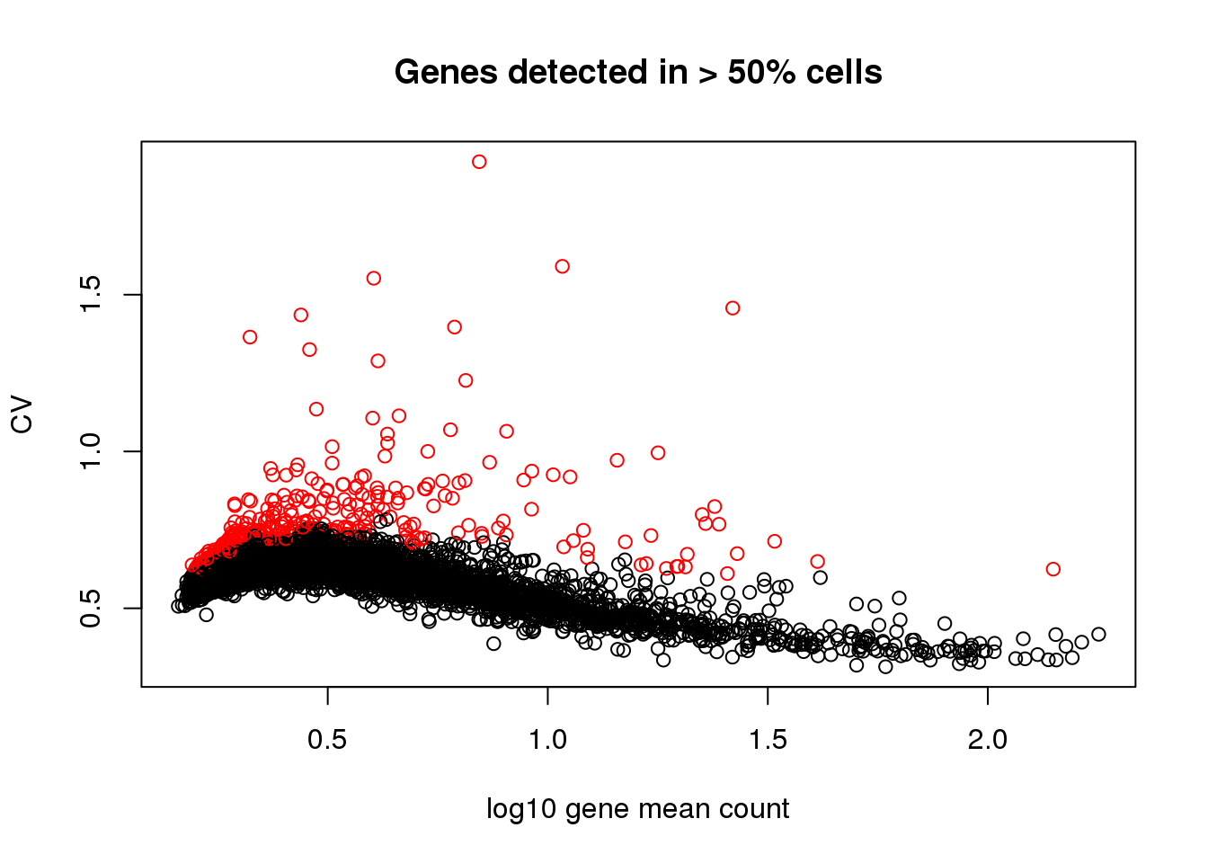 ylab = "CV", main = "Genes detected in > 50% cells",