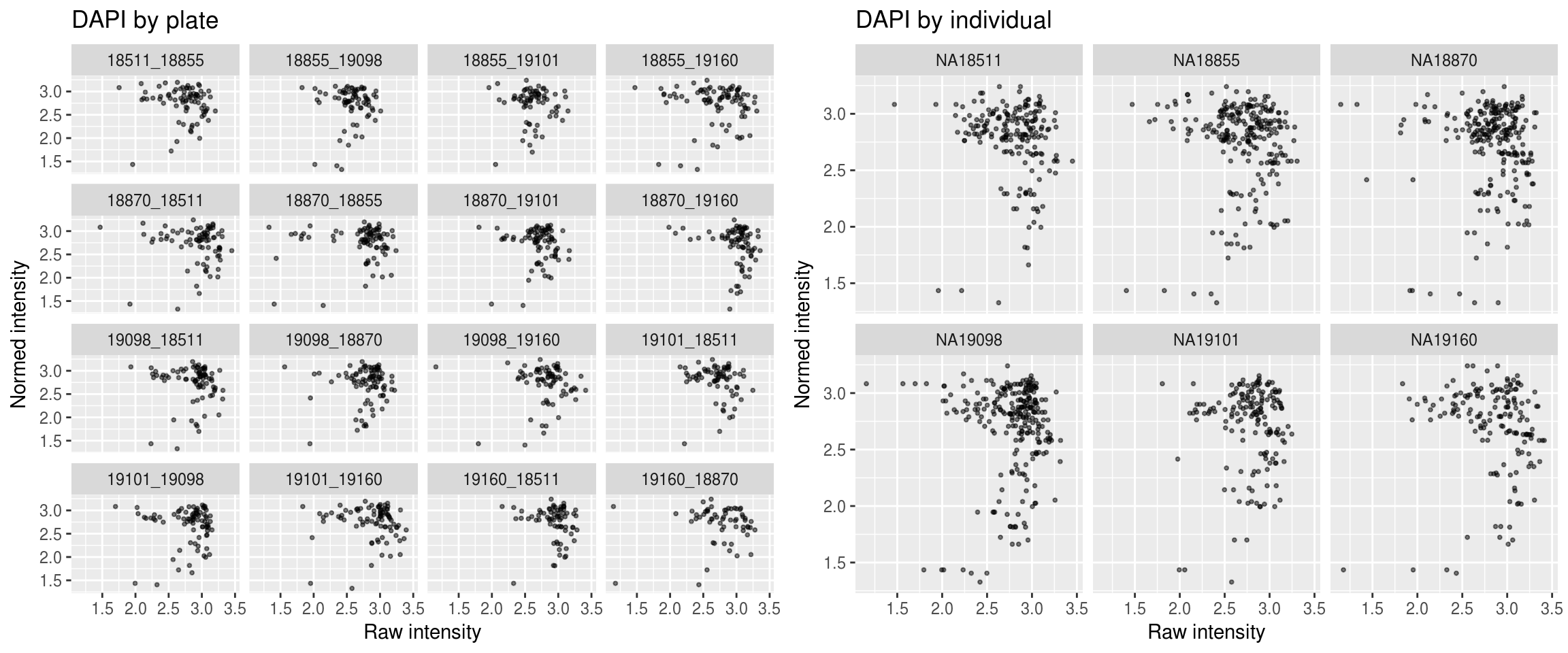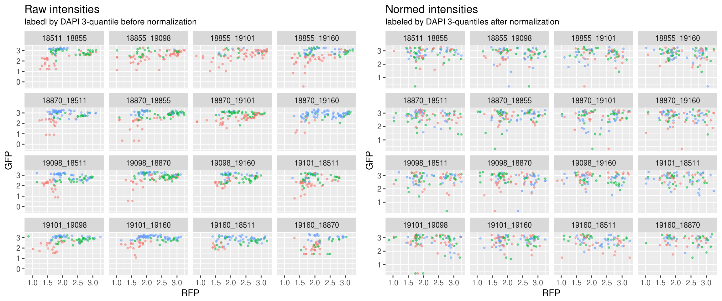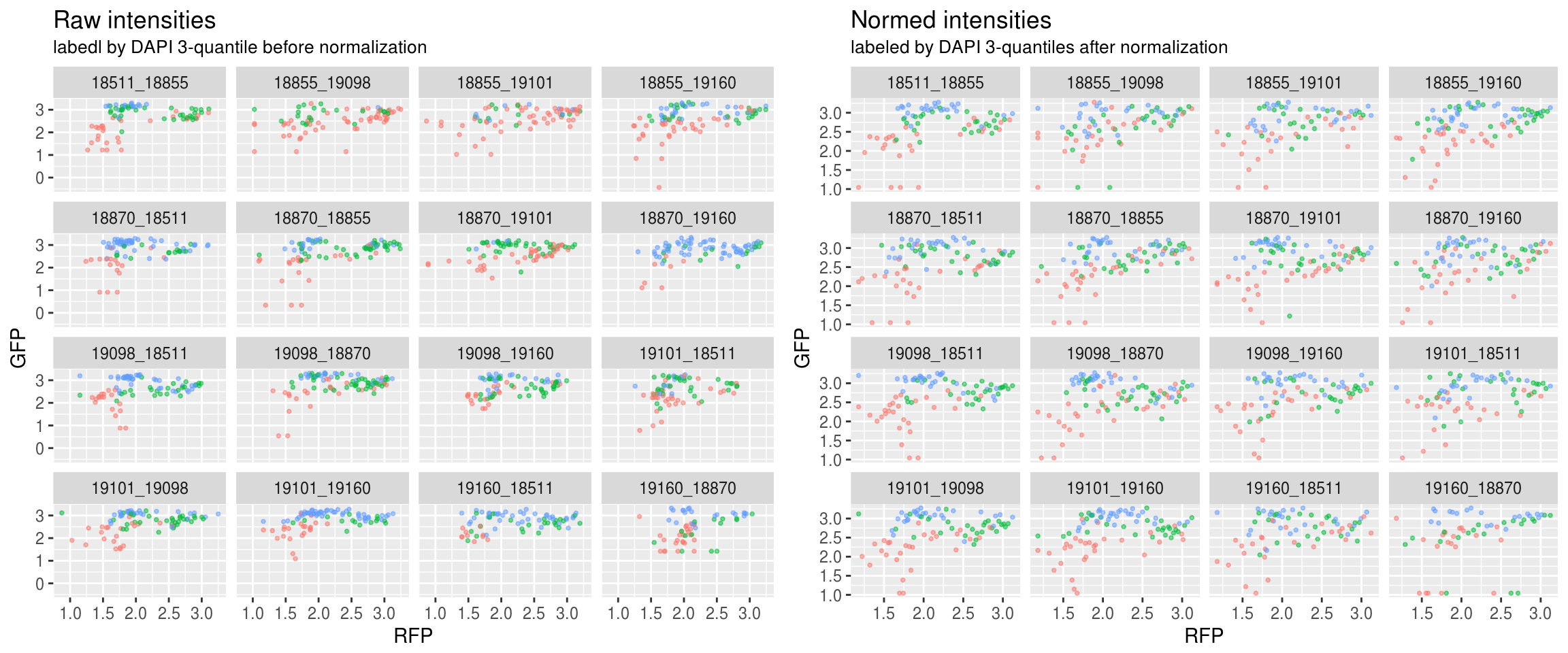 Green versus Red intensties by plate, labeled by DAPI