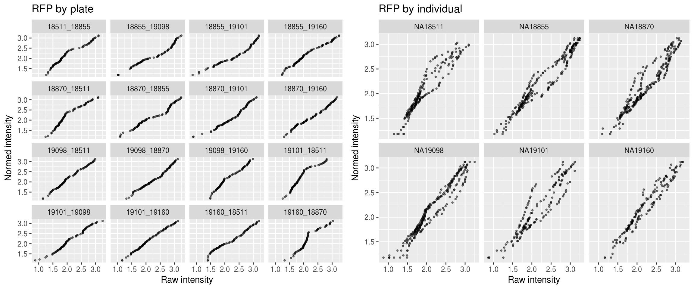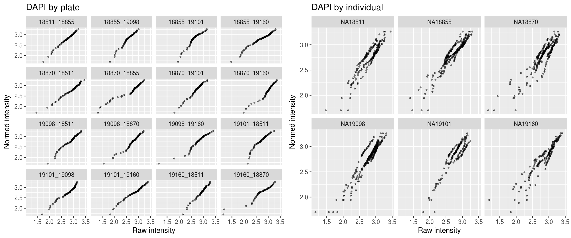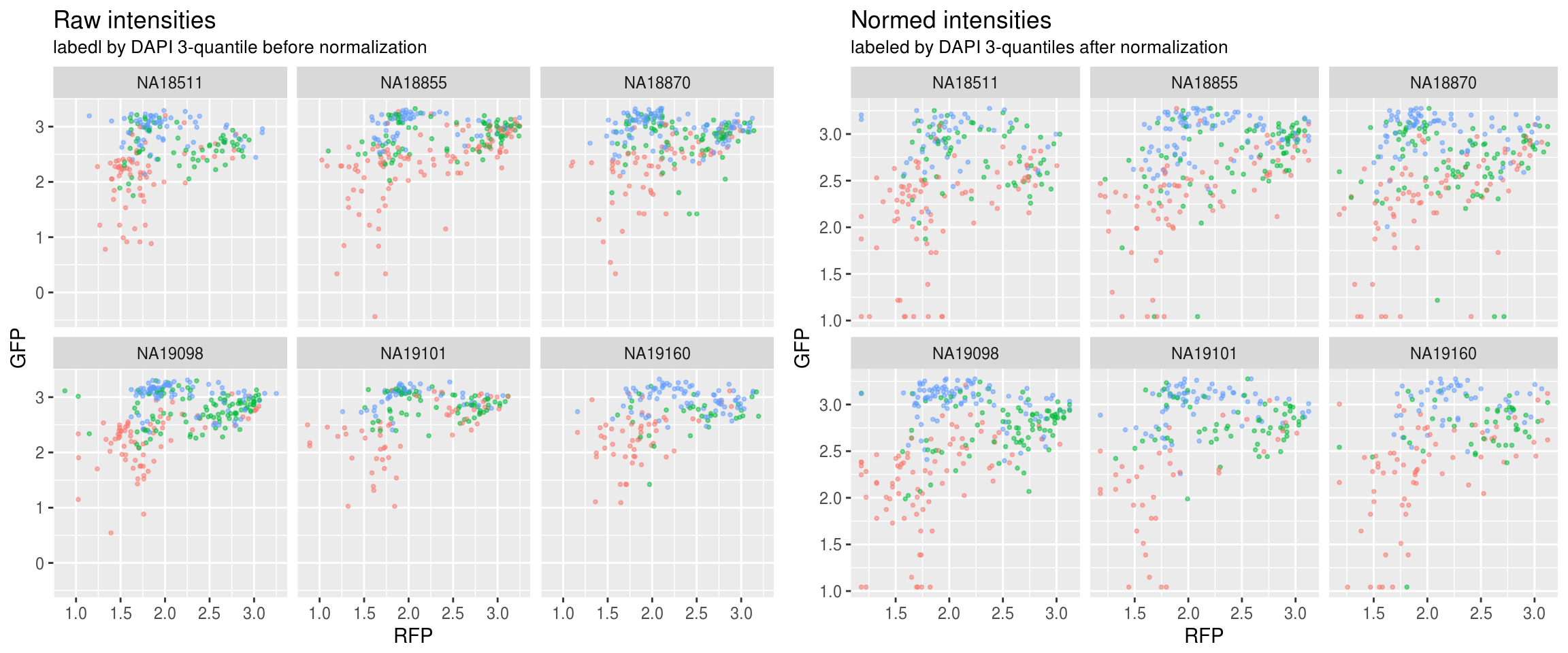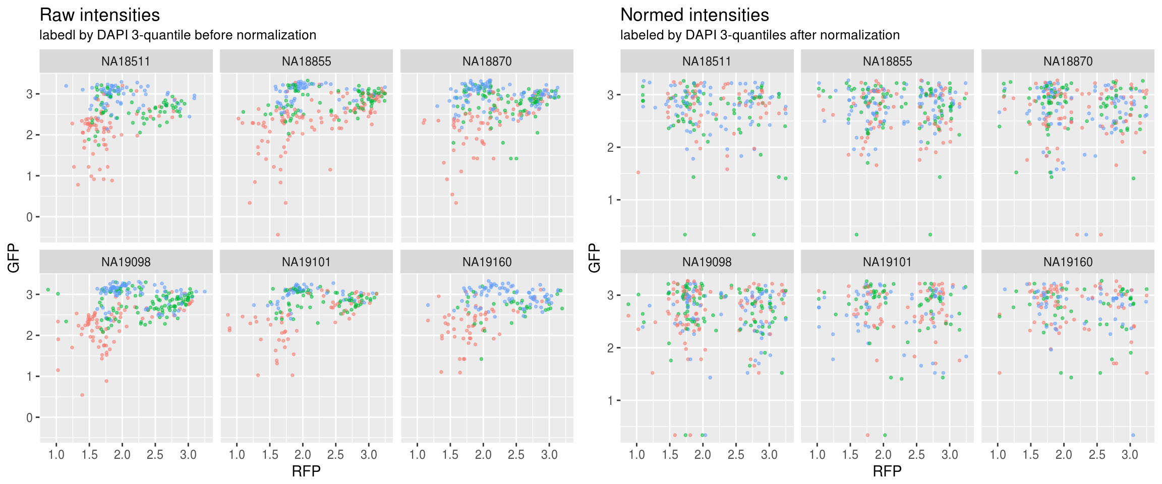 In this document, I apply quantile normalization to intensity measurements on a per-channel basis. The approach is as follows