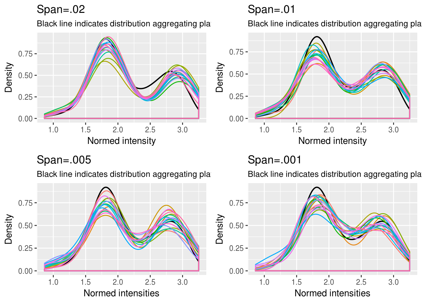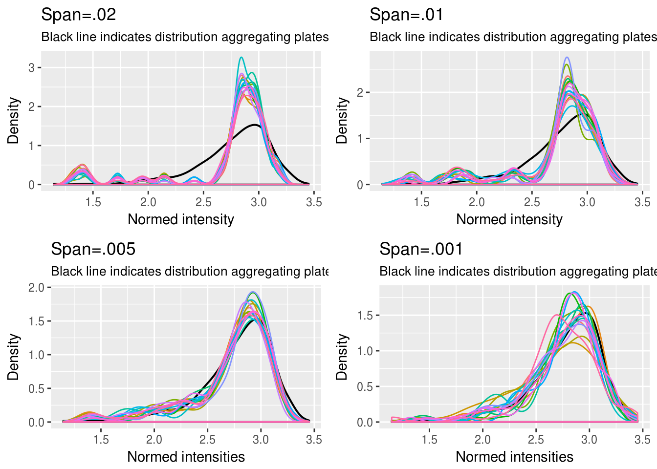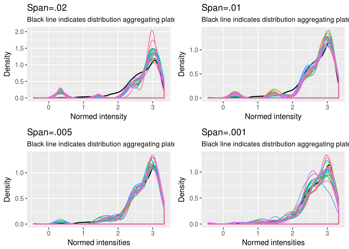 For each plate \(i\), estimate \(l\)-quantiles of intensities on a per-plate basis \(Q^{i,l}= \big( {q^{i,l}_{[1]}, \dots, q^{i,l}_{[n_l]}} \big)\).