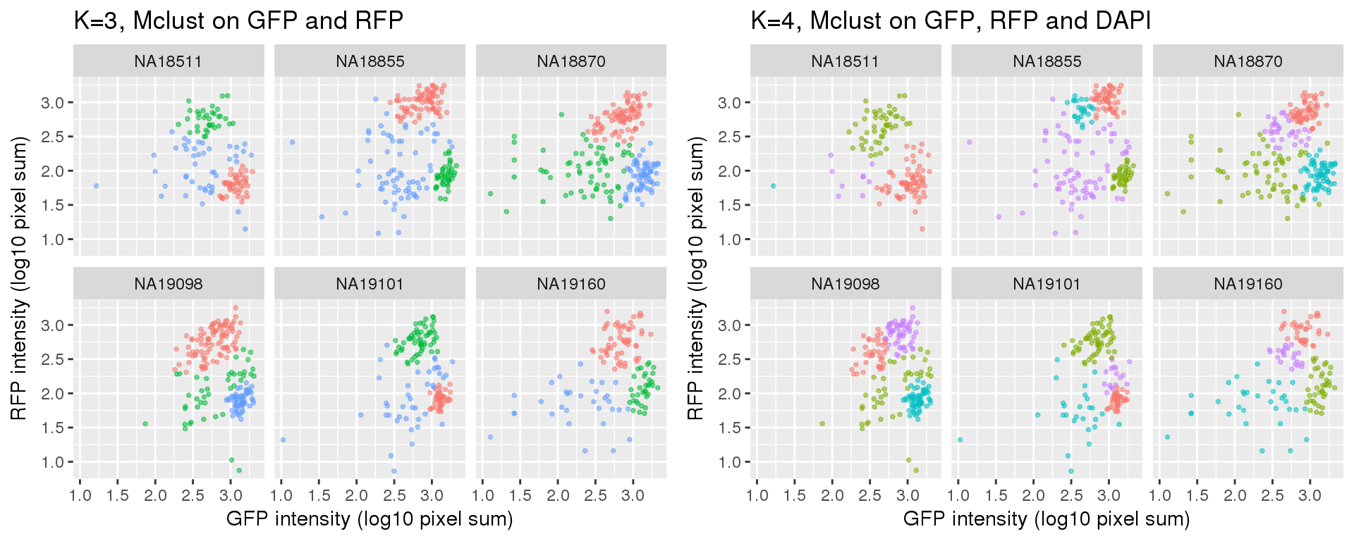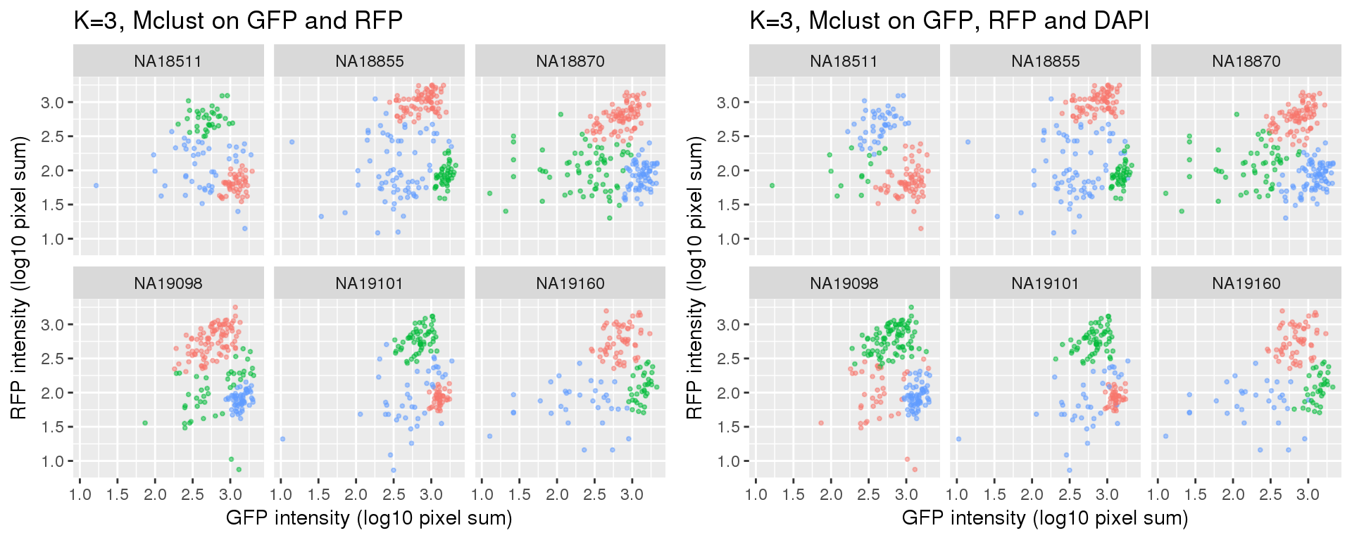 Fitting mclust for cells using only green and red intensity measurements.