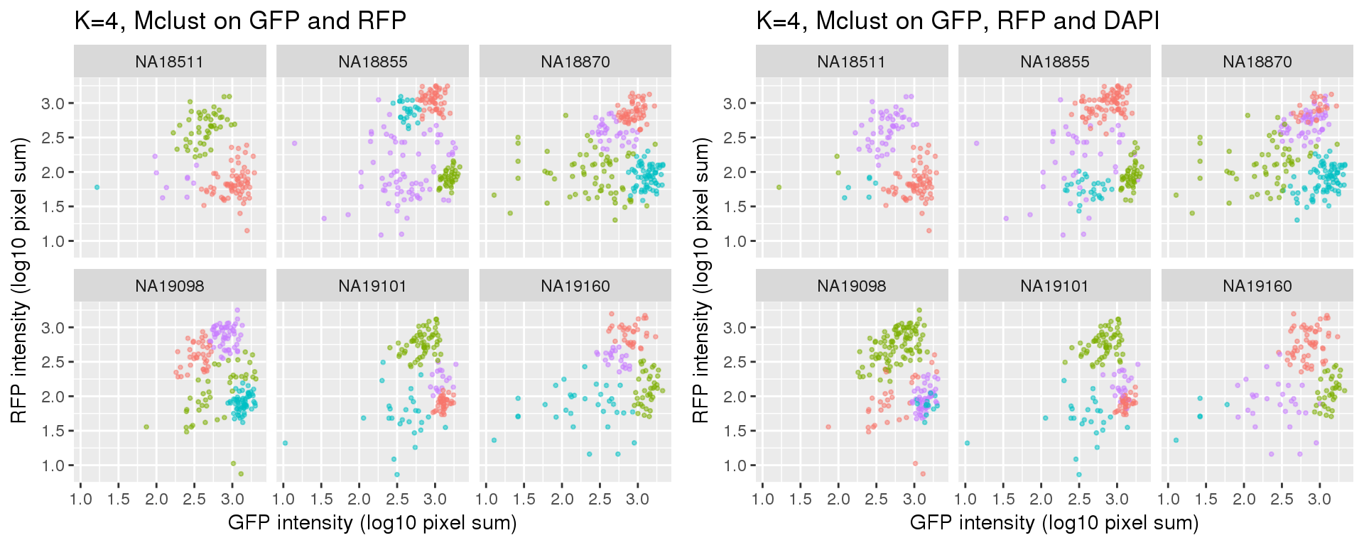 Standard flow cytometry analysis using GFP and RFP can classify cells into G1, G1/S, and G2/M. We fit k=3 and k=4 using PAM on GFP and RFP and also on GFP, RFP, and DAPI.