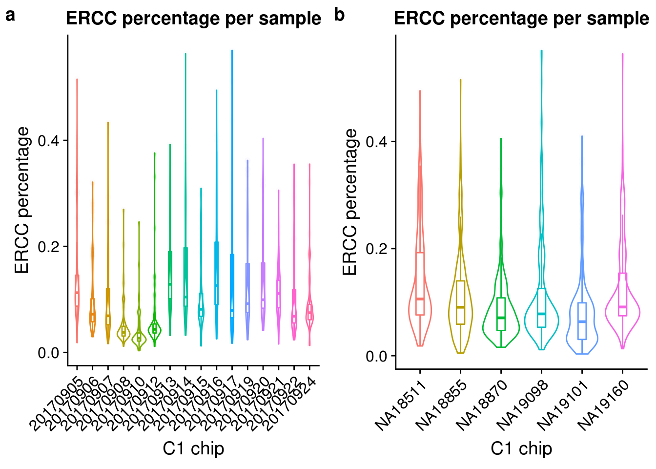 Look at the ERCC spike-in percentage per sample by C1 experimnet and by individual.