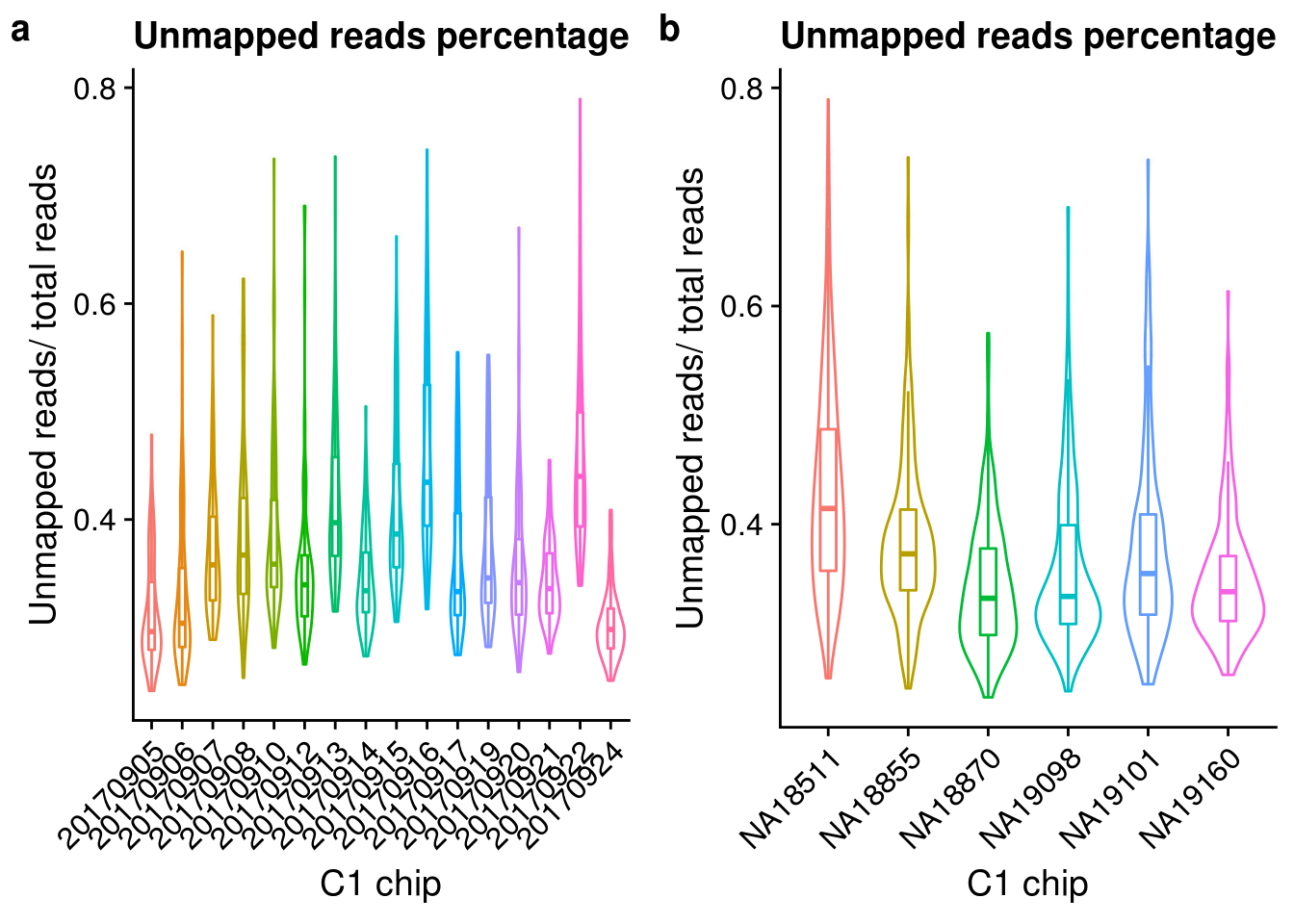 Look at the unmapped percentage per sample by C1 experimnet and by individual.