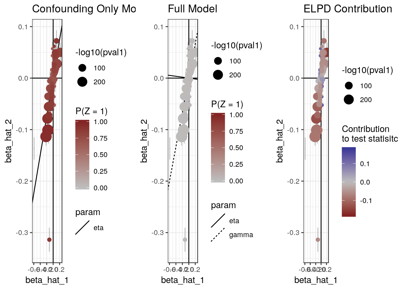 The plot method can also produce scatter plots of the data showing for each model, the probability that each variant is acting through the confounder and the contribution of each variant to the ELPD test statistic.