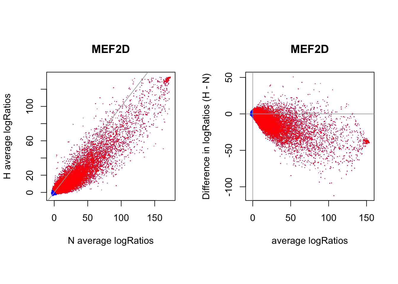xlab = "average logRatios", ylab = "Difference in logRatios (H - N)", main = tf_name,