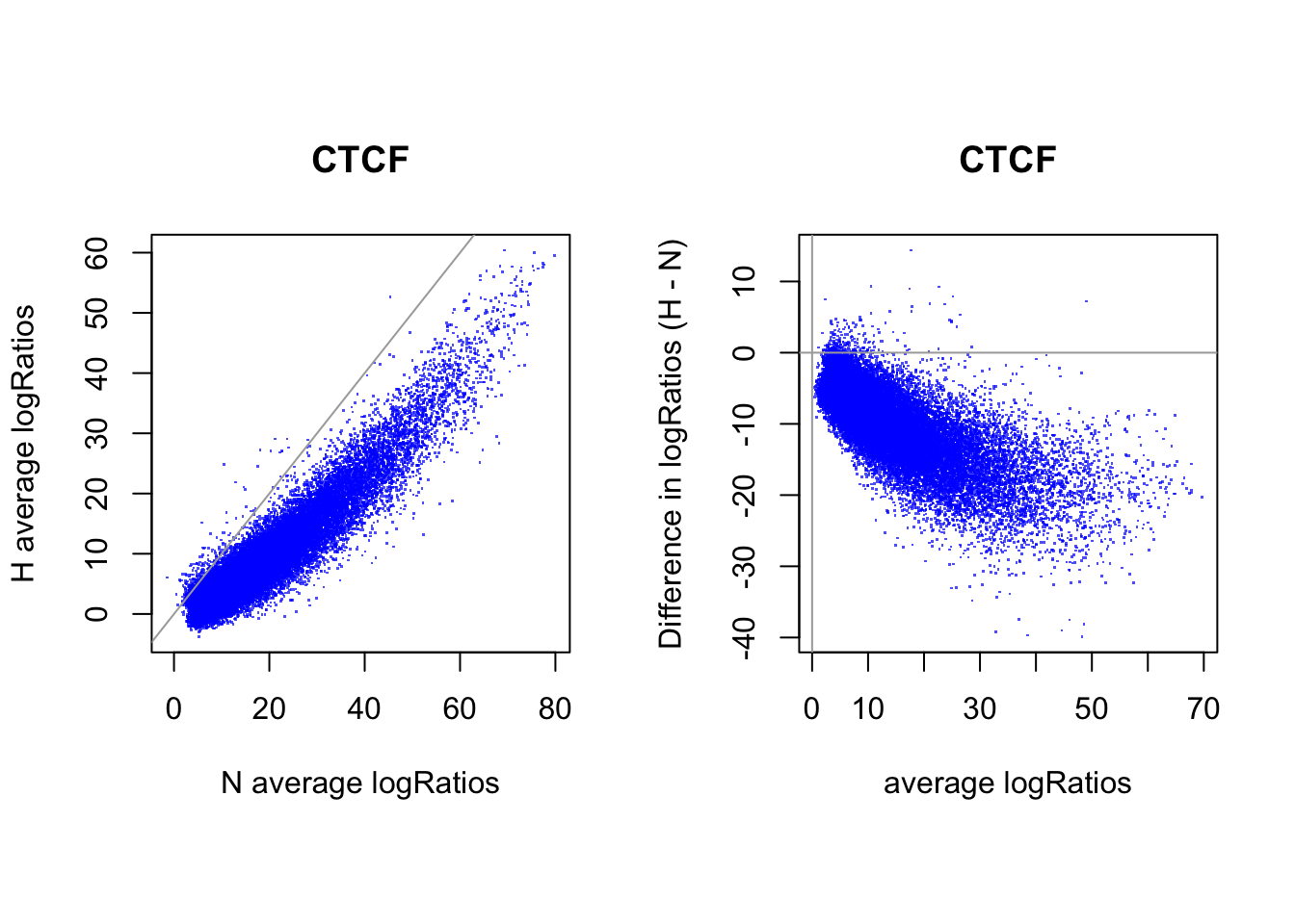 xlab = "average logRatios", ylab = "Difference in logRatios (H - N)", main = tf_name,