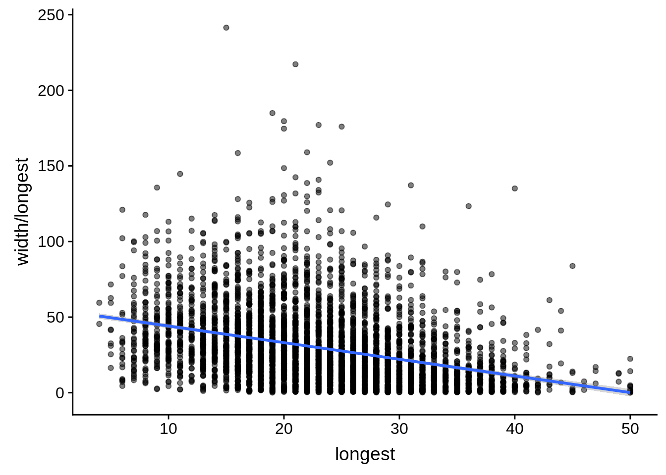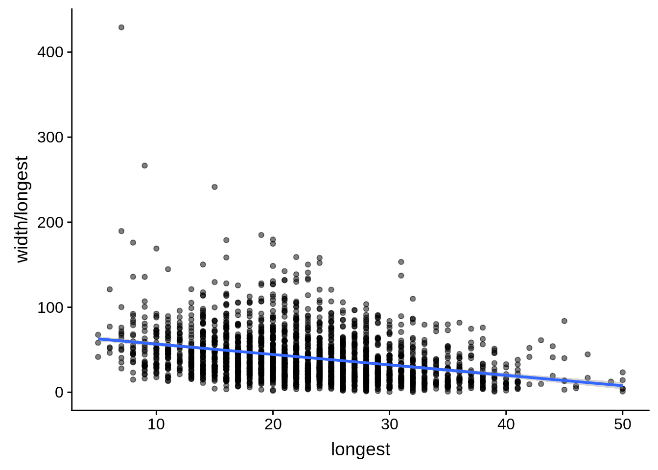 ggplot(aes(y=width/longest,x=longest)) + geom_point(alpha=0.5) + stat_smooth(method="lm")