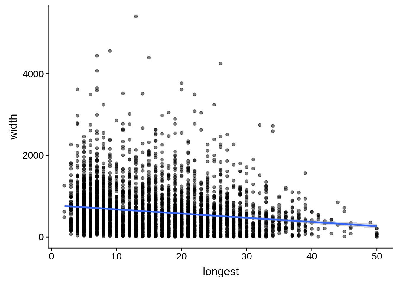 ggplot(aes(y=width,x=longest)) + geom_point(alpha=0.5) + stat_smooth(method="lm")