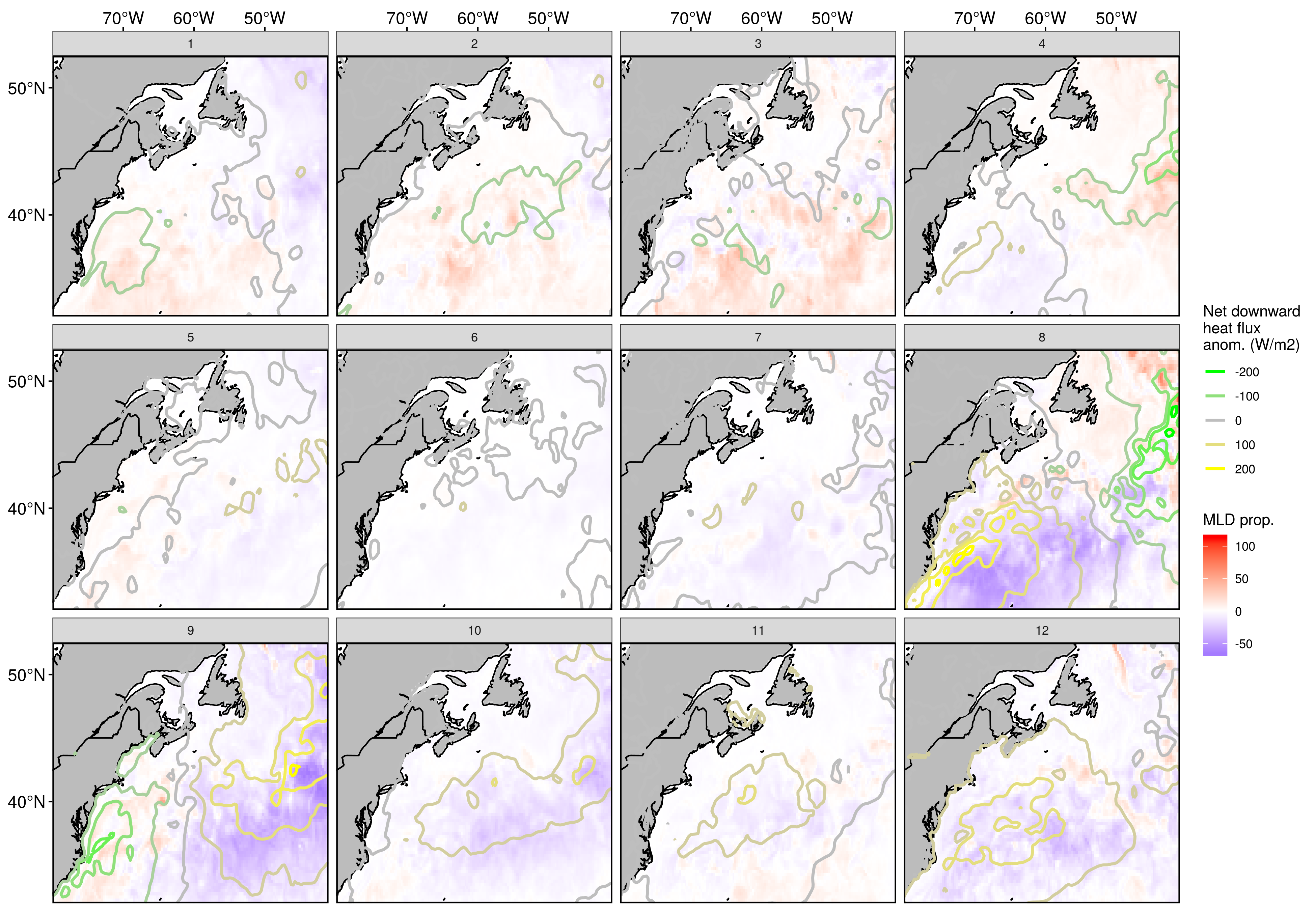 This is another chicken vs. egg situation where it is not clear if the strong GS is driving warm water northwards, which then causes a warm air anomaly, or if the air anomaly is already there and acts to supercharge the GS. Either way, we see a strong positive heatflux from the atmosphere into the GS which is then transporting warm water against the shelf waters.