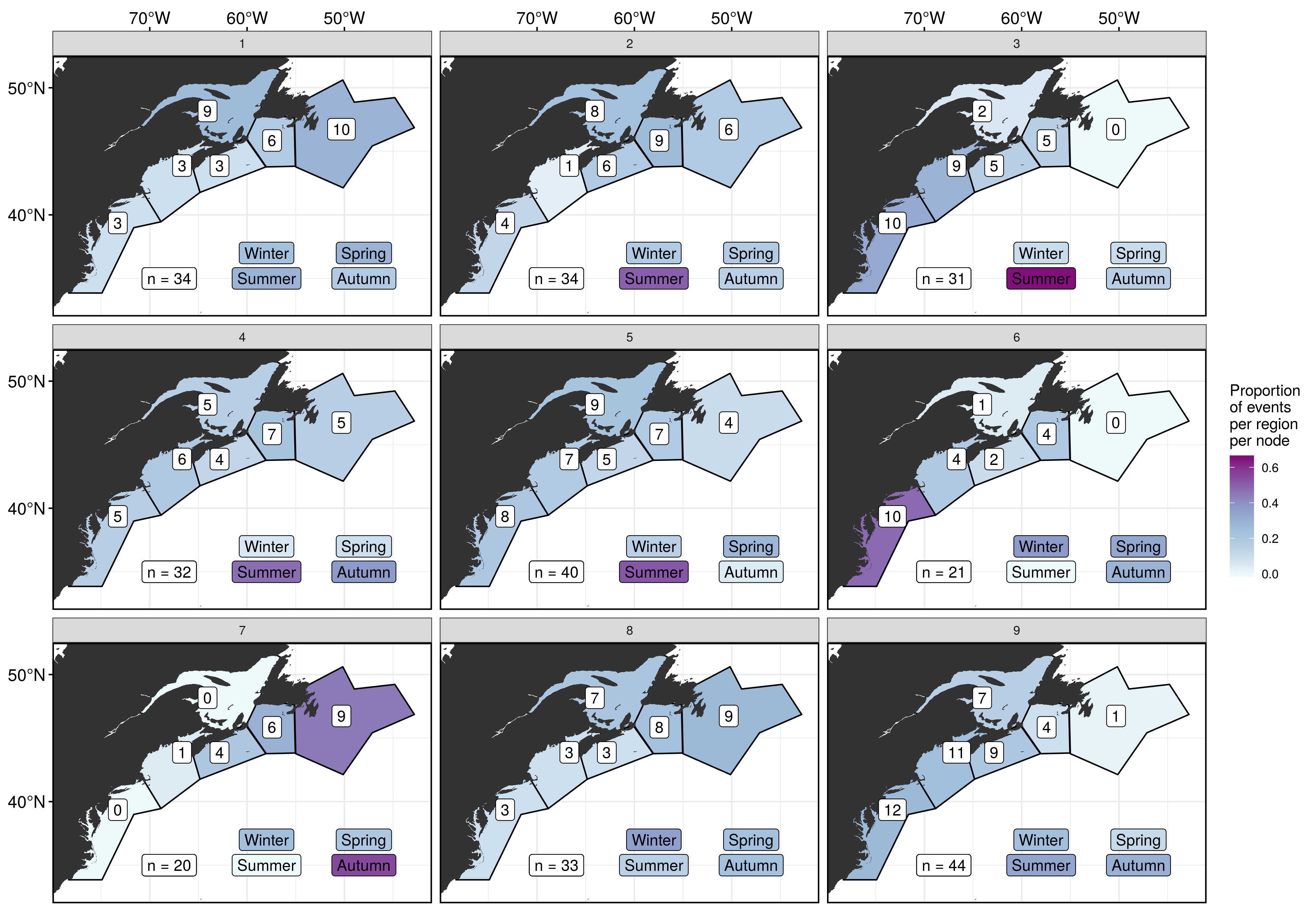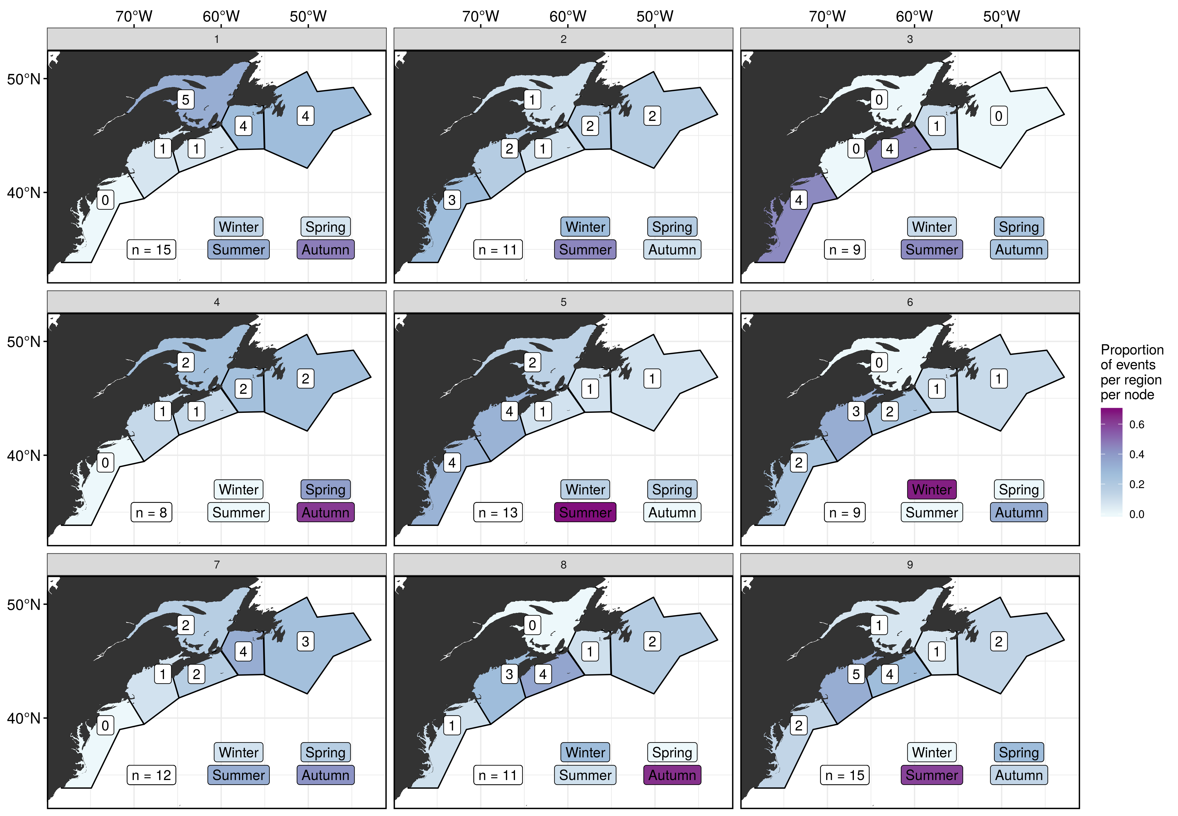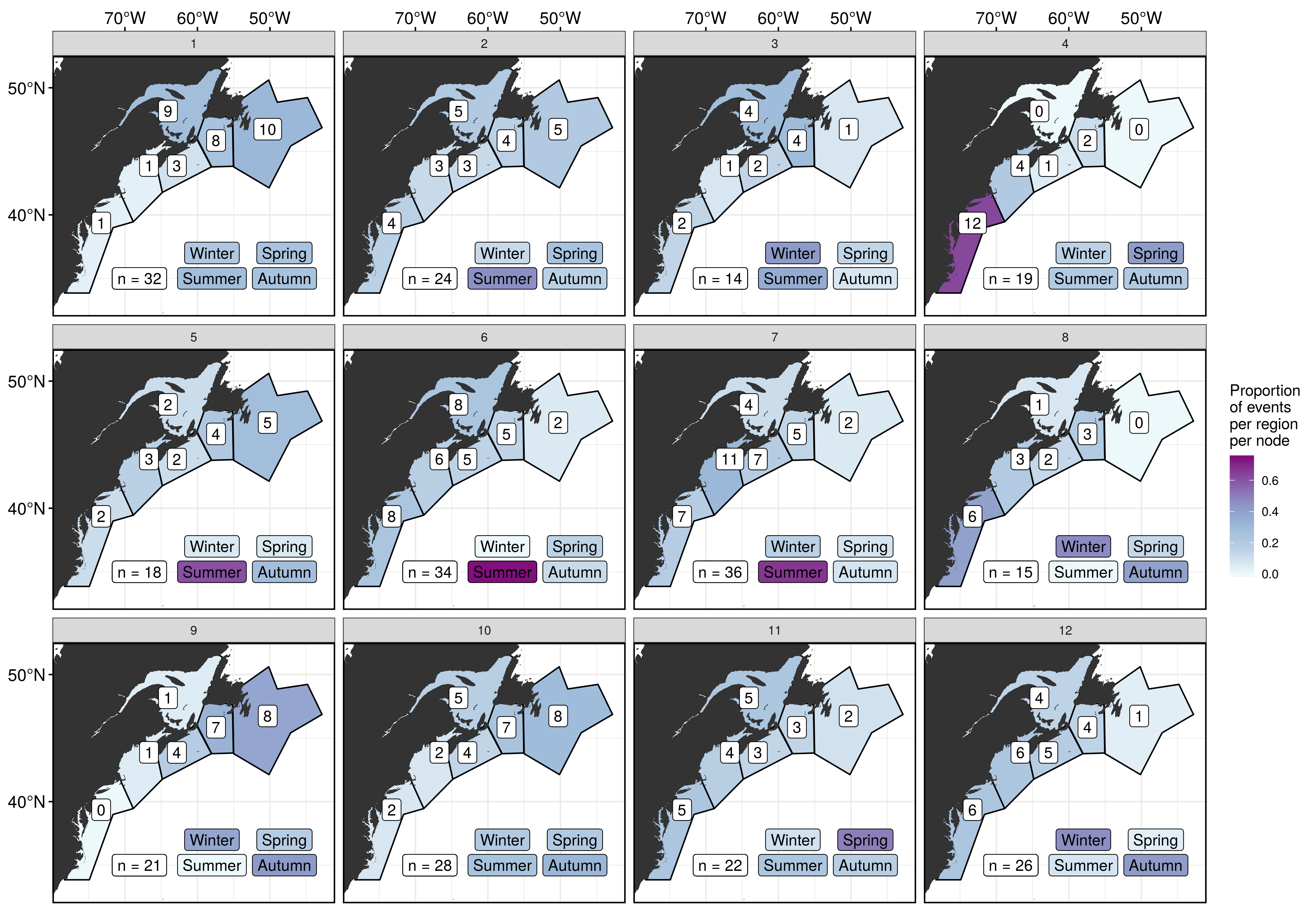 With this reduced run of MHWs we see the same pattern as before that the left-hand column has predominantly nfs focused MHWs and no mab MHWs. Moving to the right however the pattern of increasing mab MHWs and decreasing nfs MHWs does not hold up great, but it is vaguely there. We also see that the highest proportion of gsl MHWs occur in the top left node (1) and decrease as we move diagonally away. There doesn’t appear to be too much of a pattern in seasonal occurrence across the nodes, but there are many nodes with a high proportion of events from only one season. Much more so than with the larger MHW sample sizes above. I think that we don’t see many nfs MHWs because they tend to be smaller and were probably screen out more so than for the other regions.