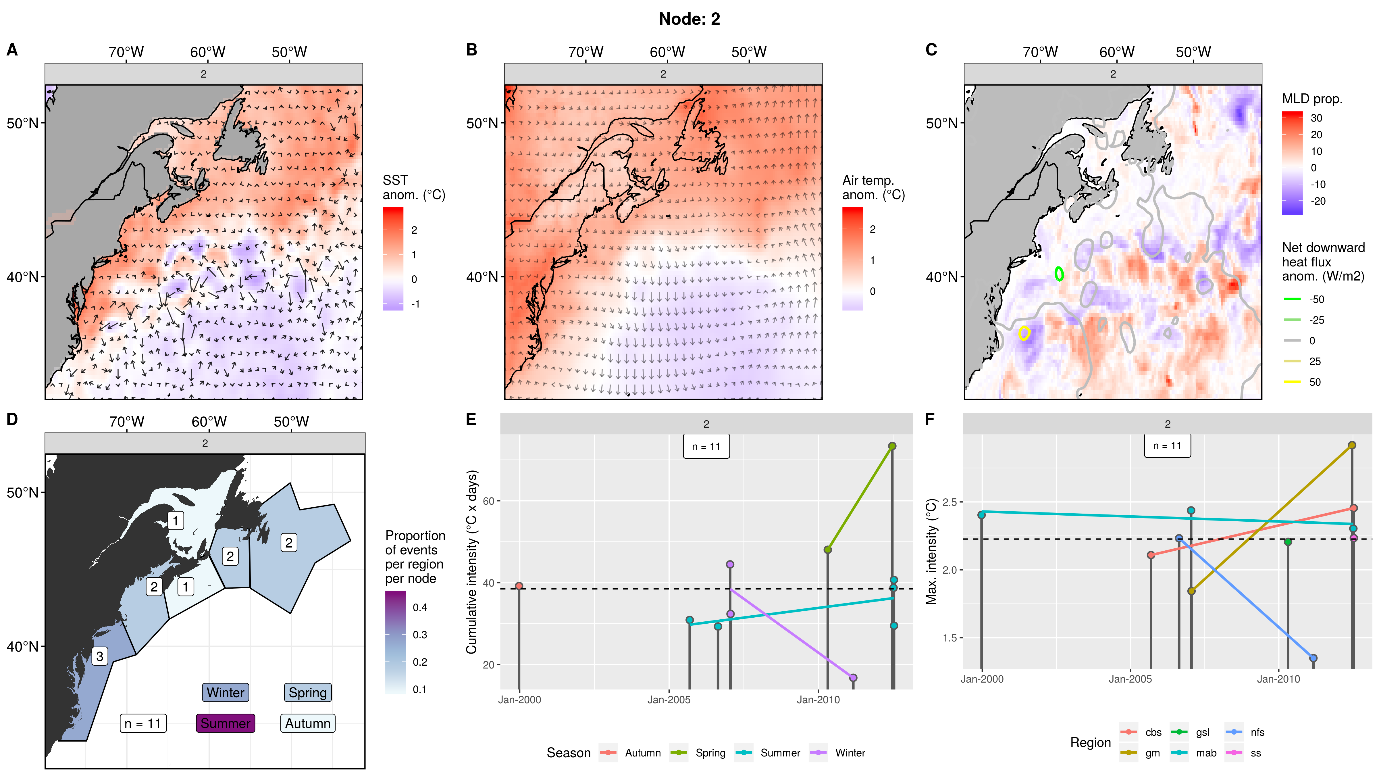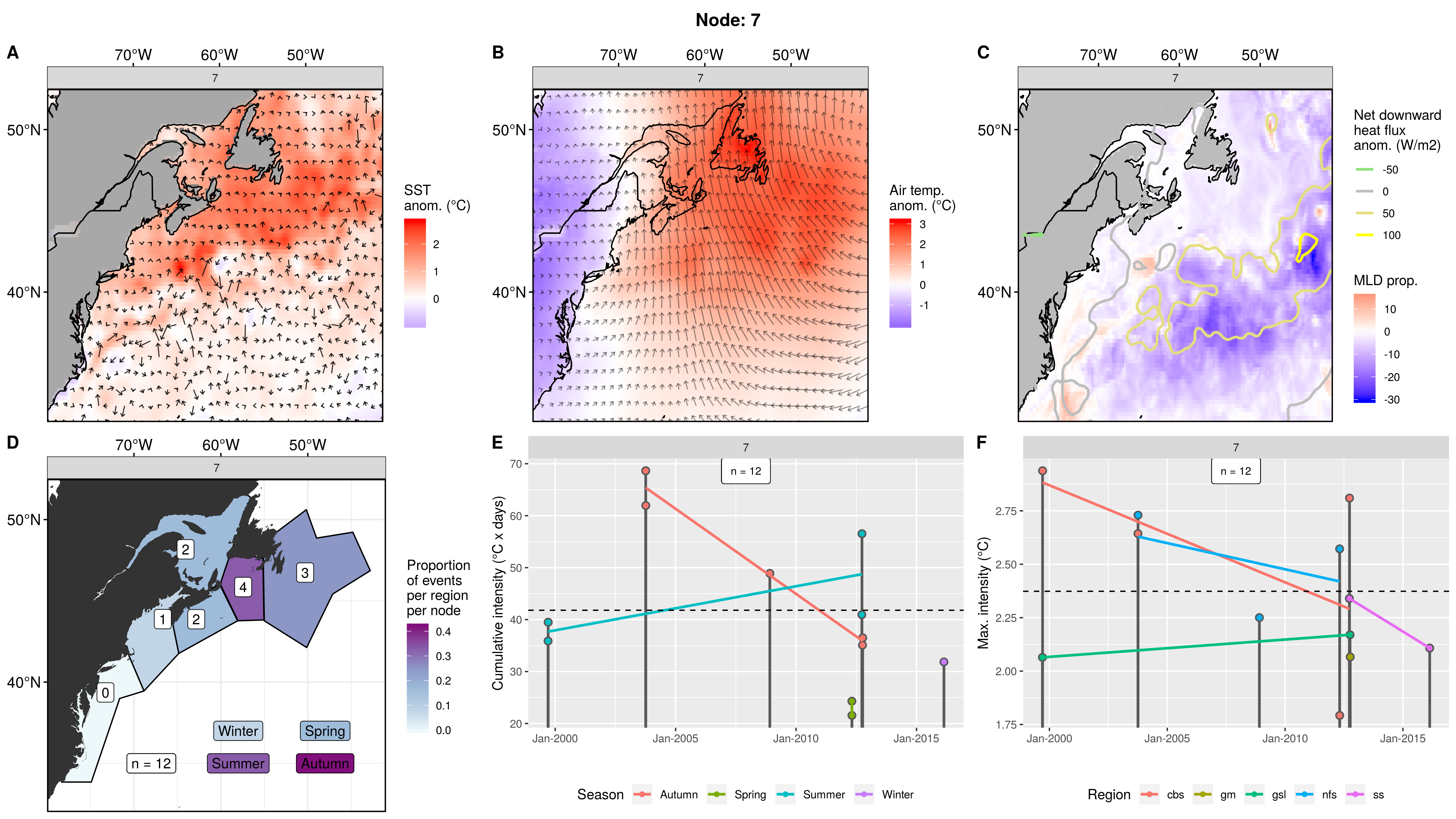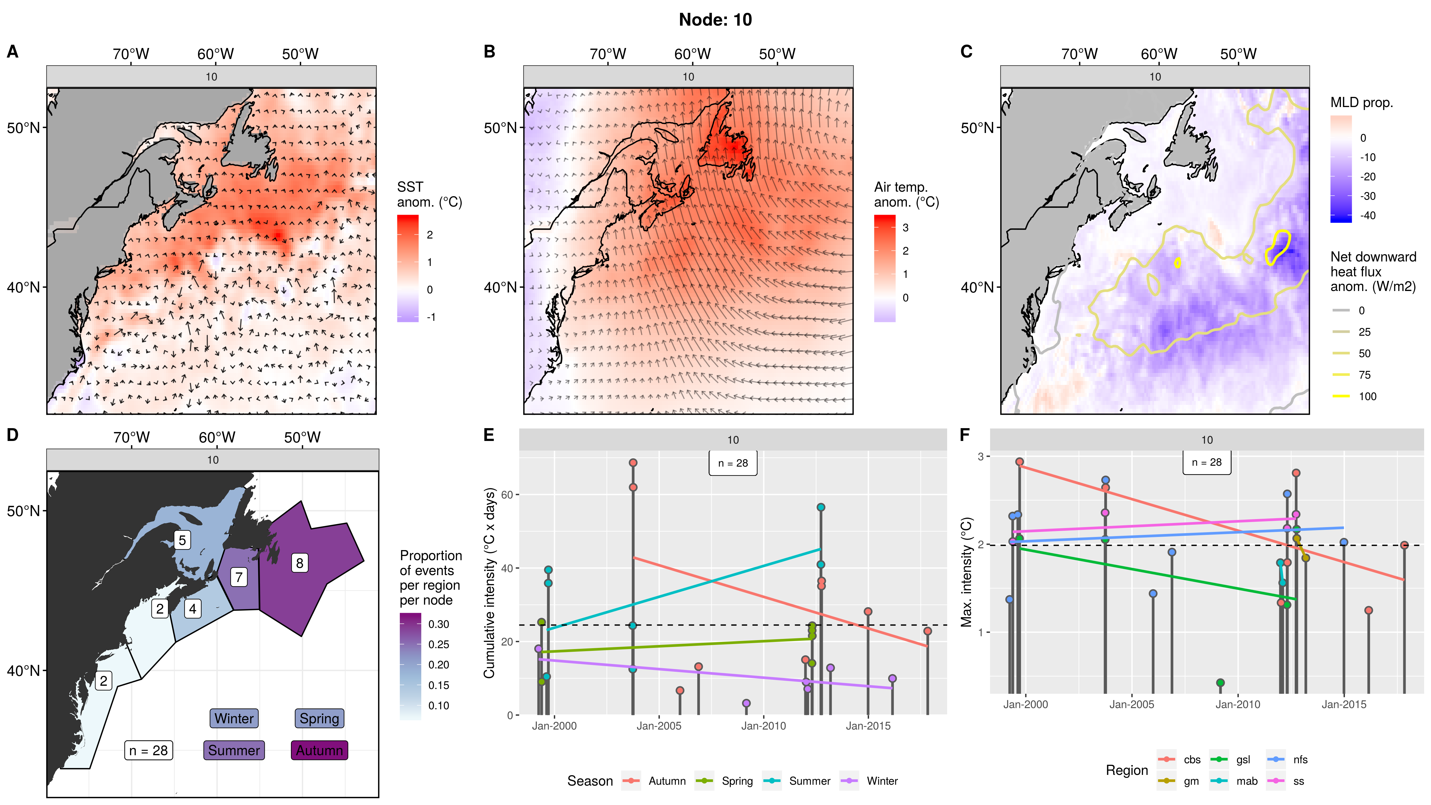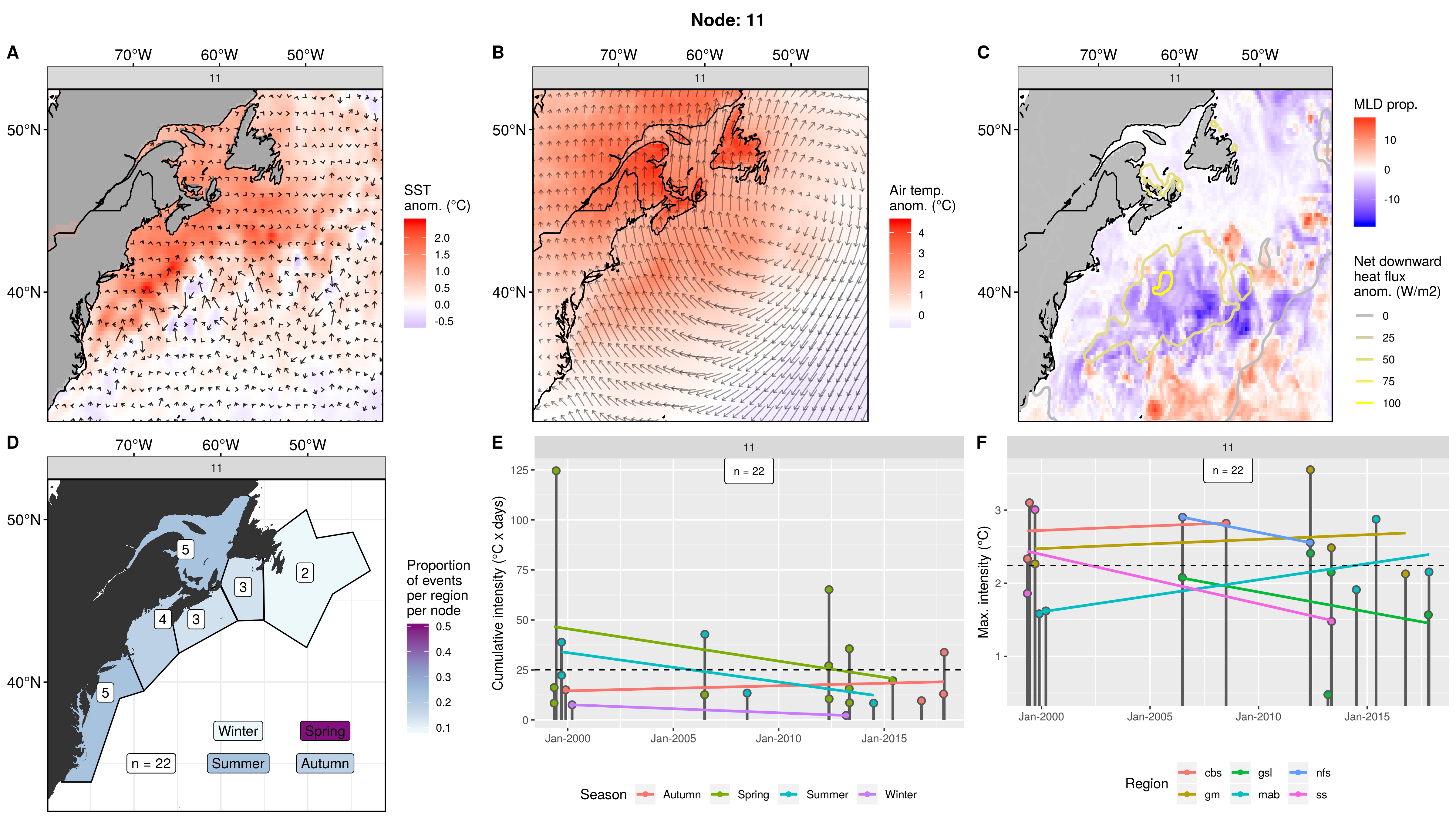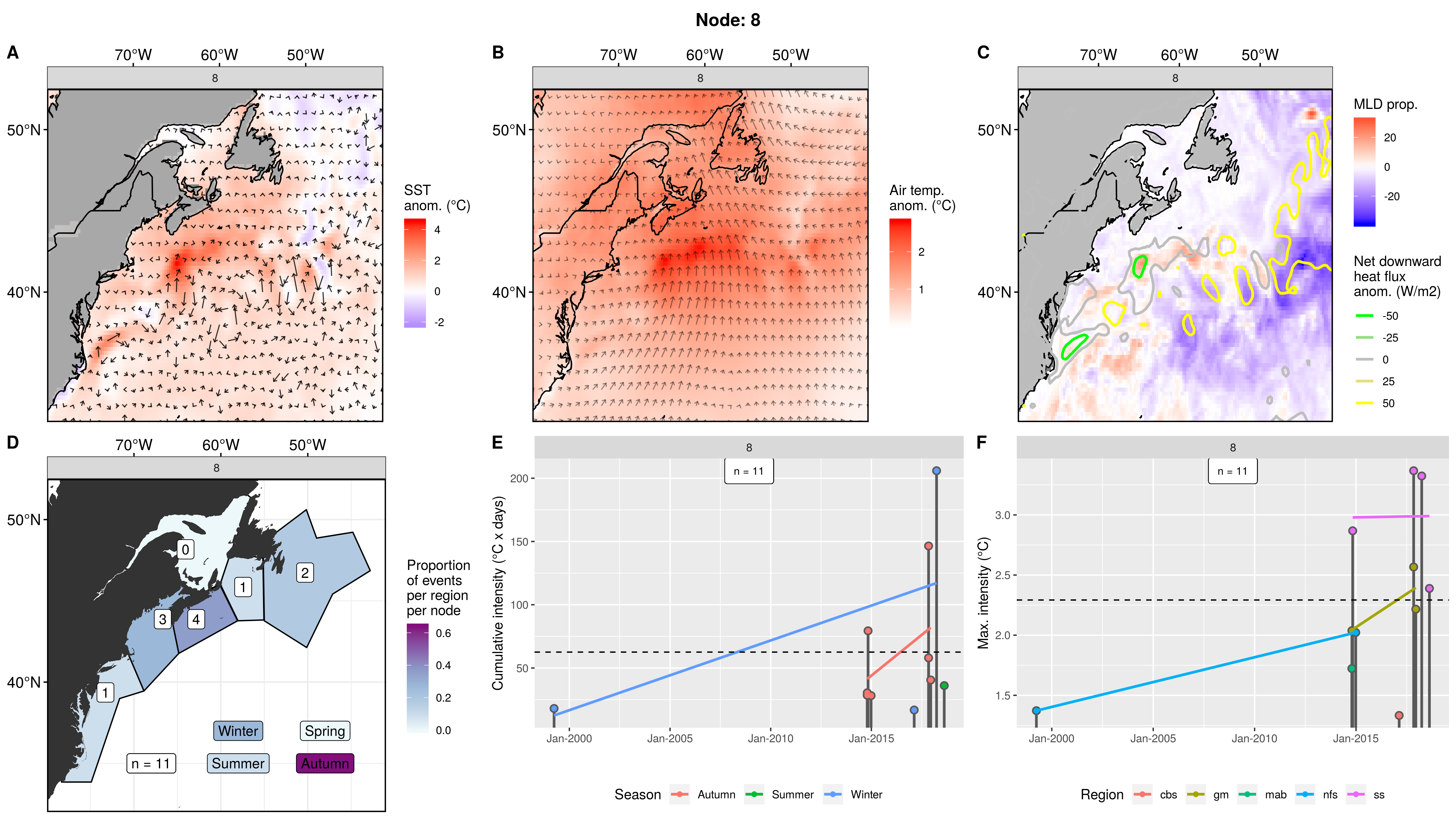 This node is tied with node 9 for the highest count of MHWs at 15, meaning this is a common pattern for lengthy/large MHWs. The MHWs take place largely in the gsl, nfs, and cbs, with only 1 event each in the ss + gm and 0 MHWs in the mab. About half the events occurred in autumn, with spill-over into summer, only 2 winter events and 1 spring event. These events occurred from 2008 – 2016 in 7 distinct pulses, 4 of which triggered MHWs in 2 – 3 regions at once. The cumulative intensity and max intensities are on the higher end.