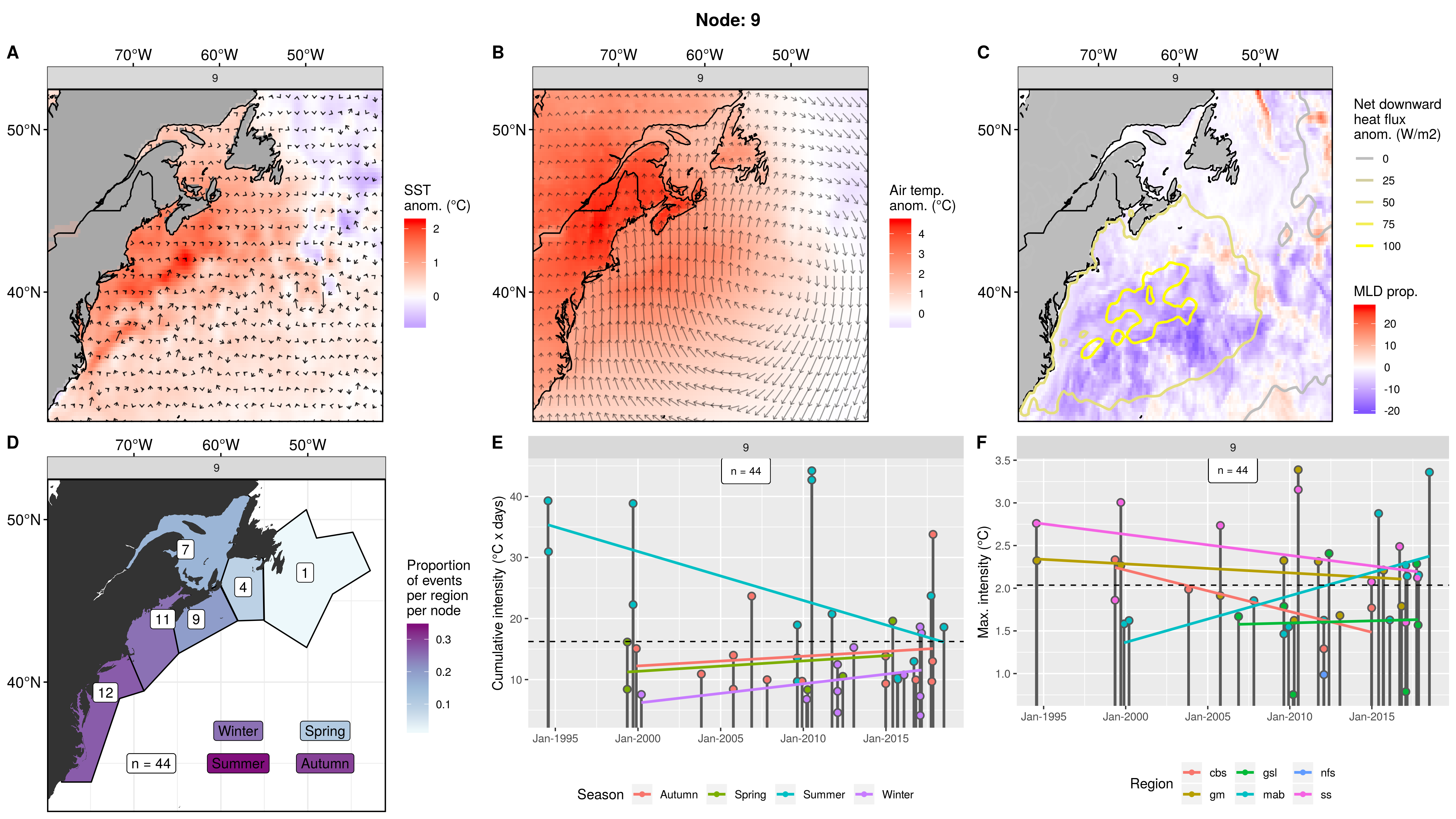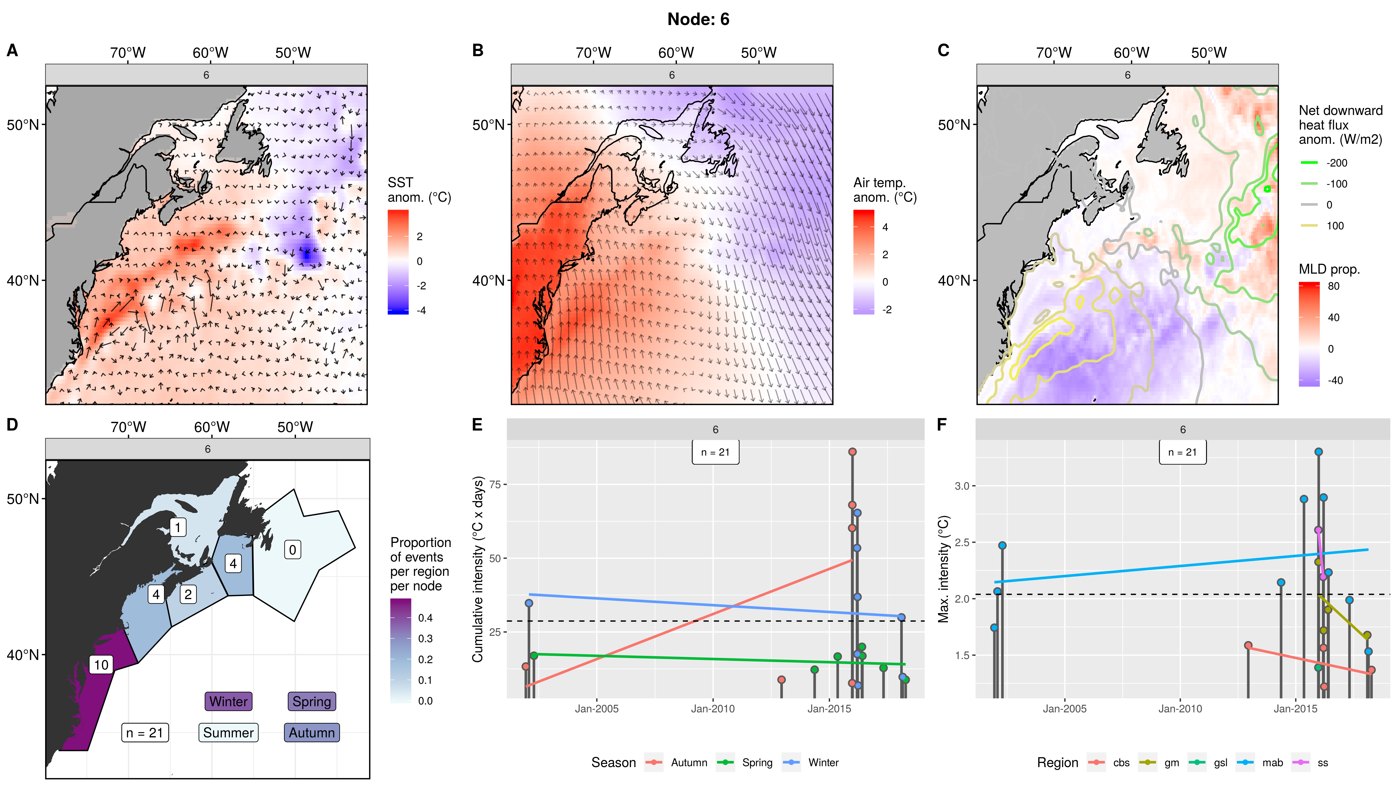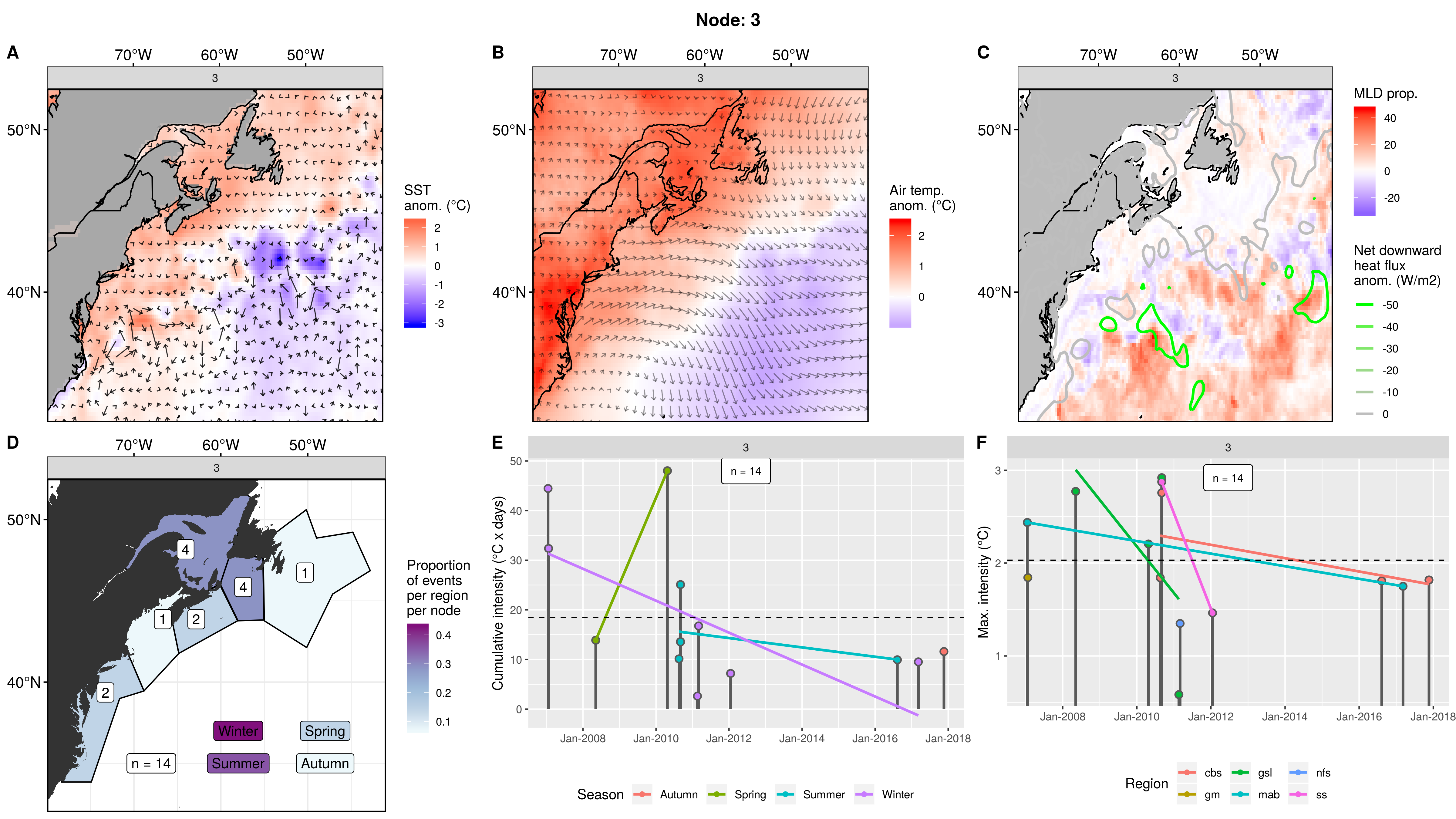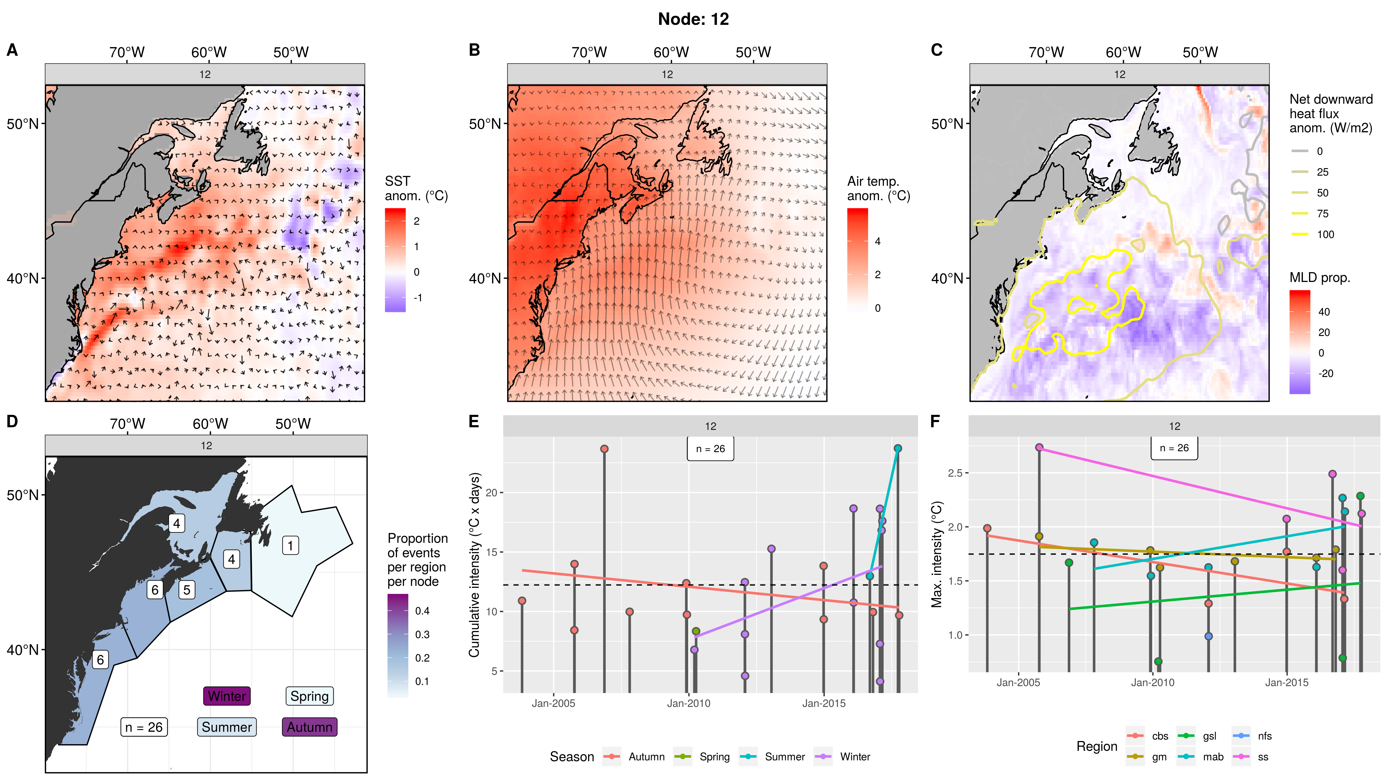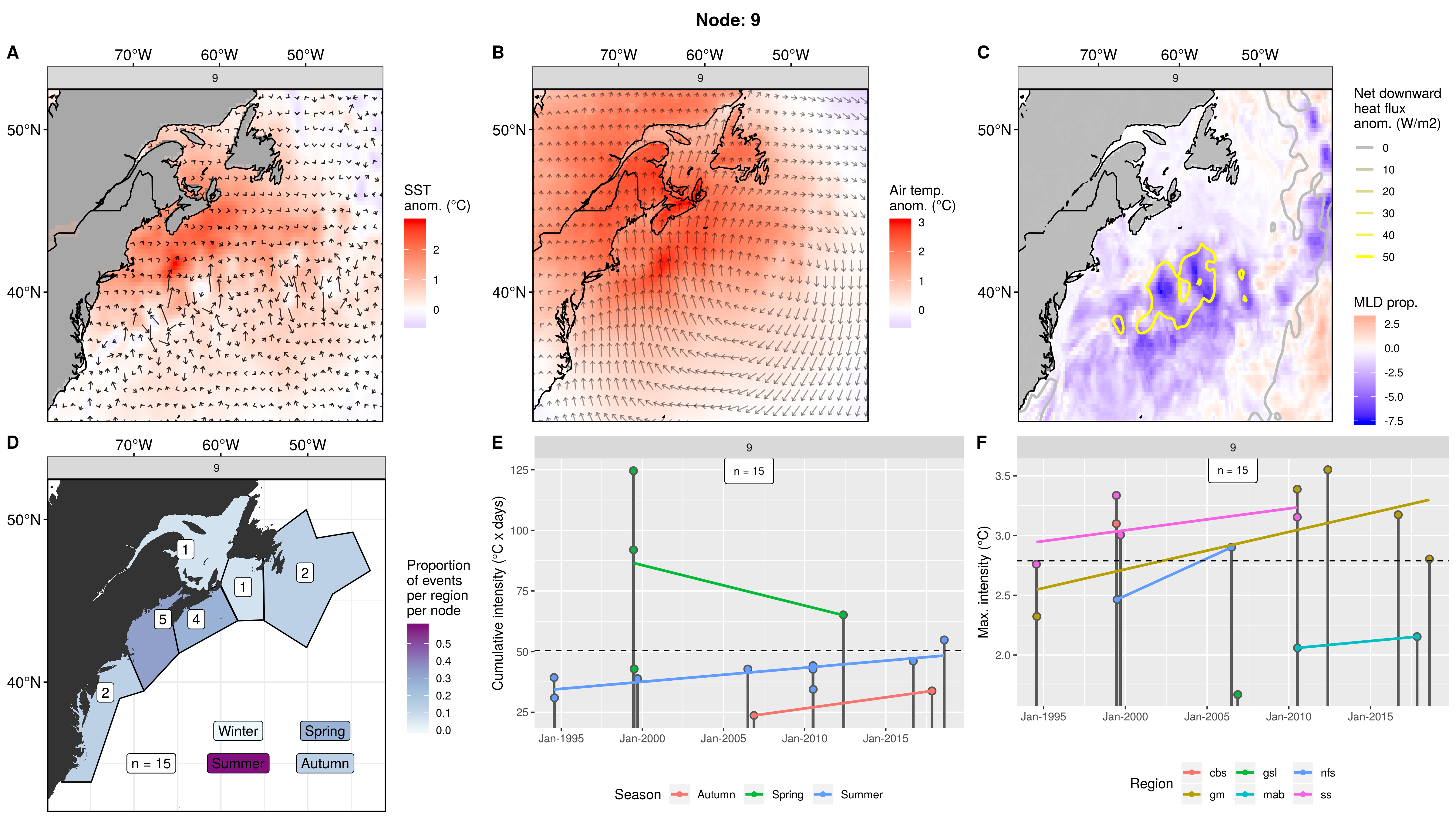This node is tied with node 9 for the highest count of MHWs at 15, meaning this is a common pattern for lengthy/large MHWs. The MHWs take place largely in the gsl, nfs, and cbs, with only 1 event each in the ss + gm and 0 MHWs in the mab. About half the events occurred in autumn, with spill-over into summer, only 2 winter events and 1 spring event. These events occurred from 2008 – 2016 in 7 distinct pulses, 4 of which triggered MHWs in 2 – 3 regions at once. The cumulative intensity and max intensities are on the higher end.