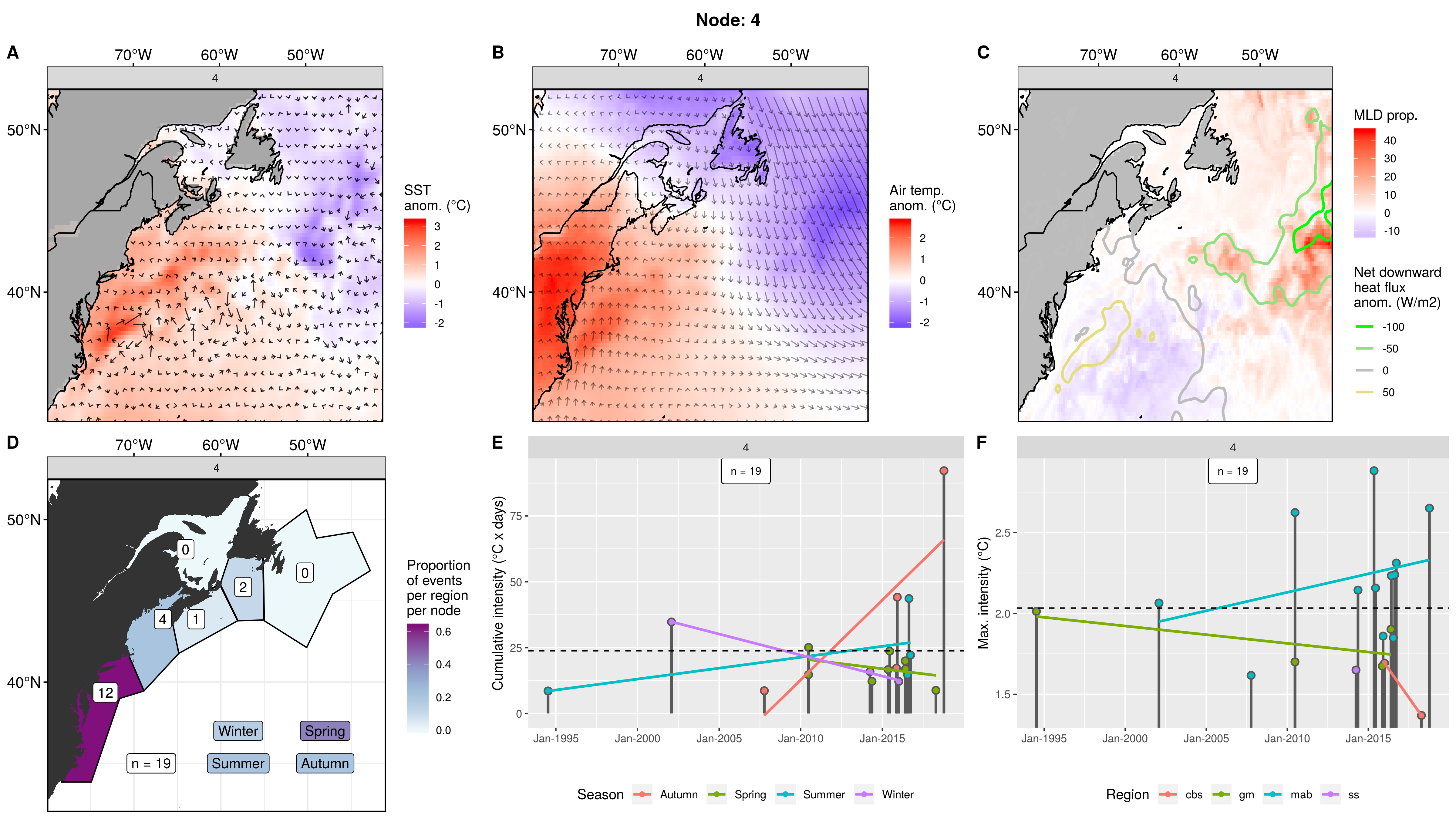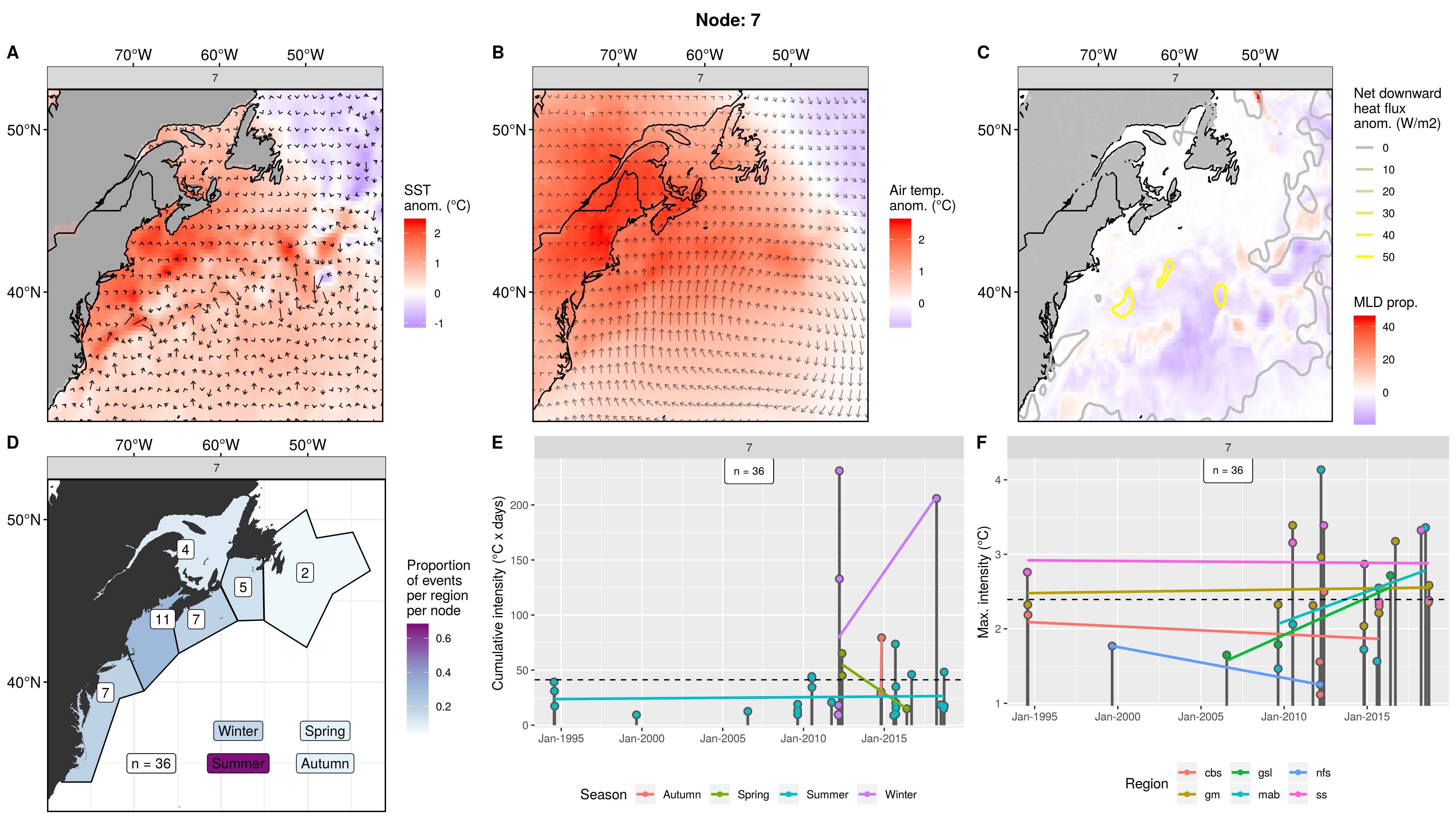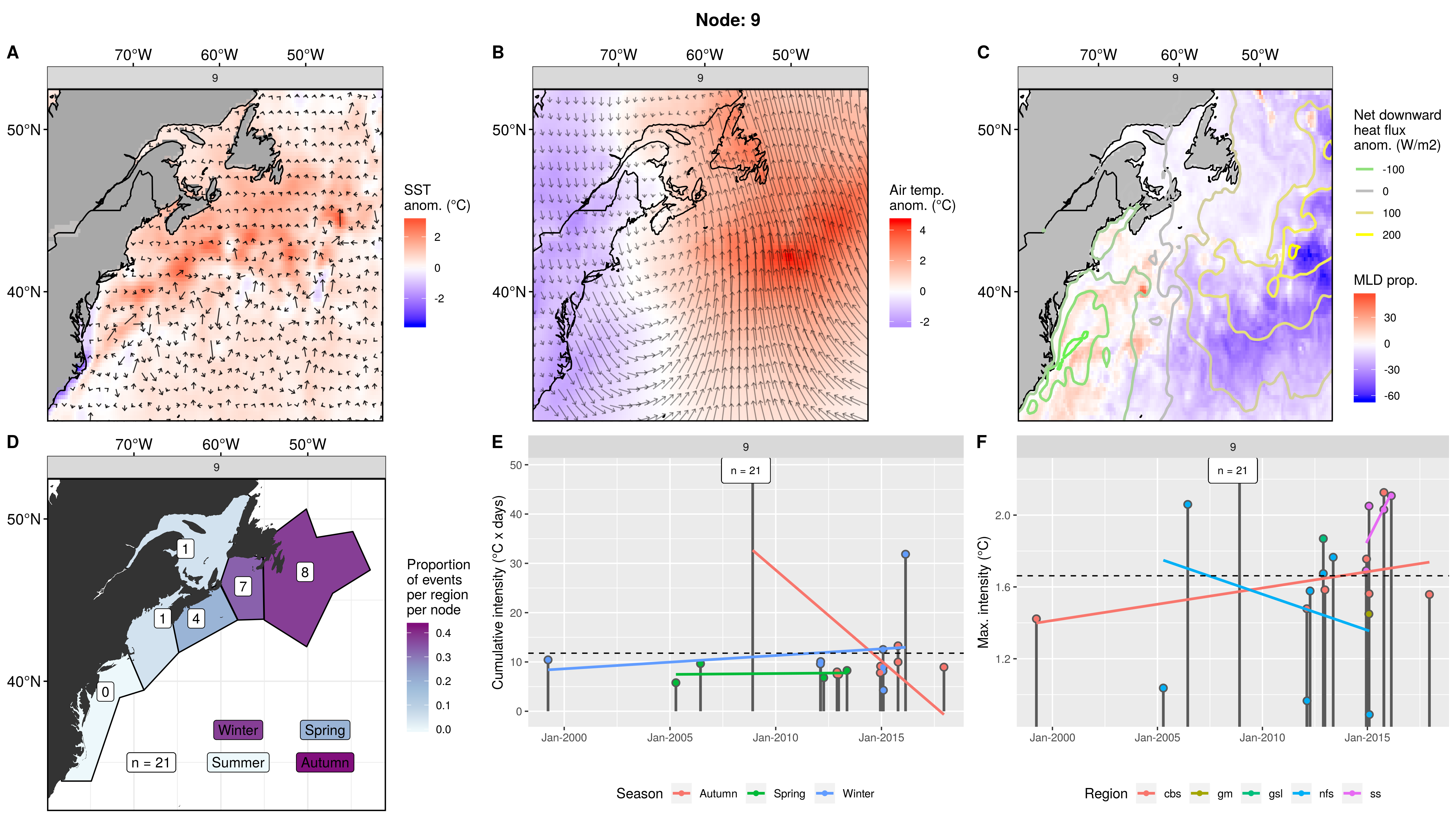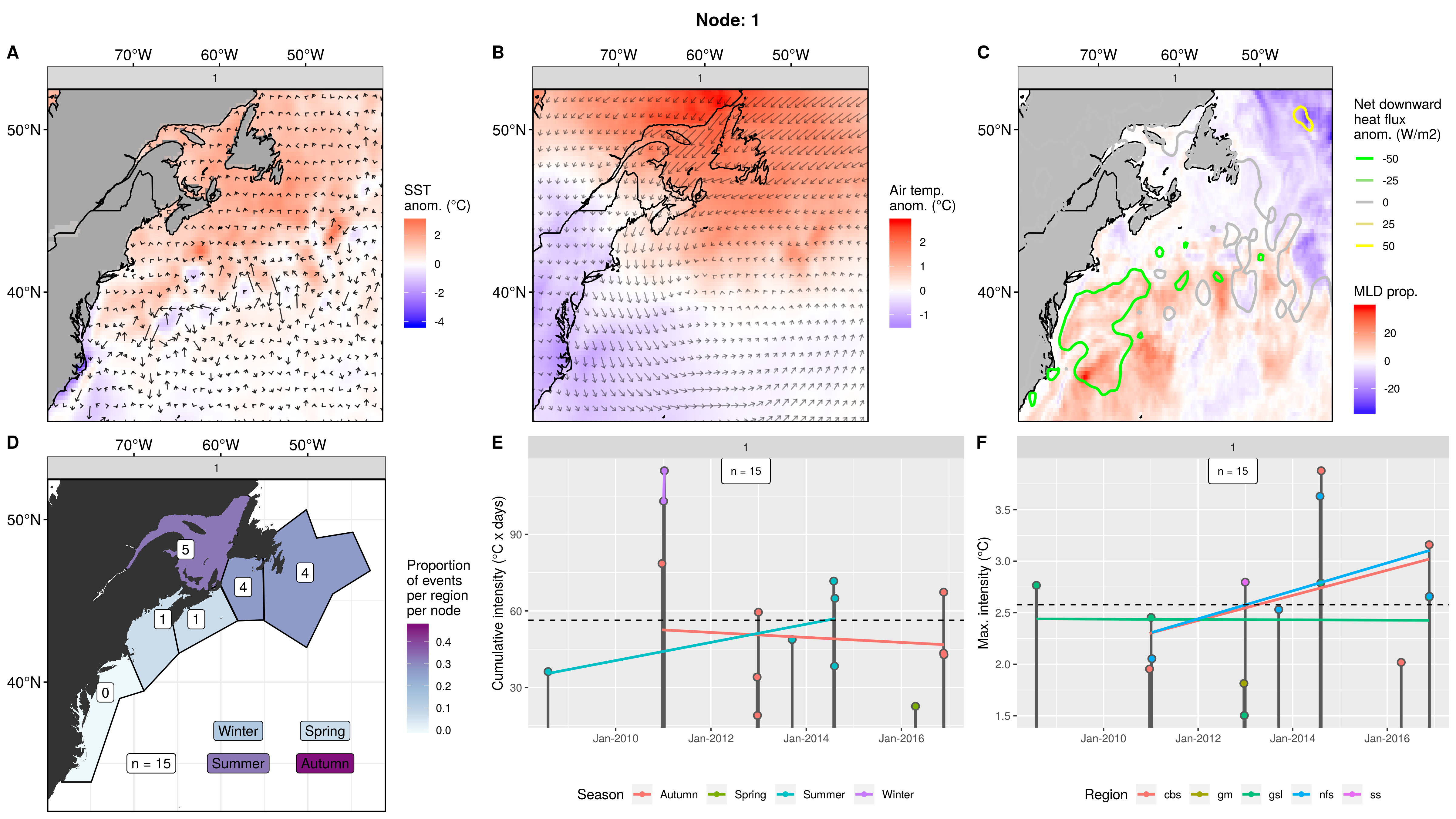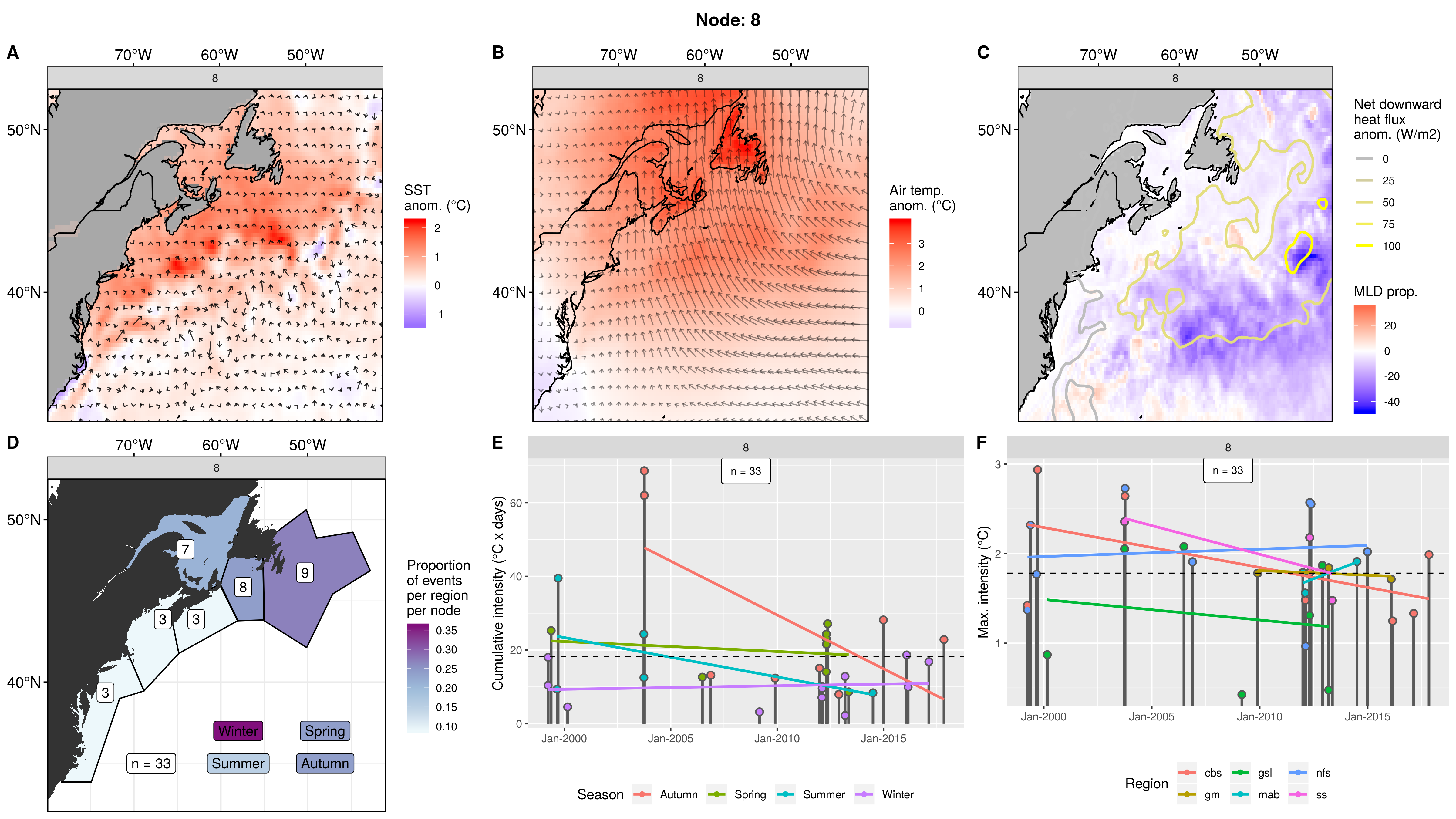 This node is tied with node 9 for the highest count of MHWs at 15, meaning this is a common pattern for lengthy/large MHWs. The MHWs take place largely in the gsl, nfs, and cbs, with only 1 event each in the ss + gm and 0 MHWs in the mab. About half the events occurred in autumn, with spill-over into summer, only 2 winter events and 1 spring event. These events occurred from 2008 – 2016 in 7 distinct pulses, 4 of which triggered MHWs in 2 – 3 regions at once. The cumulative intensity and max intensities are on the higher end.