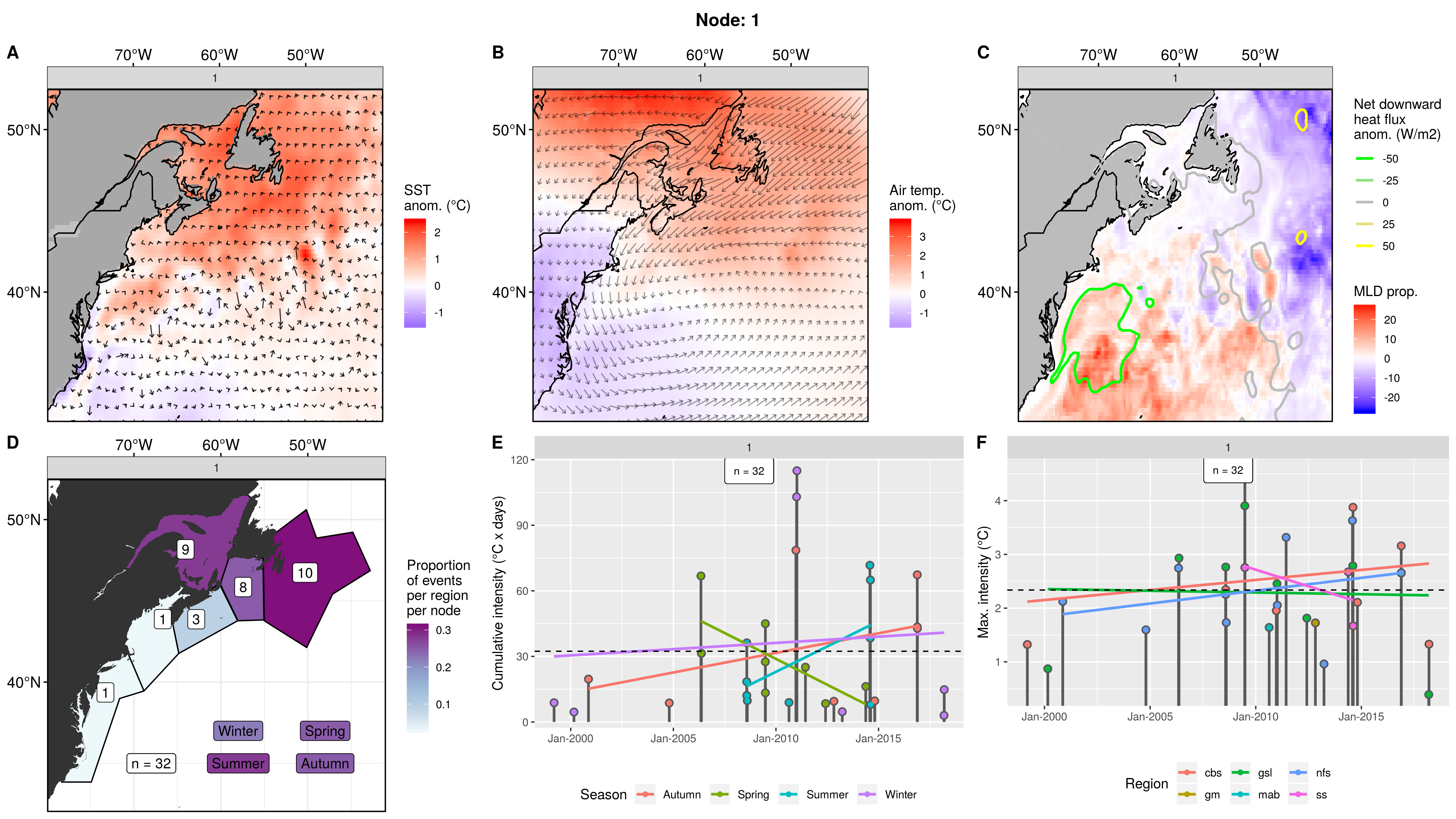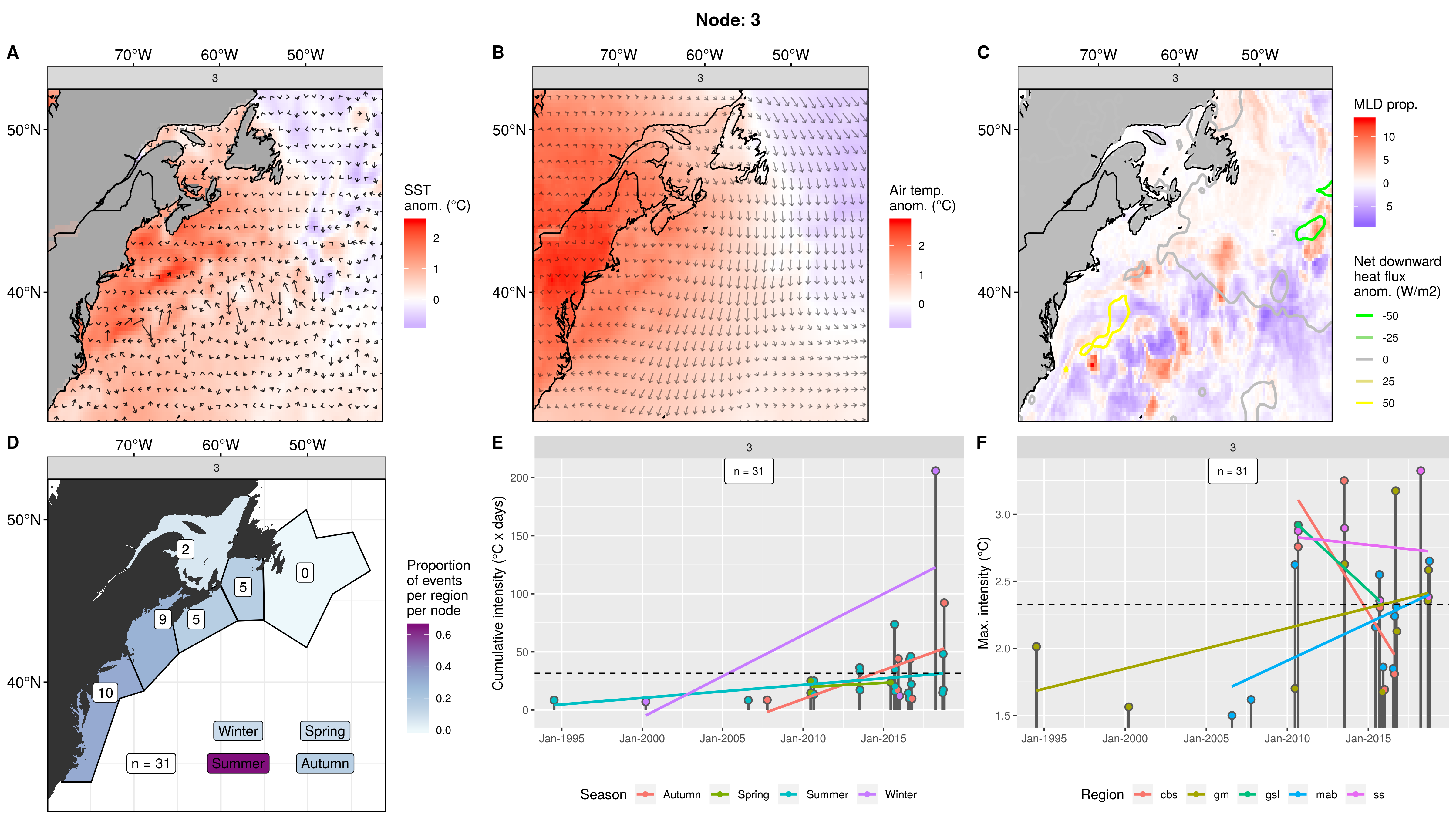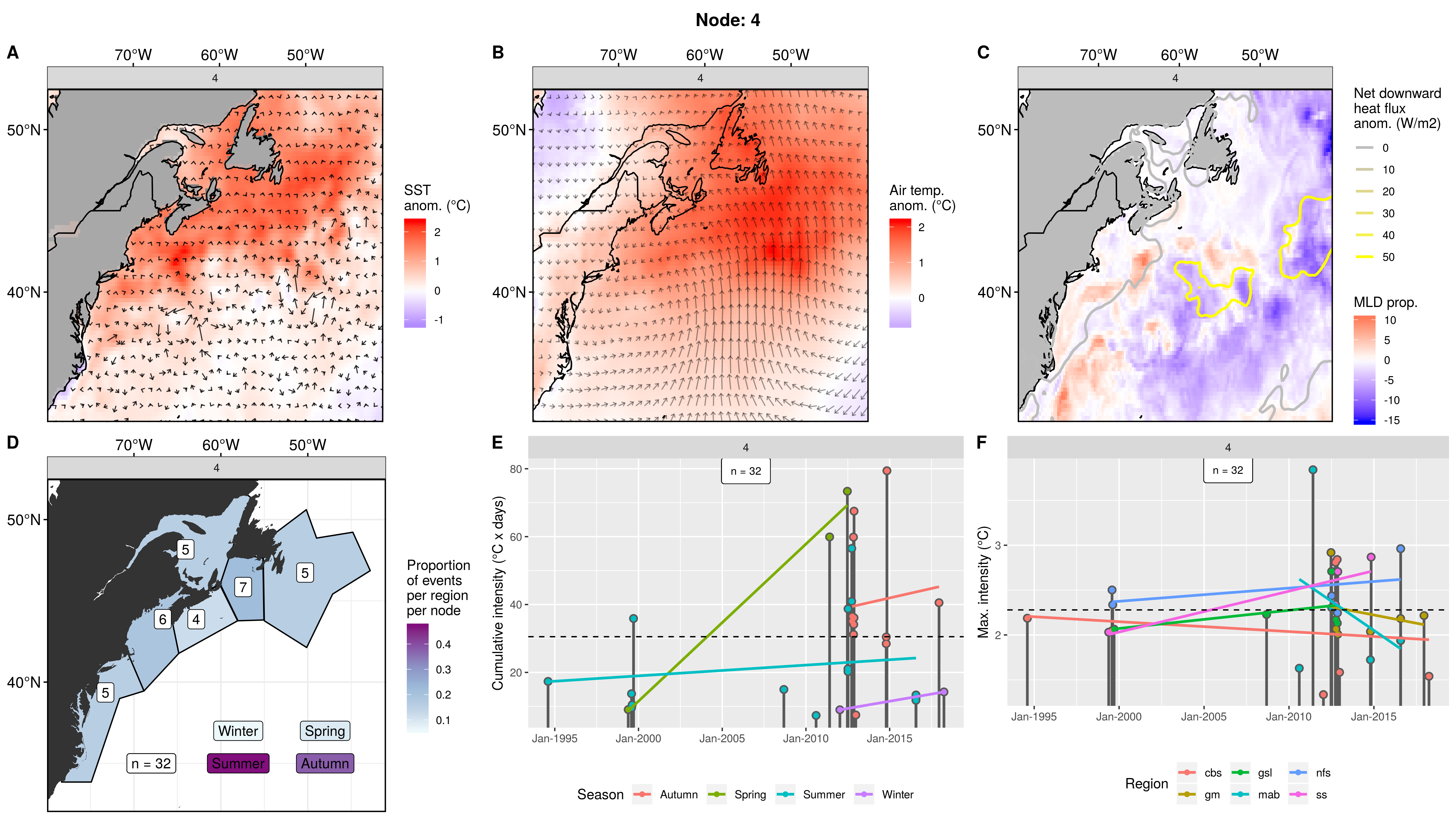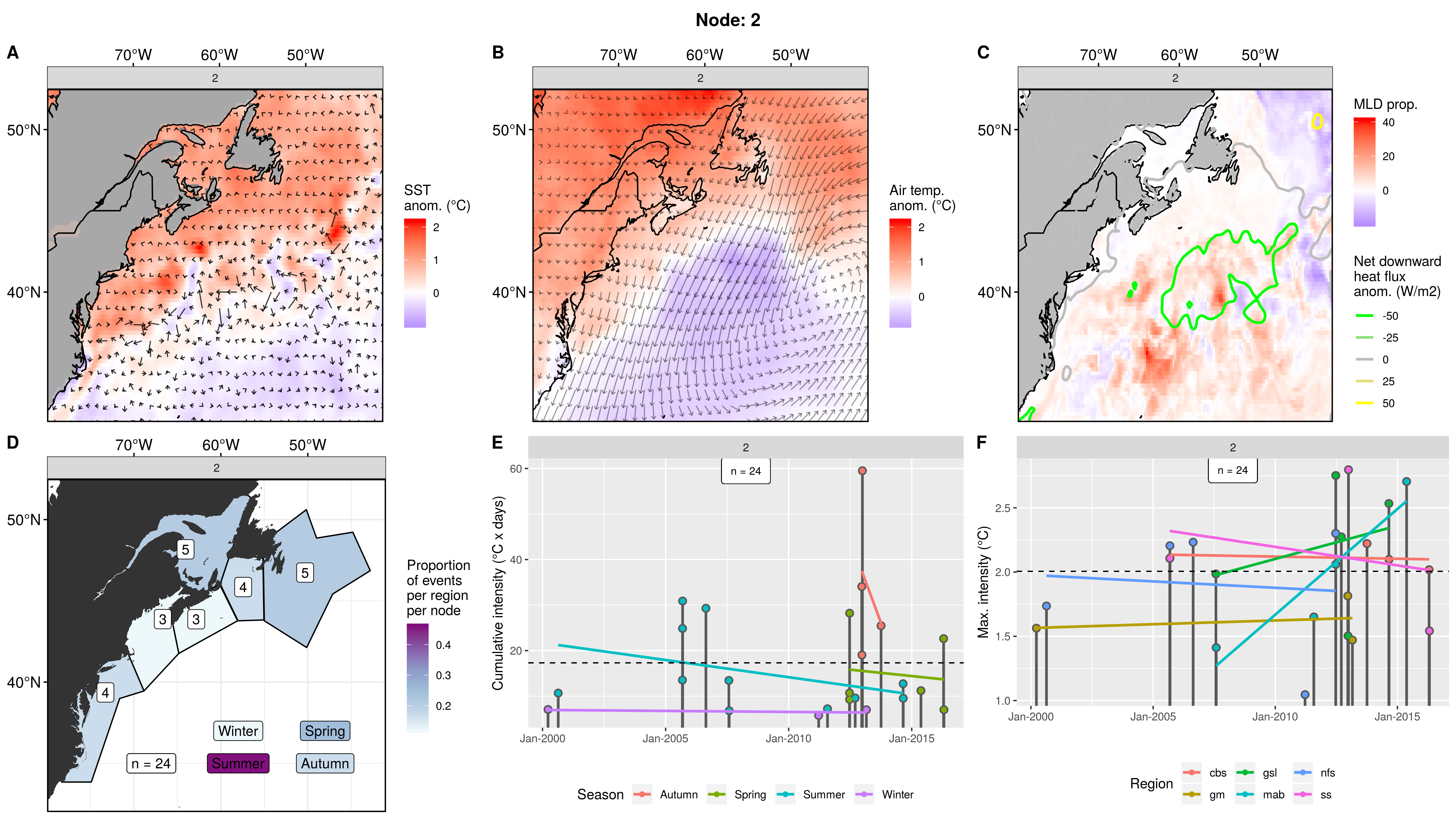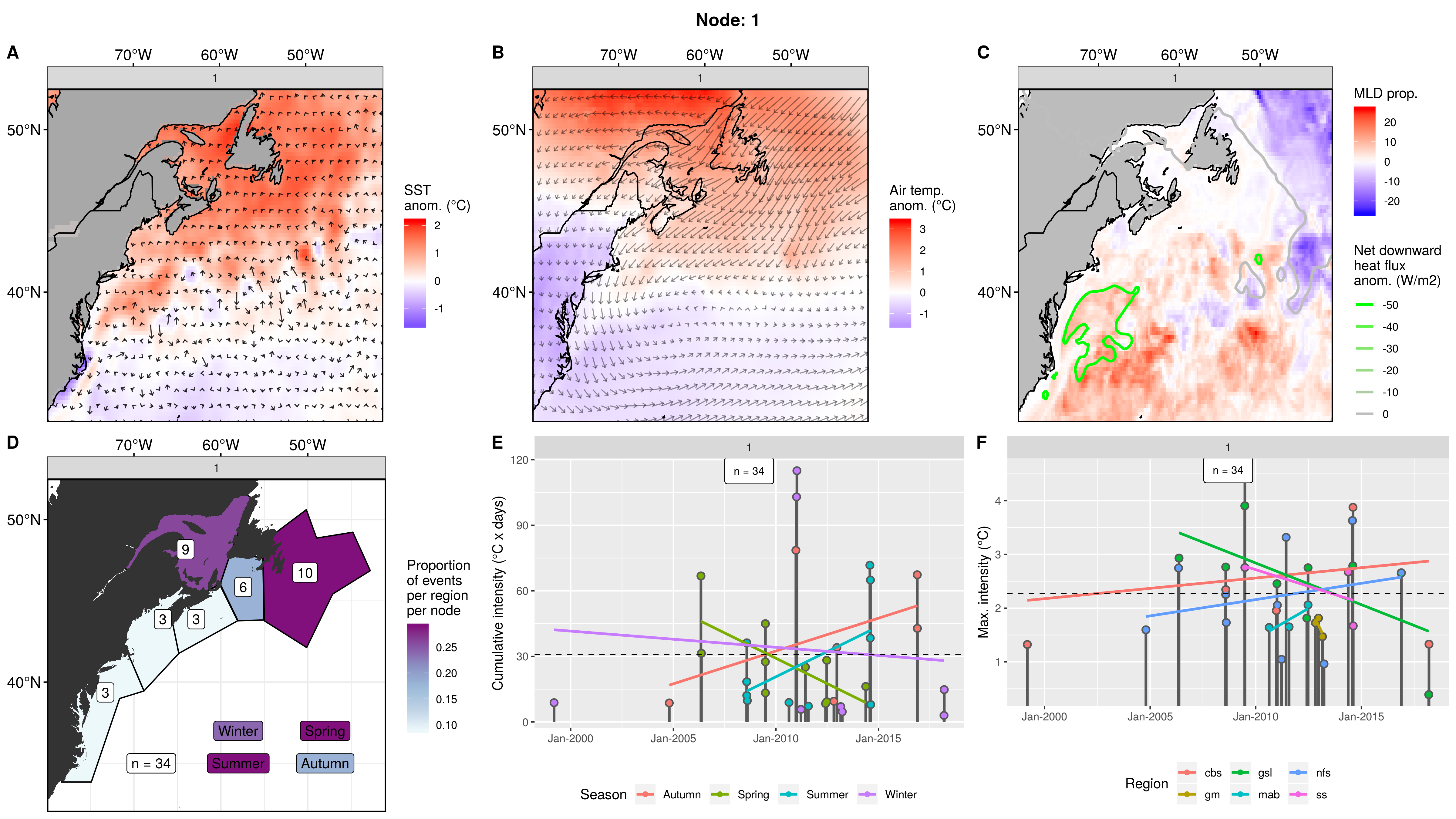 This node is tied with node 9 for the highest count of MHWs at 15, meaning this is a common pattern for lengthy/large MHWs. The MHWs take place largely in the gsl, nfs, and cbs, with only 1 event each in the ss + gm and 0 MHWs in the mab. About half the events occurred in autumn, with spill-over into summer, only 2 winter events and 1 spring event. These events occurred from 2008 – 2016 in 7 distinct pulses, 4 of which triggered MHWs in 2 – 3 regions at once. The cumulative intensity and max intensities are on the higher end.