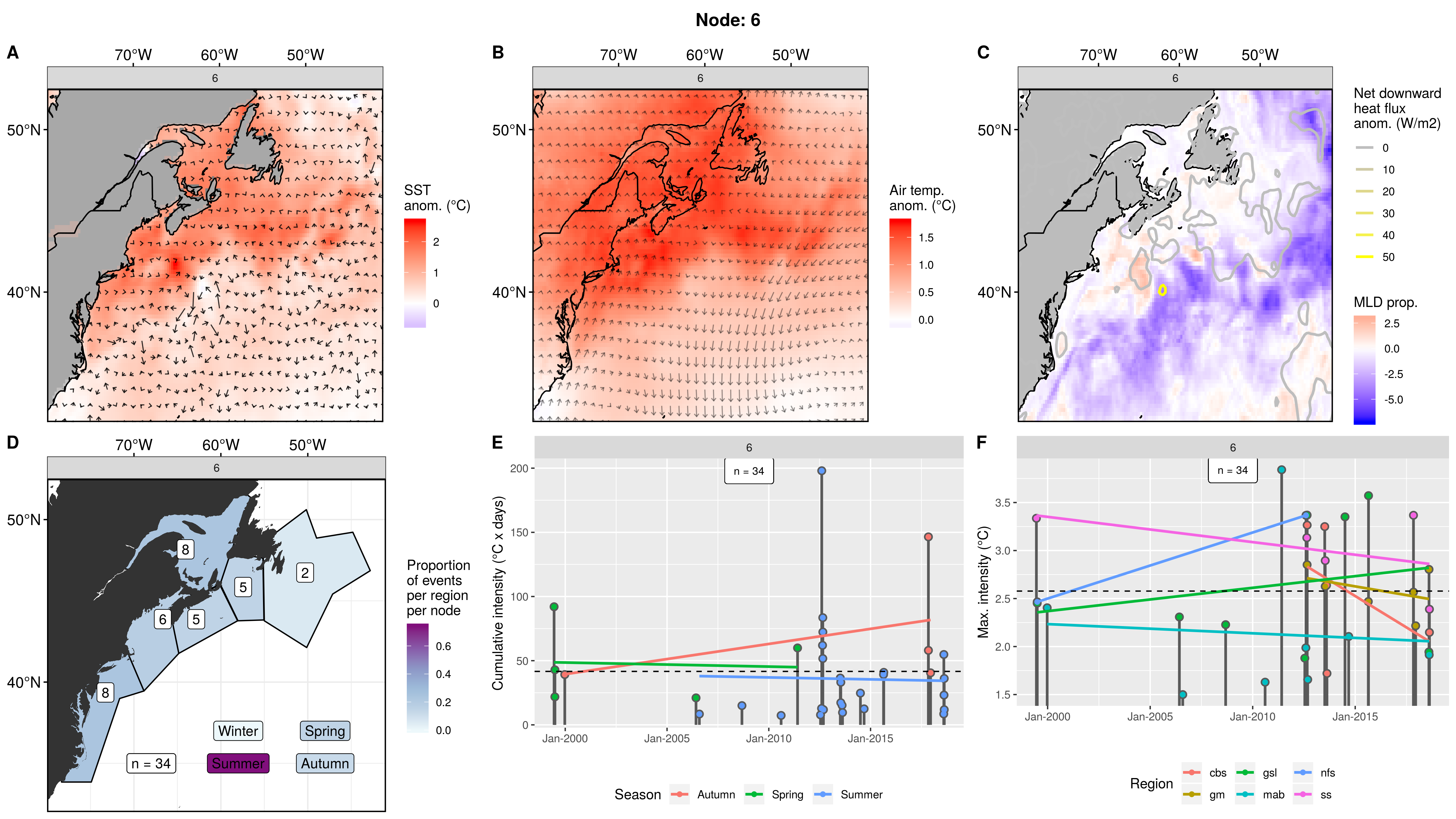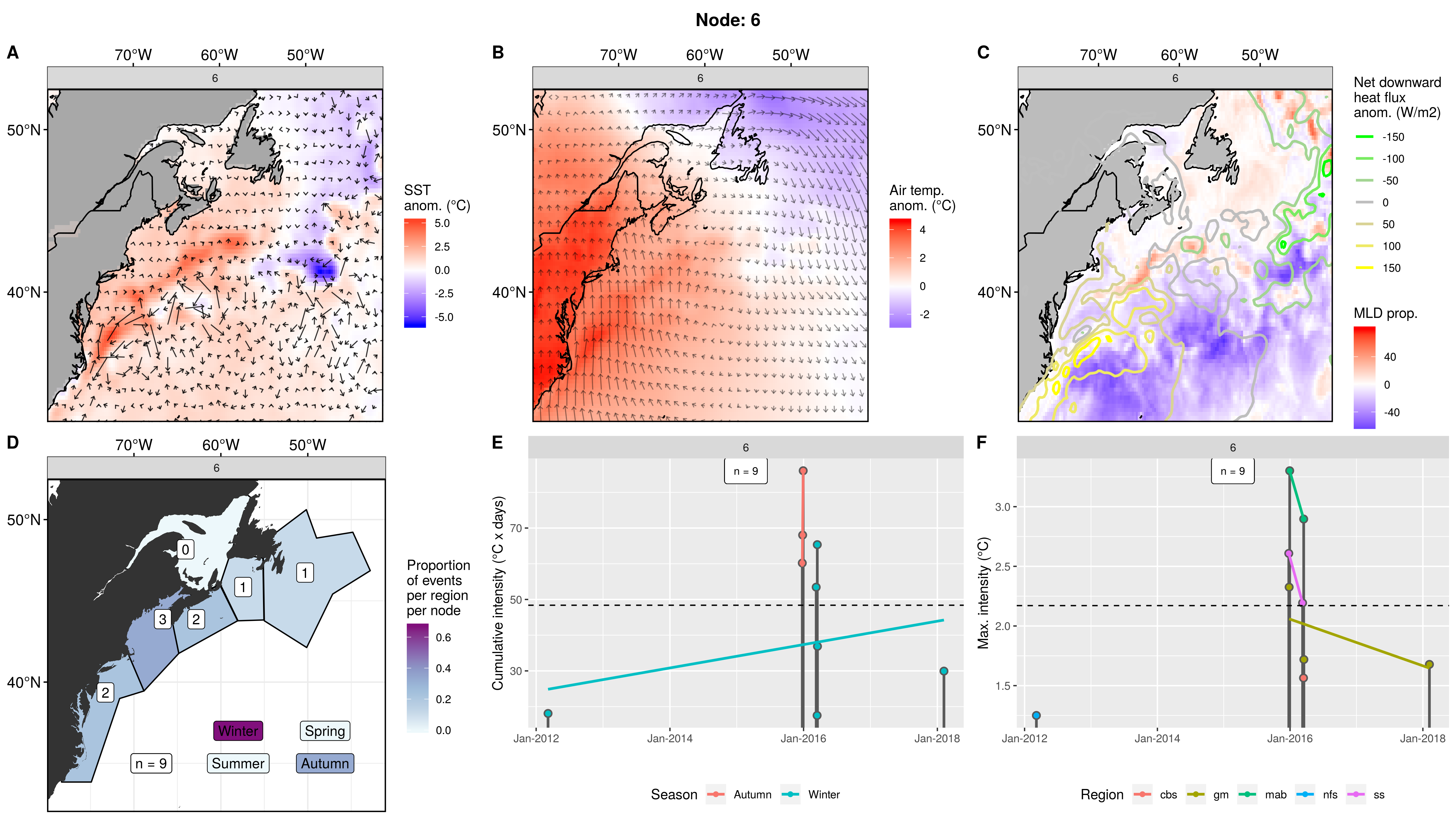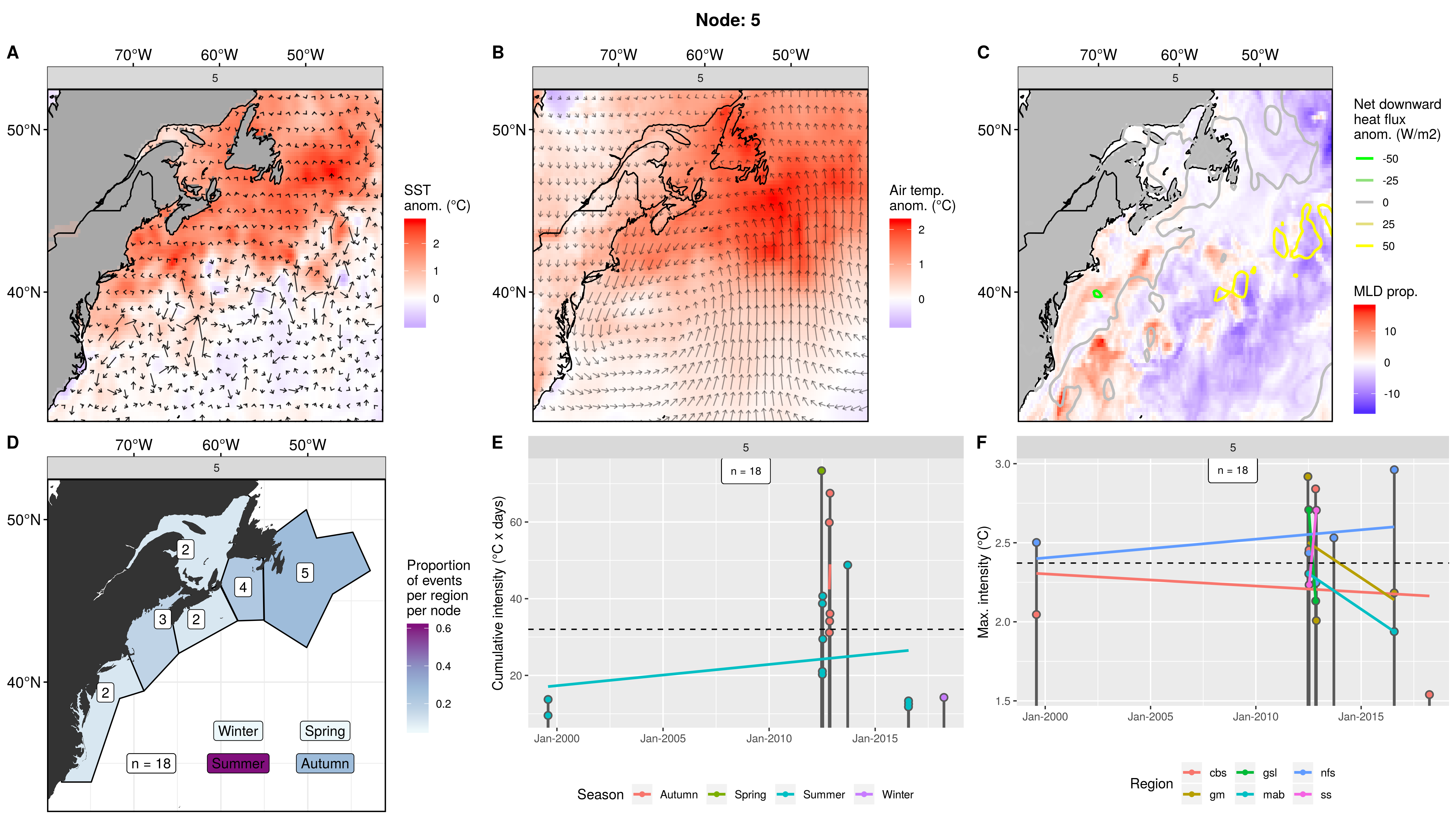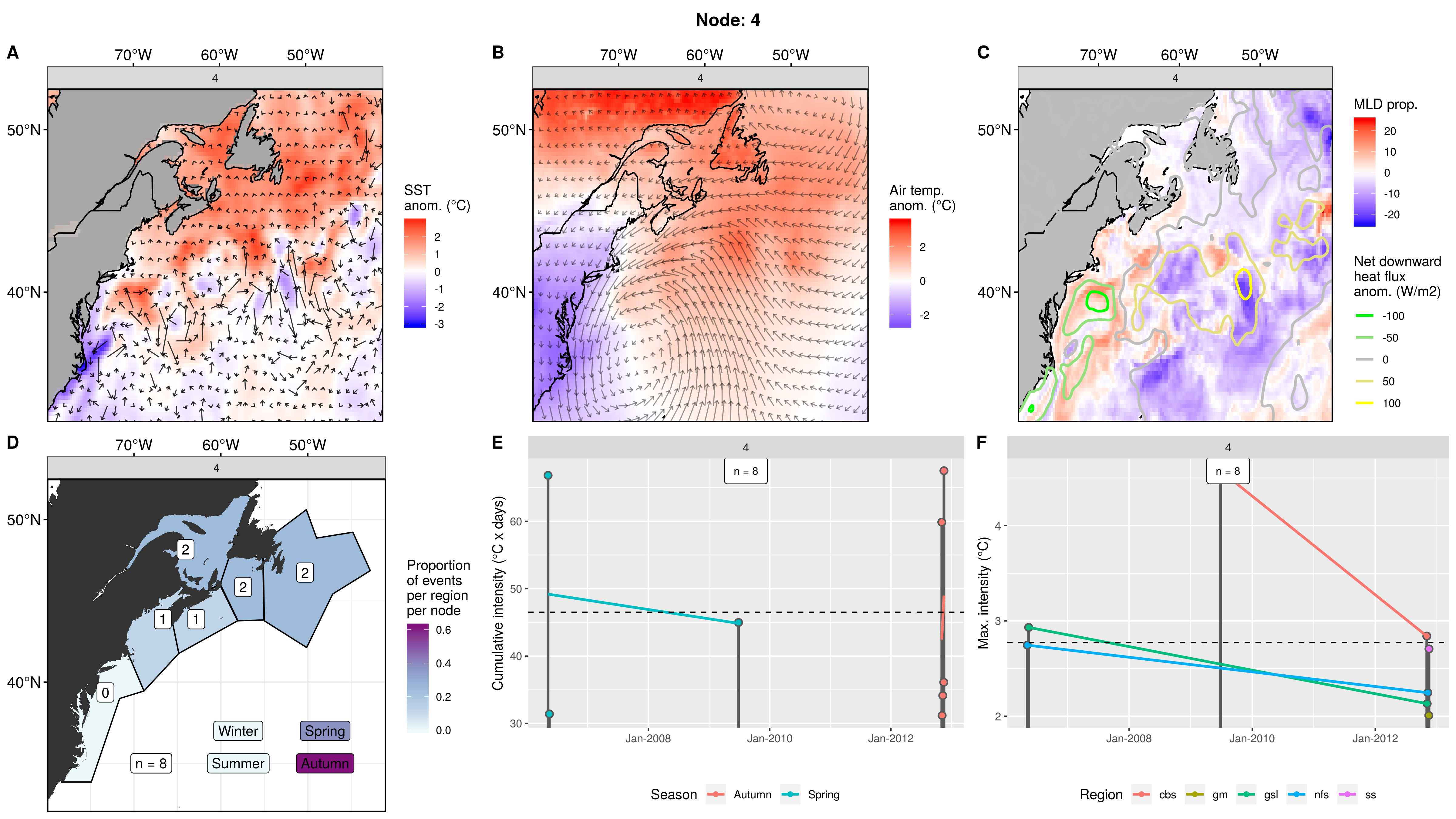 Mostly northern regions showing up as MHWs in this node, fading to 0 events in the mab. This pattern occurred only 3 times from 2006 – 2012, causing 8 MHWs. The first two occurrences were in spring. The third and last occurrence was in autumn and caused MHWs in 5 regions at once. The cumulative intensities are normal, but the max intensities are on the high end, with one being over 5C!