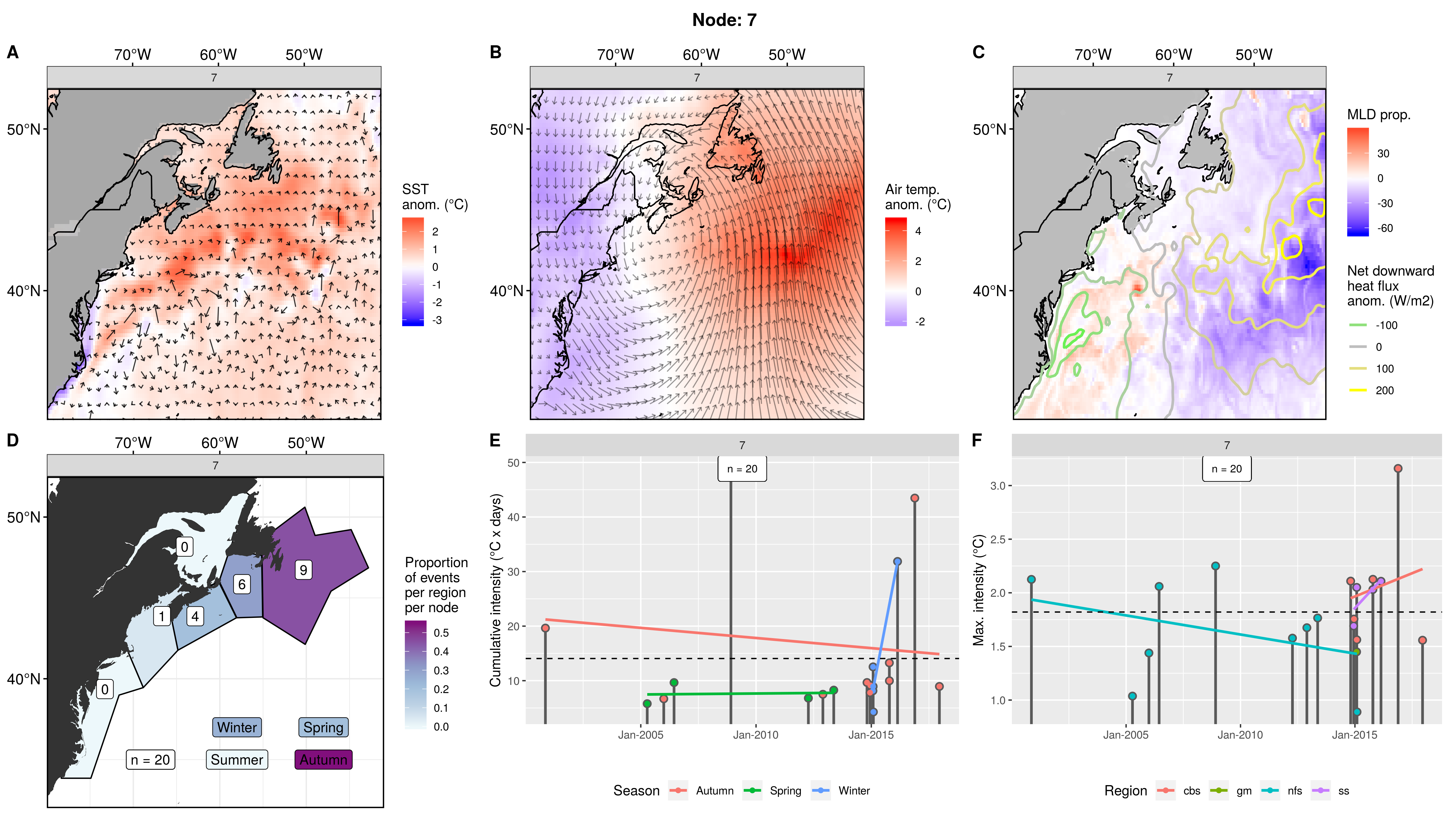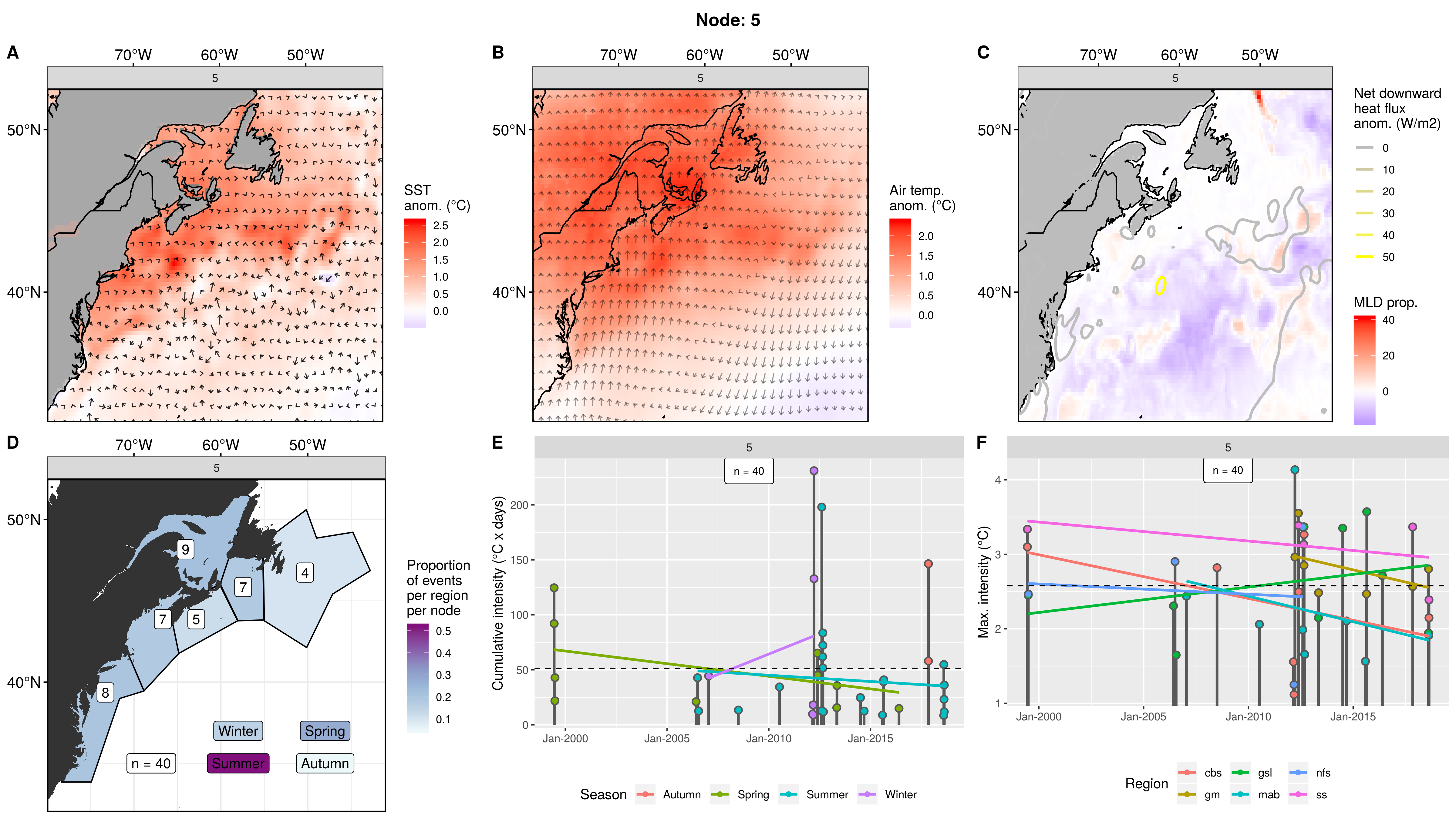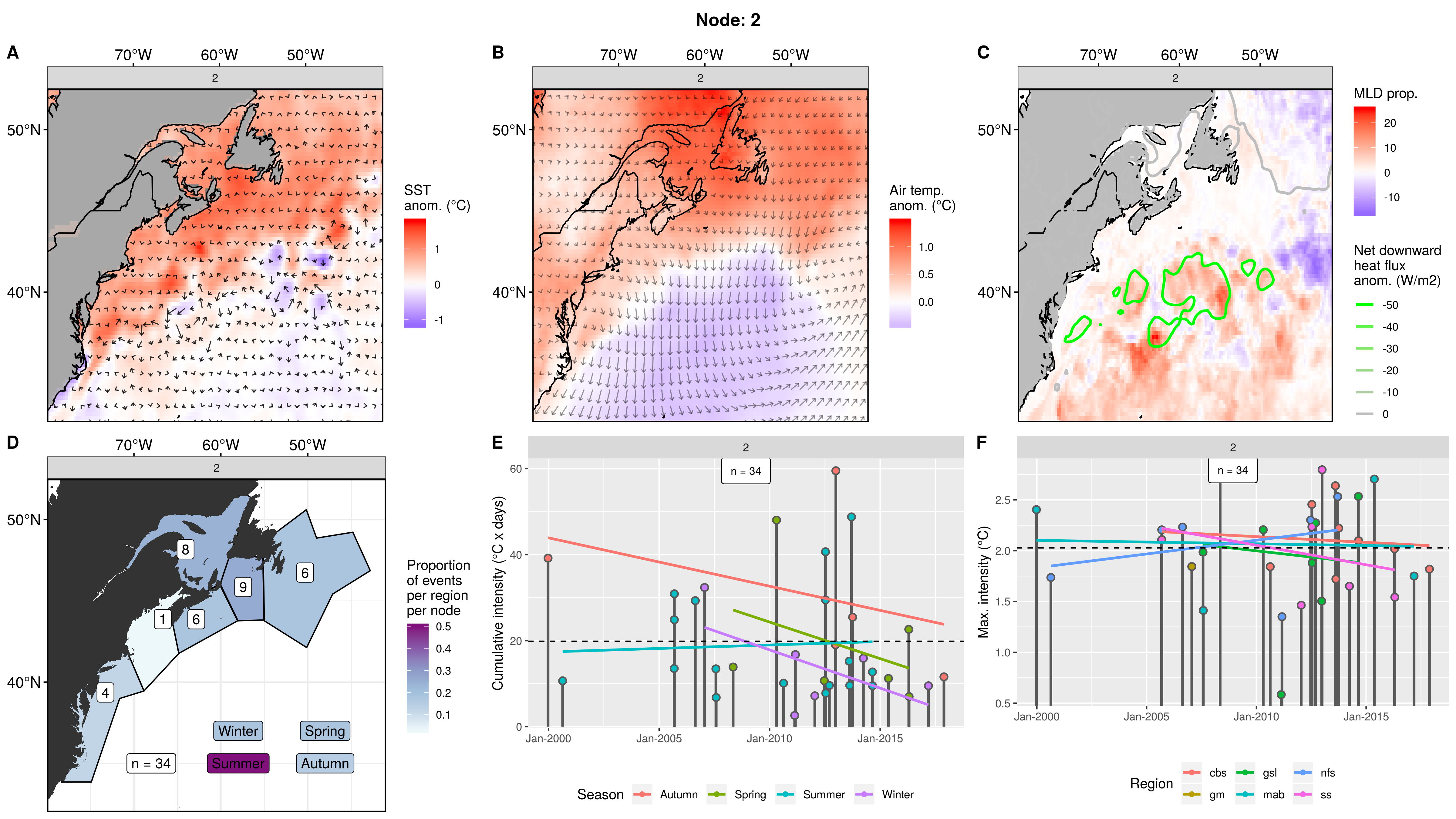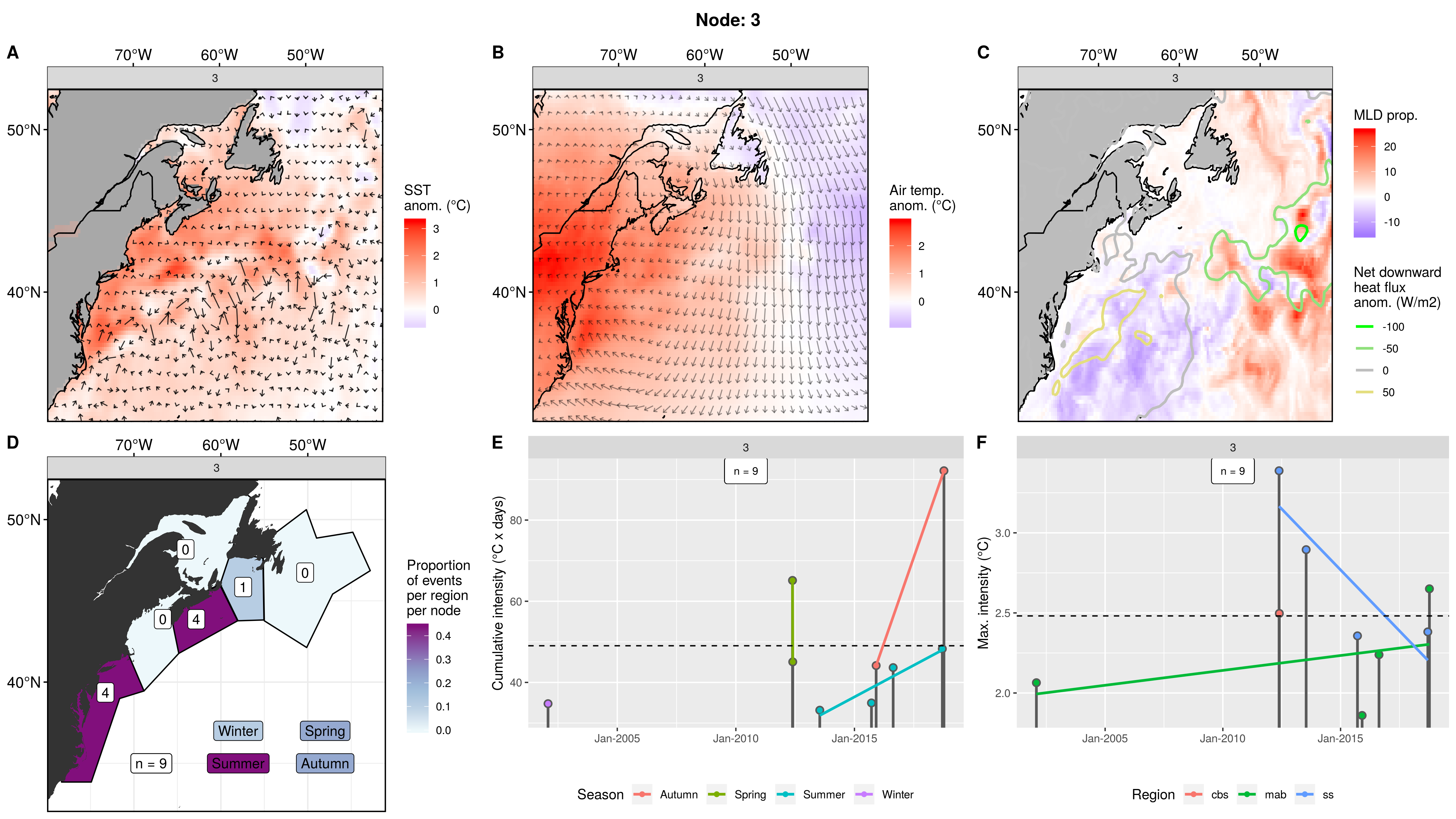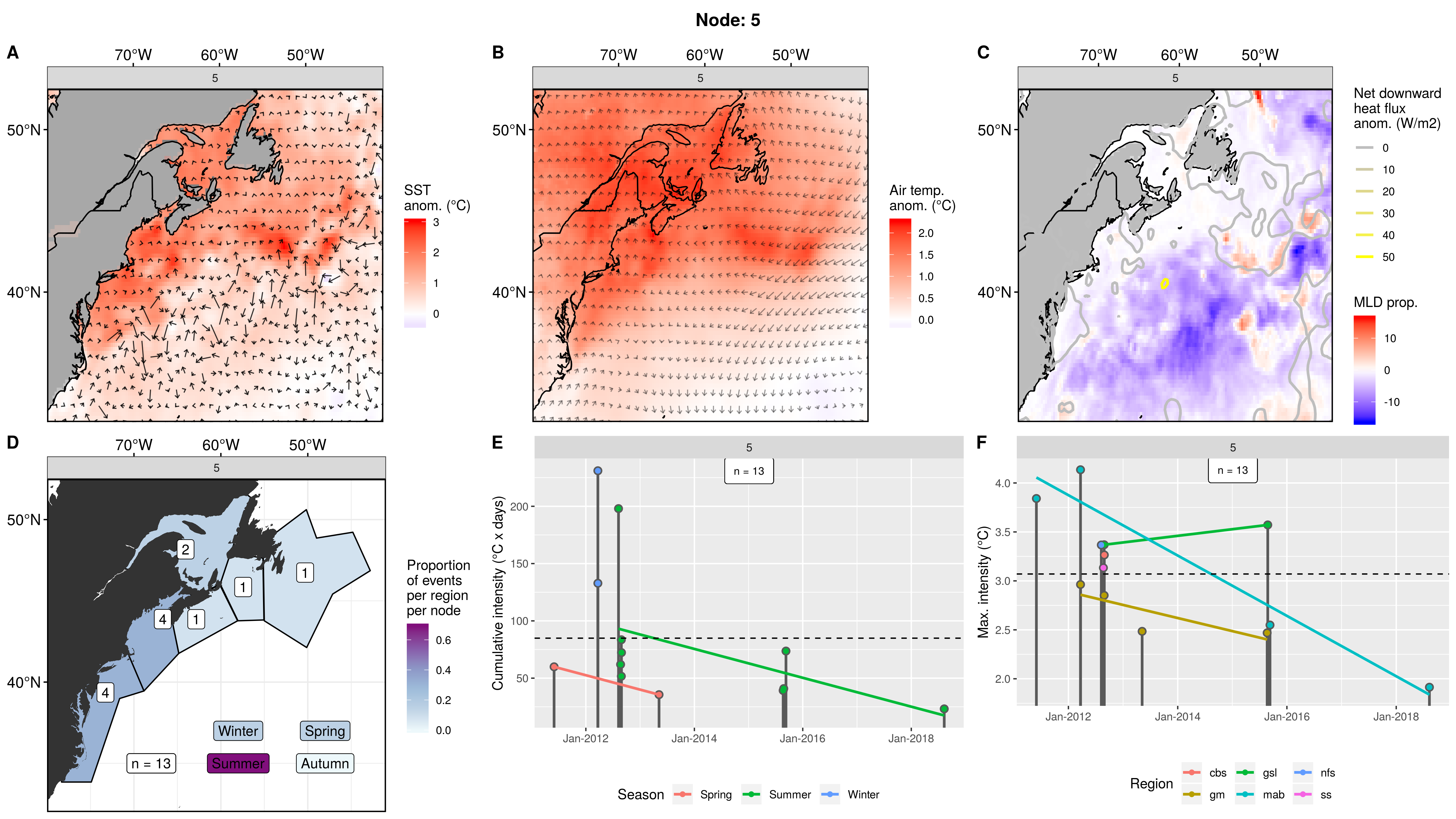 Mostly northern regions showing up as MHWs in this node, fading to 0 events in the mab. This pattern occurred only 3 times from 2006 – 2012, causing 8 MHWs. The first two occurrences were in spring. The third and last occurrence was in autumn and caused MHWs in 5 regions at once. The cumulative intensities are normal, but the max intensities are on the high end, with one being over 5C!