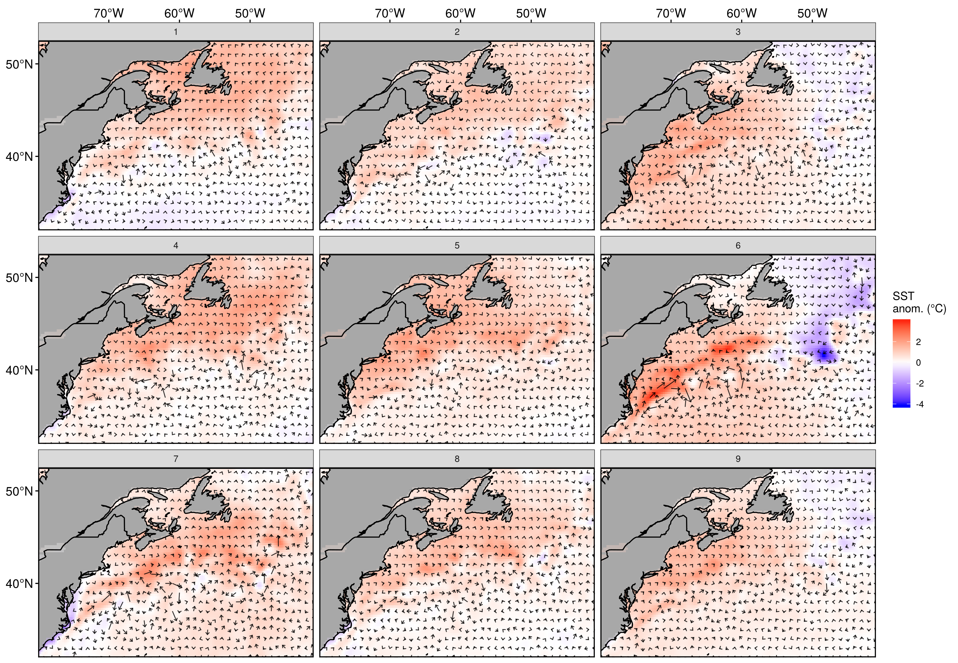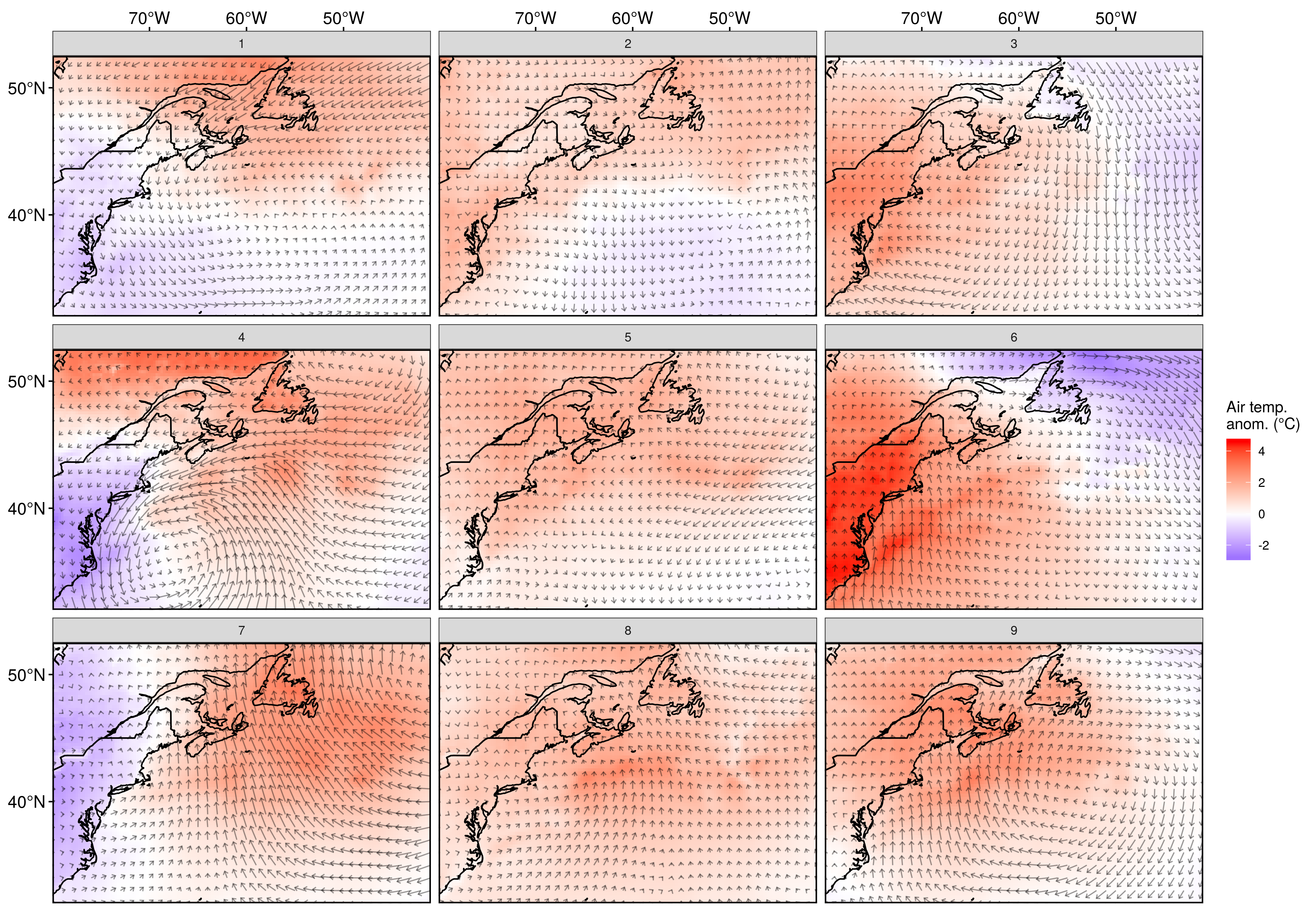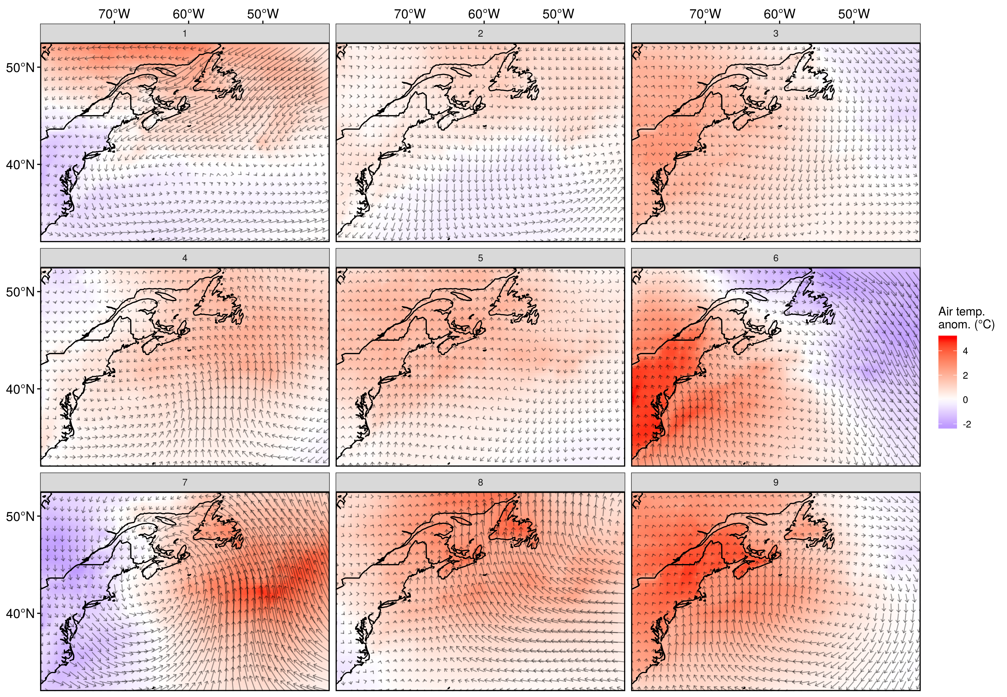 Air over the LS is cooler on the right-hand column and becomes warmer to the left. Air over the AO is cooler in the top left and generally becomes warmer the further away the nodes are from node 1. Node 7 is interesting in that it shows a strong vertical dipole with cold air over CN, US, and GS. The middle node (5) has the least amount of air movement and yet we still see the vague traces of warm air moving north and cold air moving south. Node 1 shows some sort of crazy warm wind pumping south from over the LS pushing cold air down the US coast then out over the AO. Nodes 3, 6, and 9 show vaguely similar anticyclones exchanging hot air up the coast and cold air down. The pattern is strongest in the middle node (6) and the centre of the cell moves to the east as one moves down the column. Node 8 is similar to node 9 but with the cell moved even further east. Node 7 shows a strong cyclone with a thermal dipole between land and sea, with a very warm air anomaly over the AO/LS. Node 4 almost looks like two opposite rotating wind cells coming together over the AO to push warm air anomalously northwards.