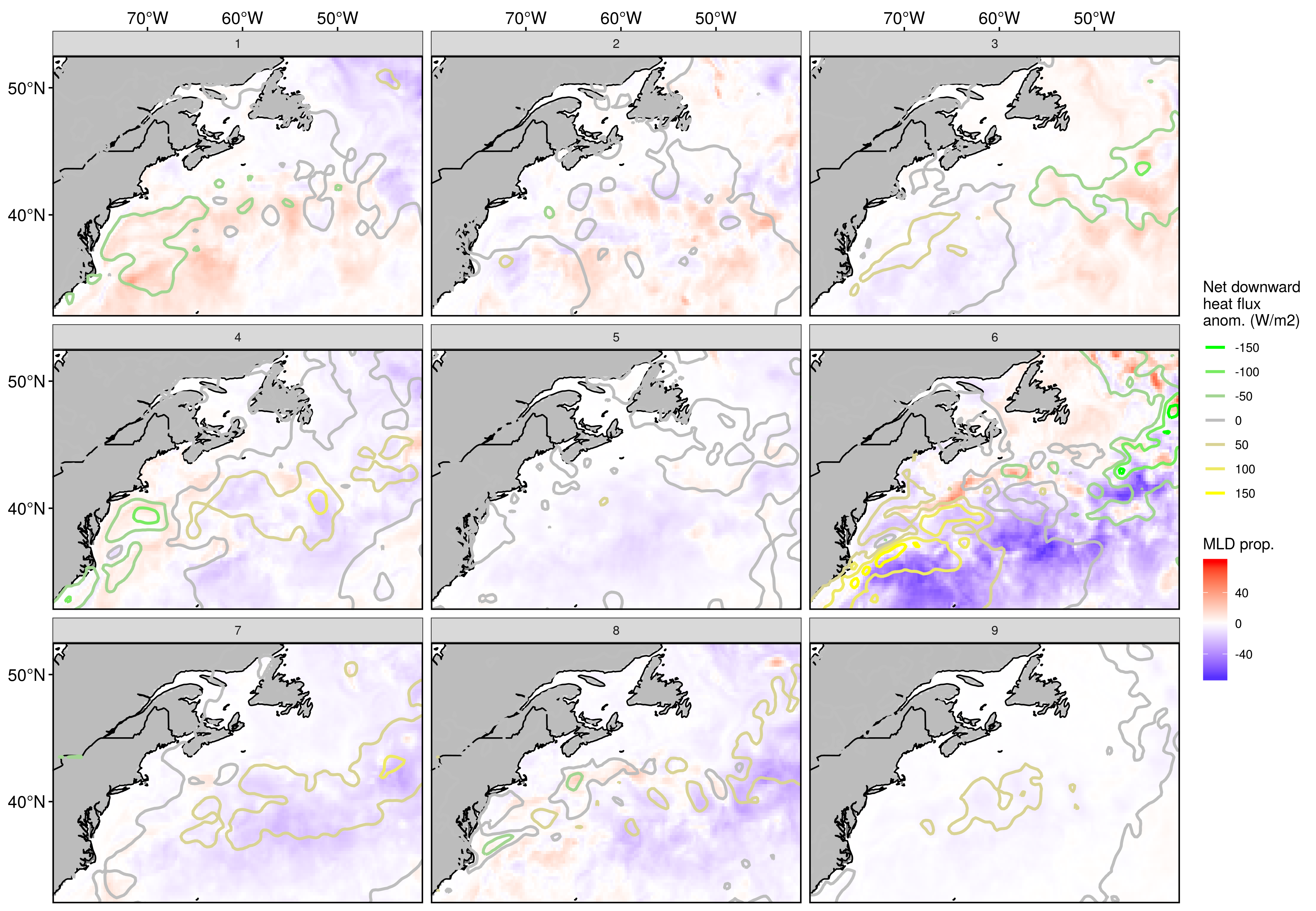 The similarities between these nodes and the default 3x3 results persist, but the MLD anomalies for nodes 1 + 2 are a bit different around the GS as it moves across the study area. The general pattern across the nodes is that the left-hand column has a positive MLD anomaly over the GS with a negative heatflux, while showing a negative MLD anomaly over the LS and AO with a positive heatflux term. This pattern is muted in the middle column, and reversed in the right-hand column.Node 8 looks like it would better be swapped with node 7, so there must be some other more important variable at play here. Node 9 in particular shows very little anomalies for either MLD or heatflux.