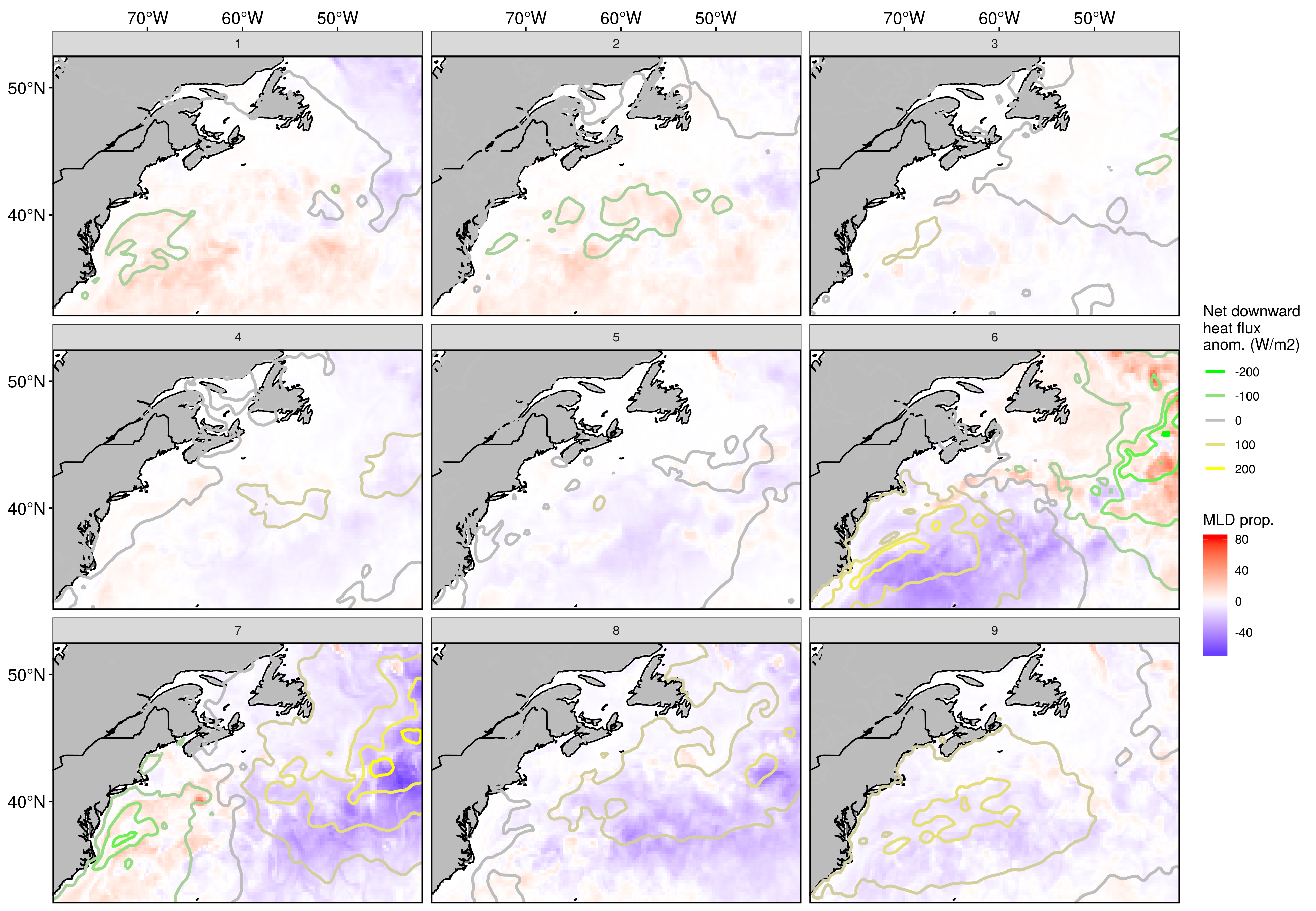 The top left node (1) shows a decent negative heatflux anomaly over a deep MLD in the GS + AO, while a bit shallow and weakly positive over the LS. This flips over to the opposite as we move diagonally down to the bottom right node (9). Node 7 has a very deep GS with a very strong negative heatflux while showing a shallow AO + GS with a very strong positive heatflux. The opposite of node 7 may be seen in node 6.