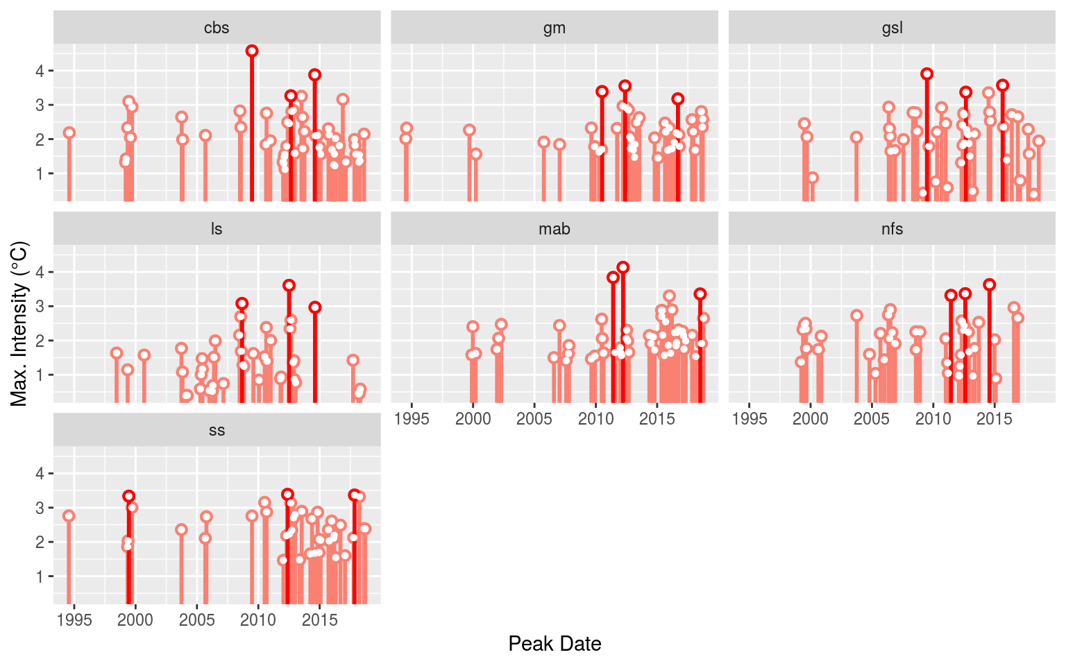 labs(x = "Peak Date", y = "Max. Intensity (°C)") +