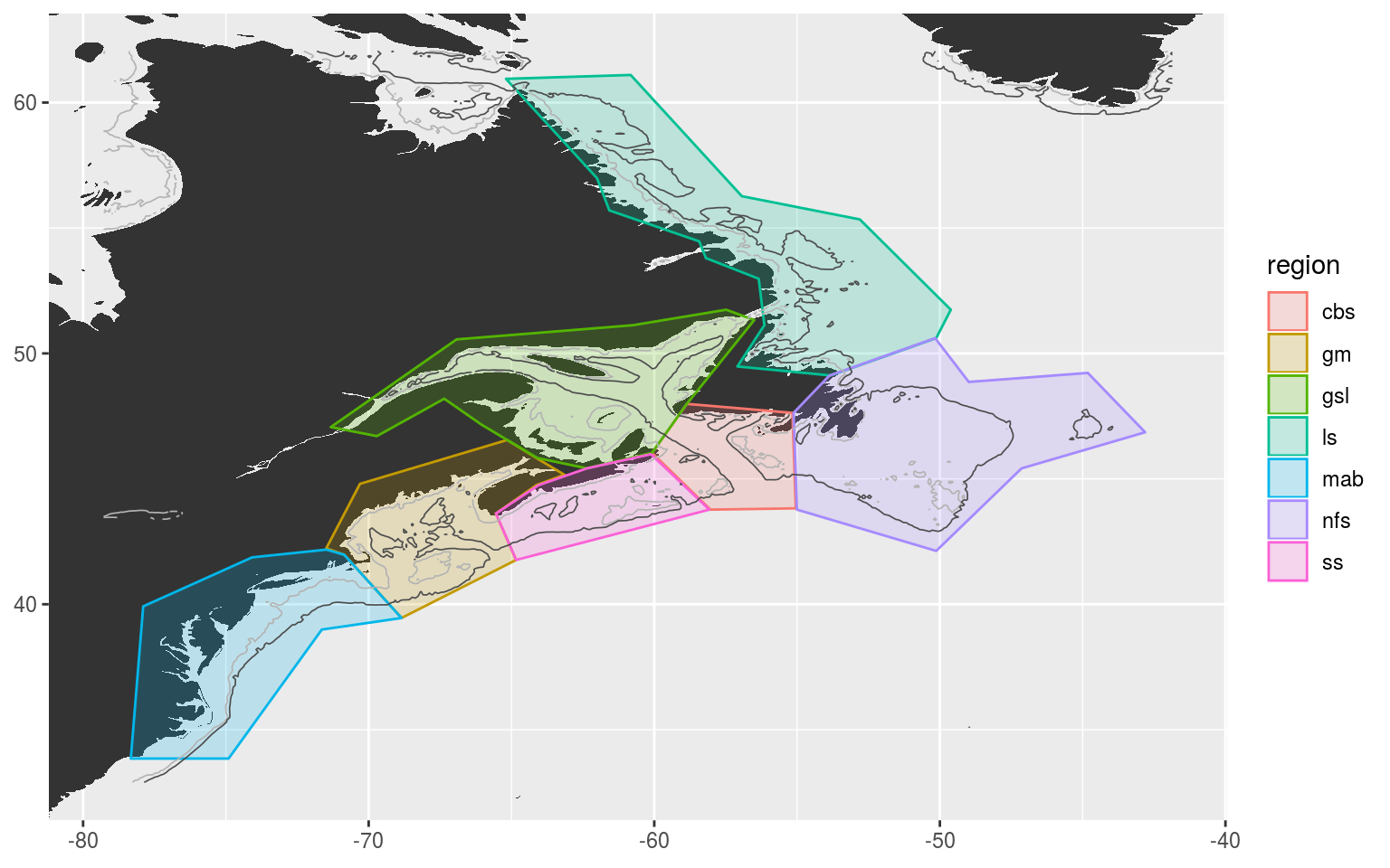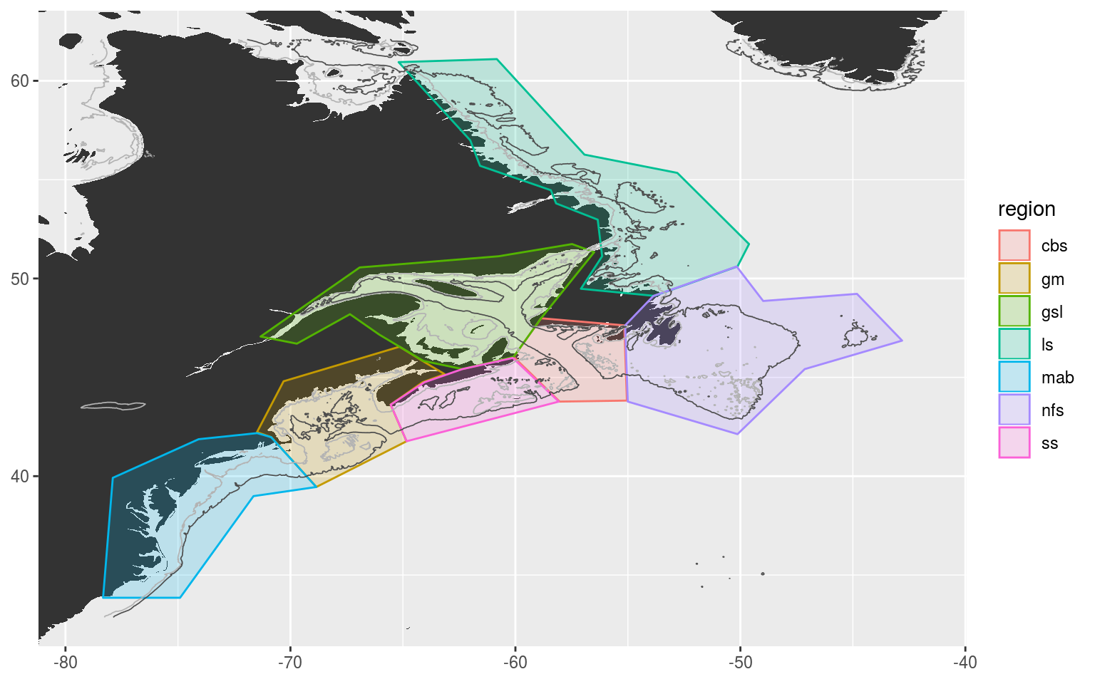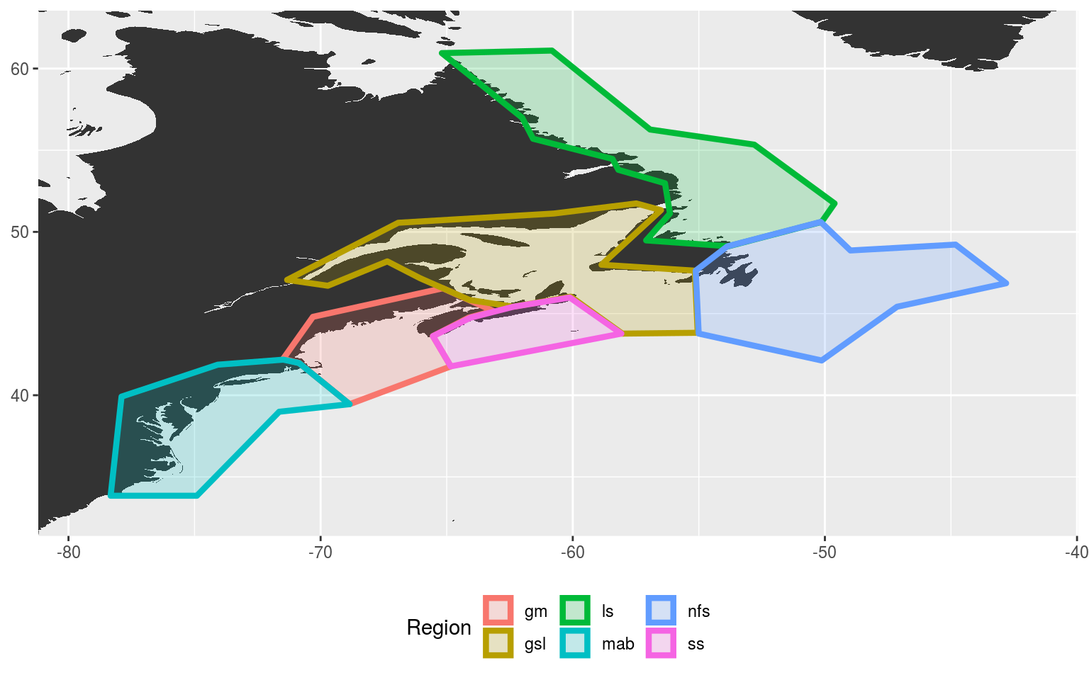 The region abbreviations are: “gm” for Gulf of Maine, “gls” for Gulf of St. Lawrence, “ls” for Labrador Shelf, “mab” for Mid-Atlantic Bight, “nfs” for Newfoundland Shelf and “ss” for Scotian Shelf.