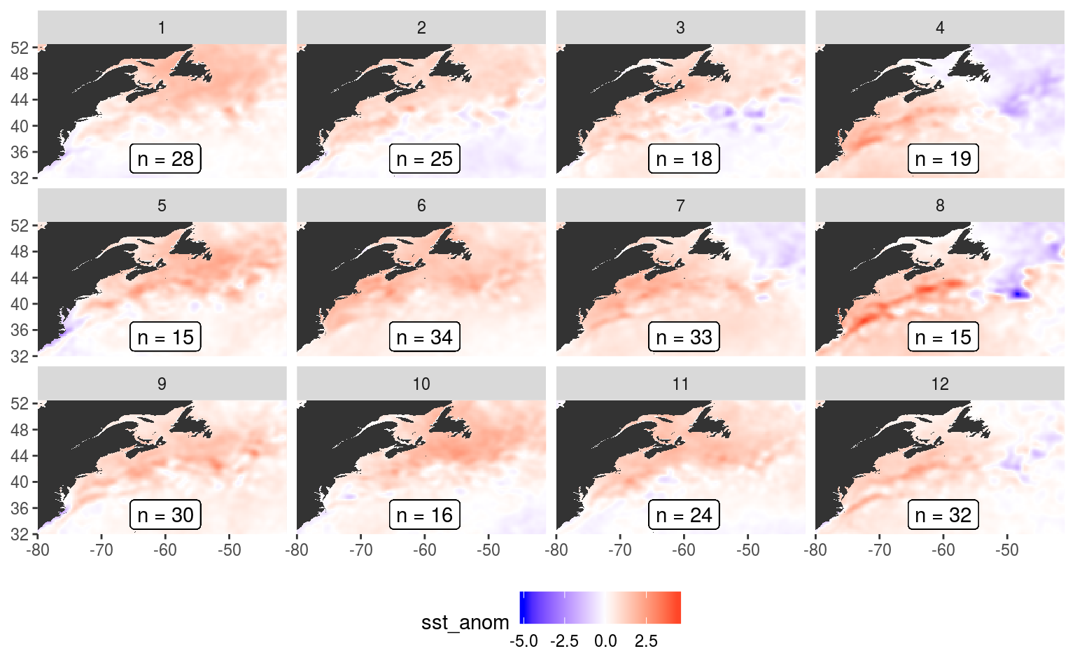 Juggling back and forth between the SST anomaly photos with and without the Gulf of St Lawrence it first appears that they are very different, but this is mostly due to the top and bottom rows of nodes being flipped. The actual differences are much more muted and the patterns tend to hold. The patterns appear more crisp in the larger of the two study extents. This is likely because the inclusion of the shallow GSL gives more power to the atmospheric variables to compete with the Gulf Stream. For this reason we are going to proceed with the inclusion of the Gulf of St Lawrence.