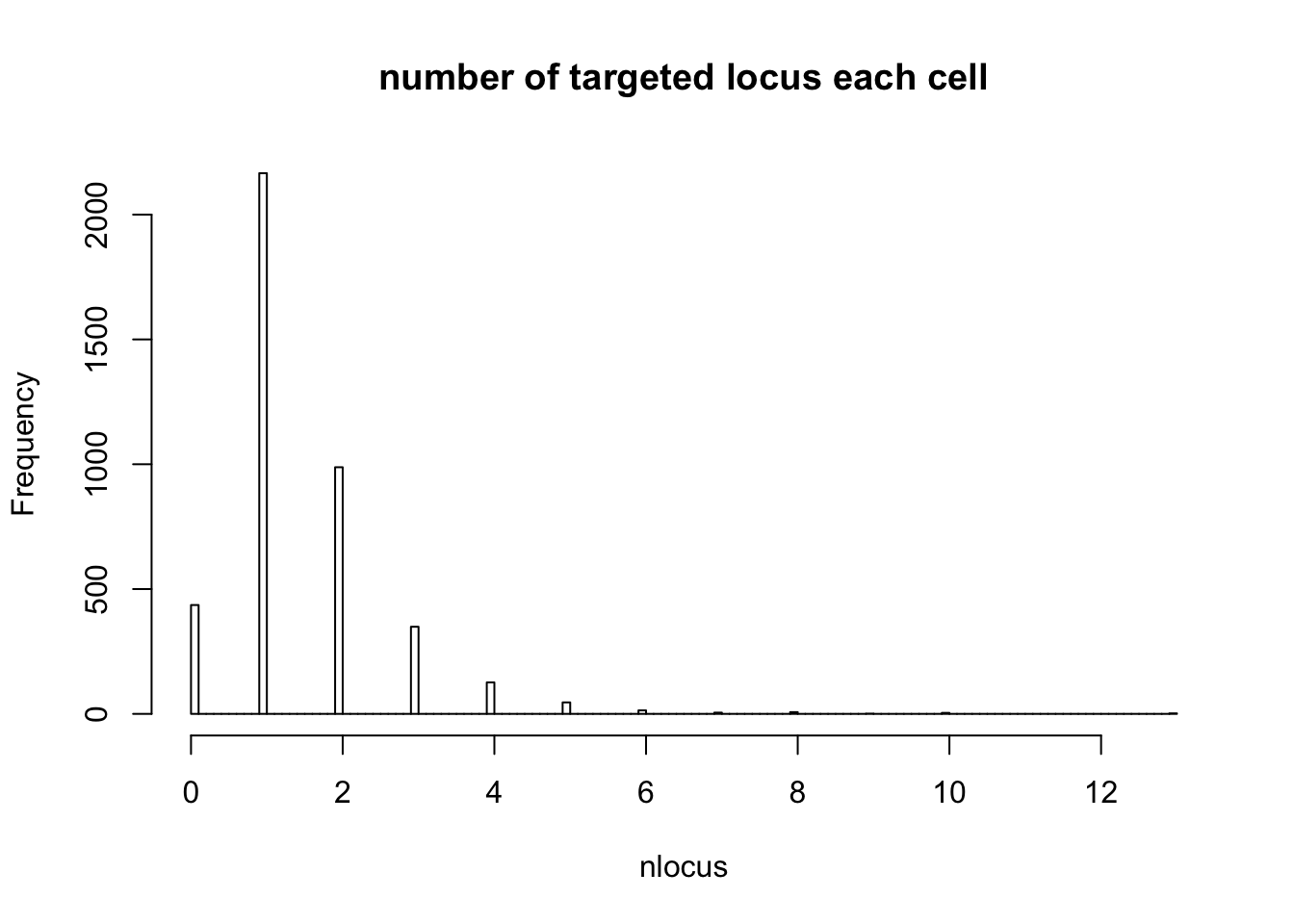 hist(nlocus,breaks=100, main="number of targeted locus each cell")