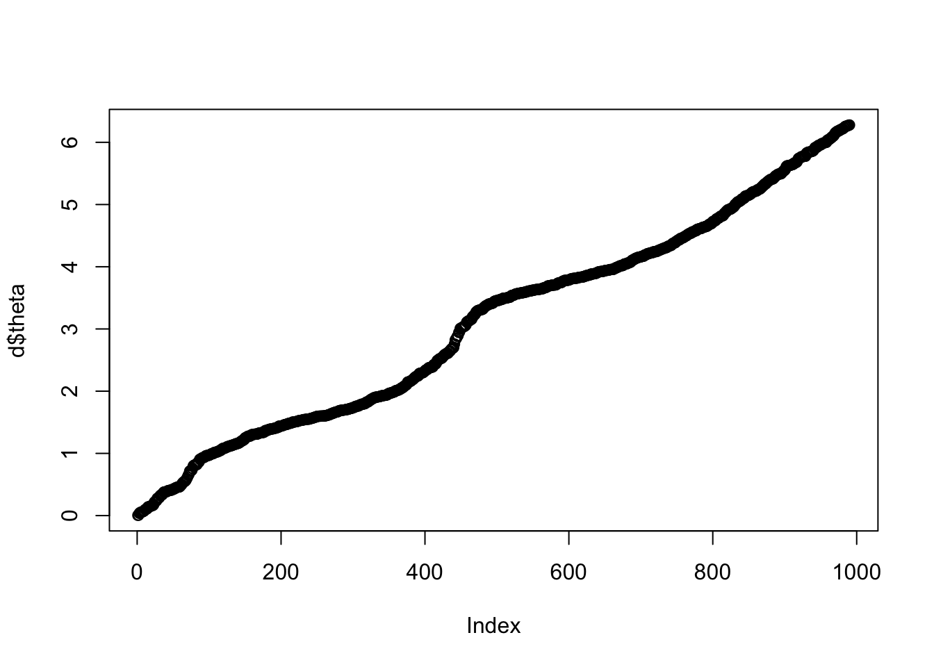 dim(d)[1] 990  11Recall each row is a single cell. The first column (“theta”) is an estimate of where that cell is in the cell cycle, from 0 to 2pi. (Note that we don’t know what stage of the cell cycle each point in the interval corresponds to - so there is no guarantee that 0 is the “start” of the cell cycle. Also, because of the way these data were created we don’t know which direction the cell cycle is going - it could be forward or backward.) Then there are 10 columns corresponding to 10 different genes.