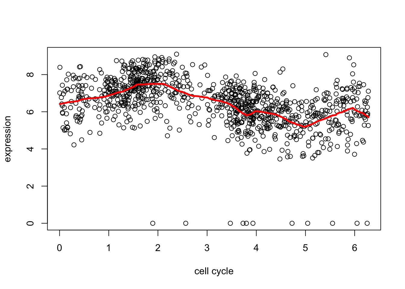Since R version 3.2.0, base's rbind() should work fine with S4 objectsd2.tf.cv = cv.trendfilter(d2.tf) # performs 5-fold CVFold 1 ... Fold 2 ... Fold 3 ... Fold 4 ... Fold 5 ... plot(d[,1],d[,2],xlab="cell cycle",ylab="expression")