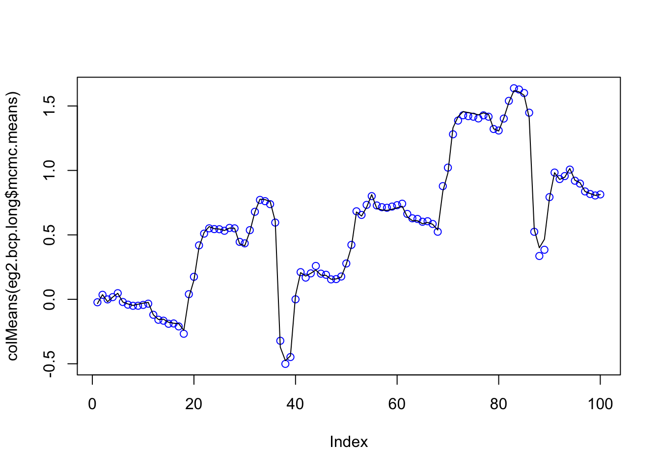 lines(eg1.bcp$posterior.mean, col = 4, lwd = 2)