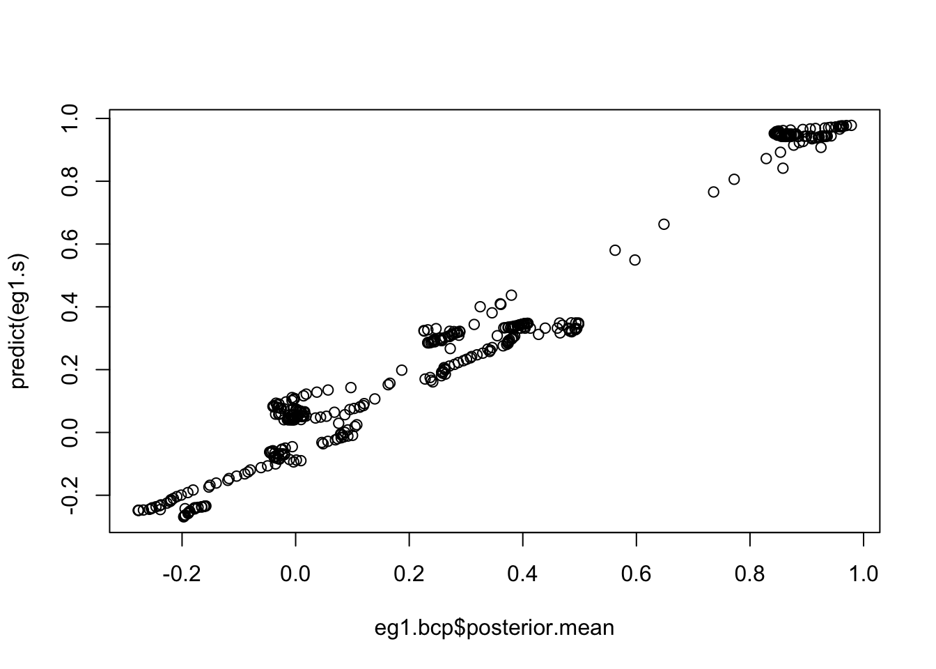 plot(eg1.bcp$posterior.mean, predict(eg1.s))