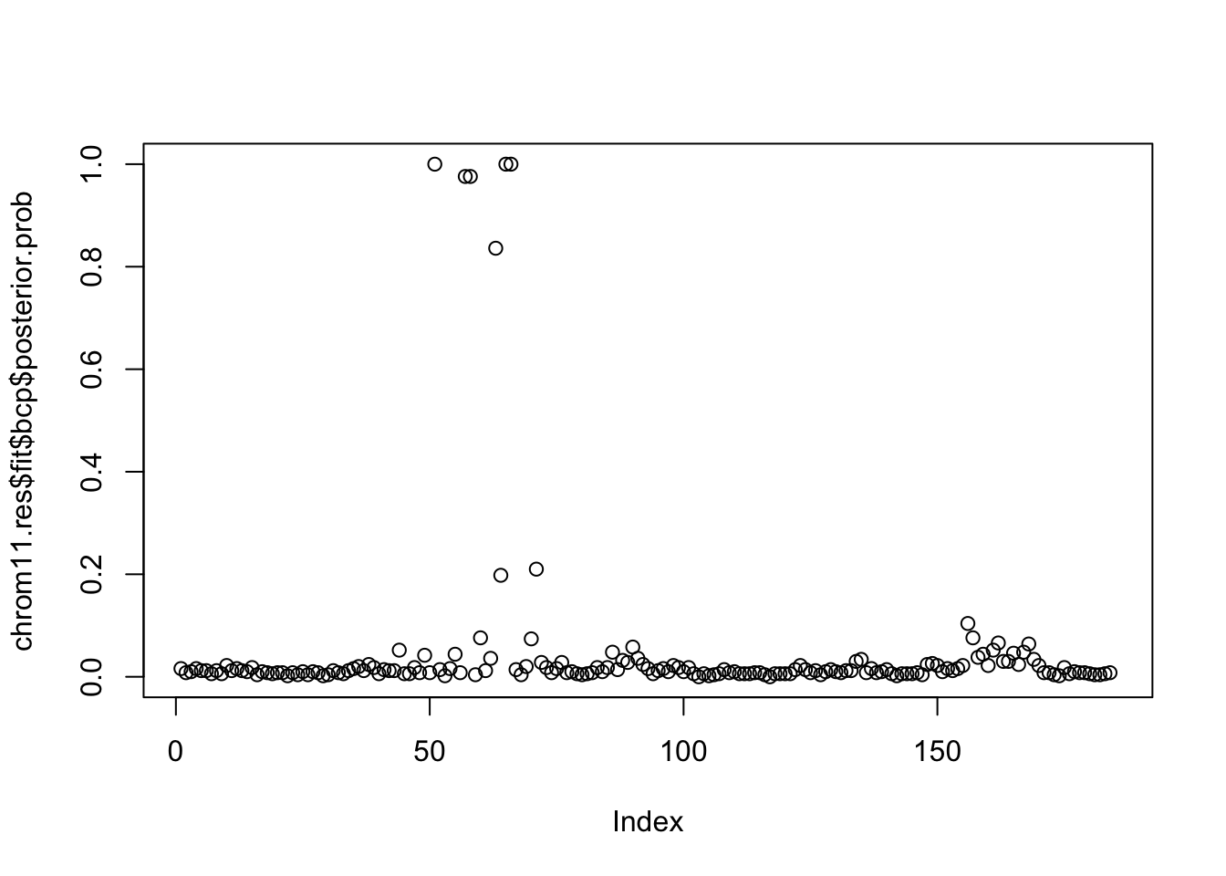 plot(chrom11.res$fit$bcp$posterior.prob)