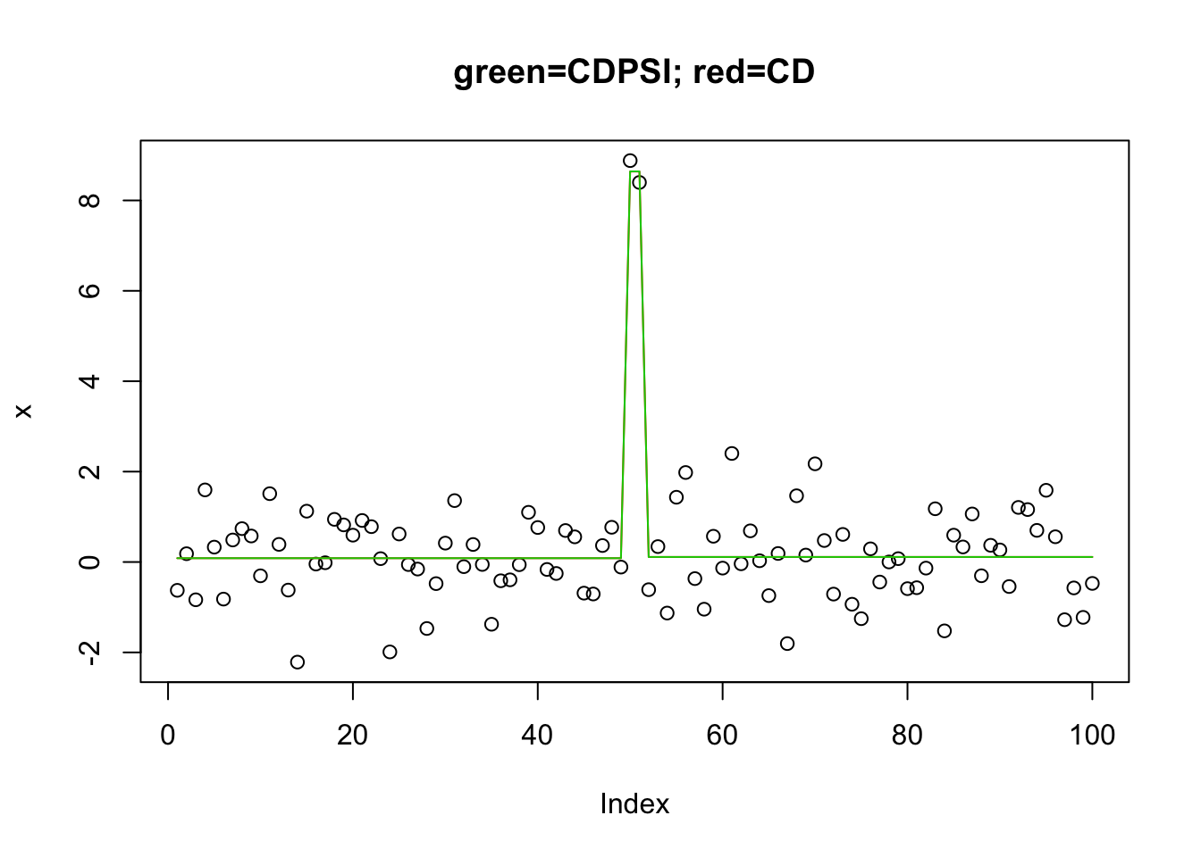 Note that the more sophisticated CSPSI algorithm does not find the correct solution here because it does not give 2 changepoints - all solutions have at least 4 changepoints. I guess it might be possible to solve this by playing with the penalty?