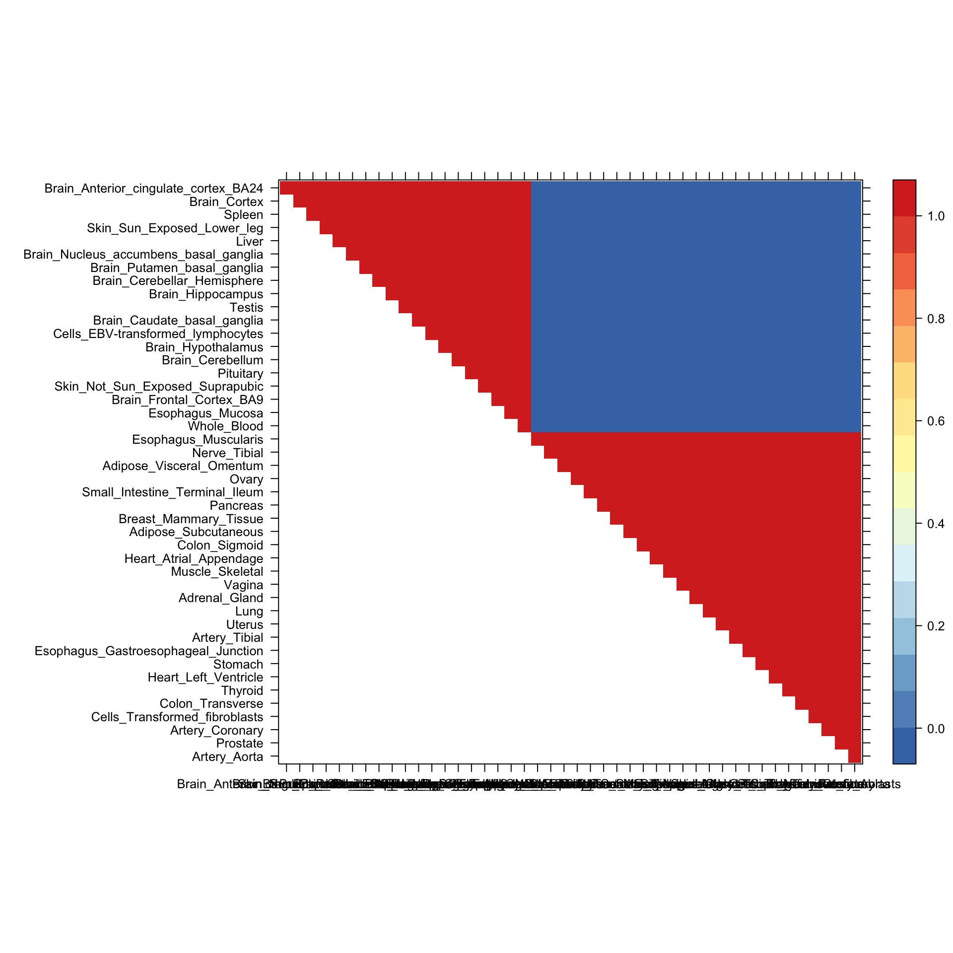 Here we plot the correlation matrix for the fourth covariance component, which captures some effects that are stronger in Whole Blood than other tissues.