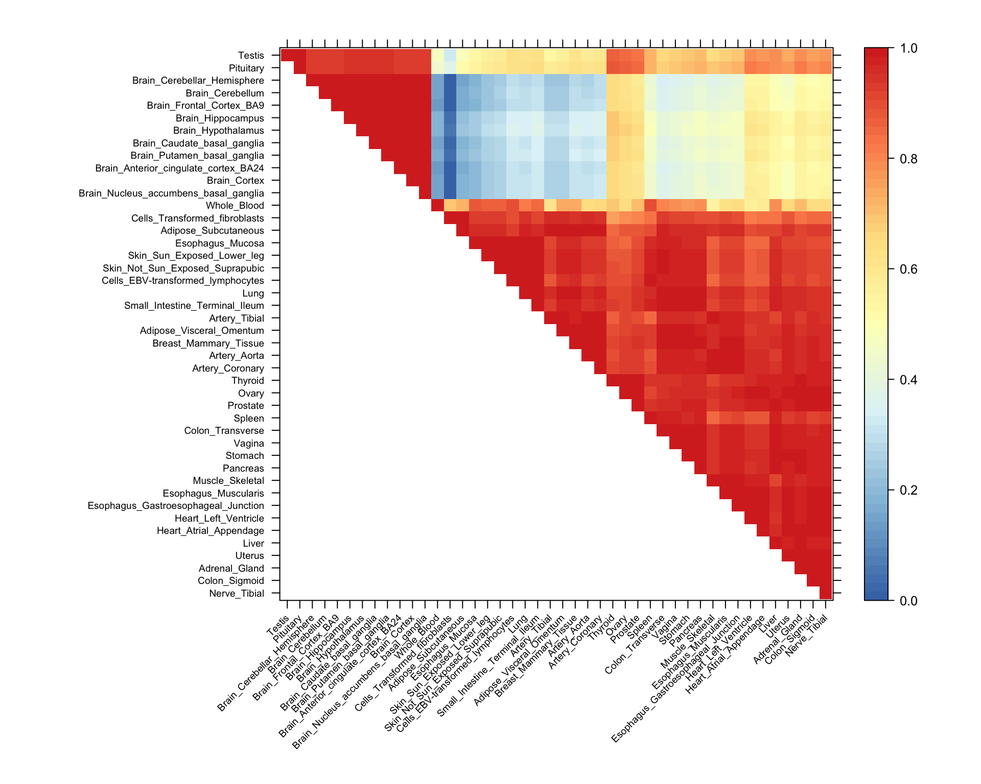 The first eigenvector reflects broad sharing among tissues, with all effects in the same direction; the second eigenvector captures differences between brain (and, to a less extent, testis and pituitary) vs other tissues; the third eigenvector primarily captures effects that are stronger in whole blood than elsewhere.